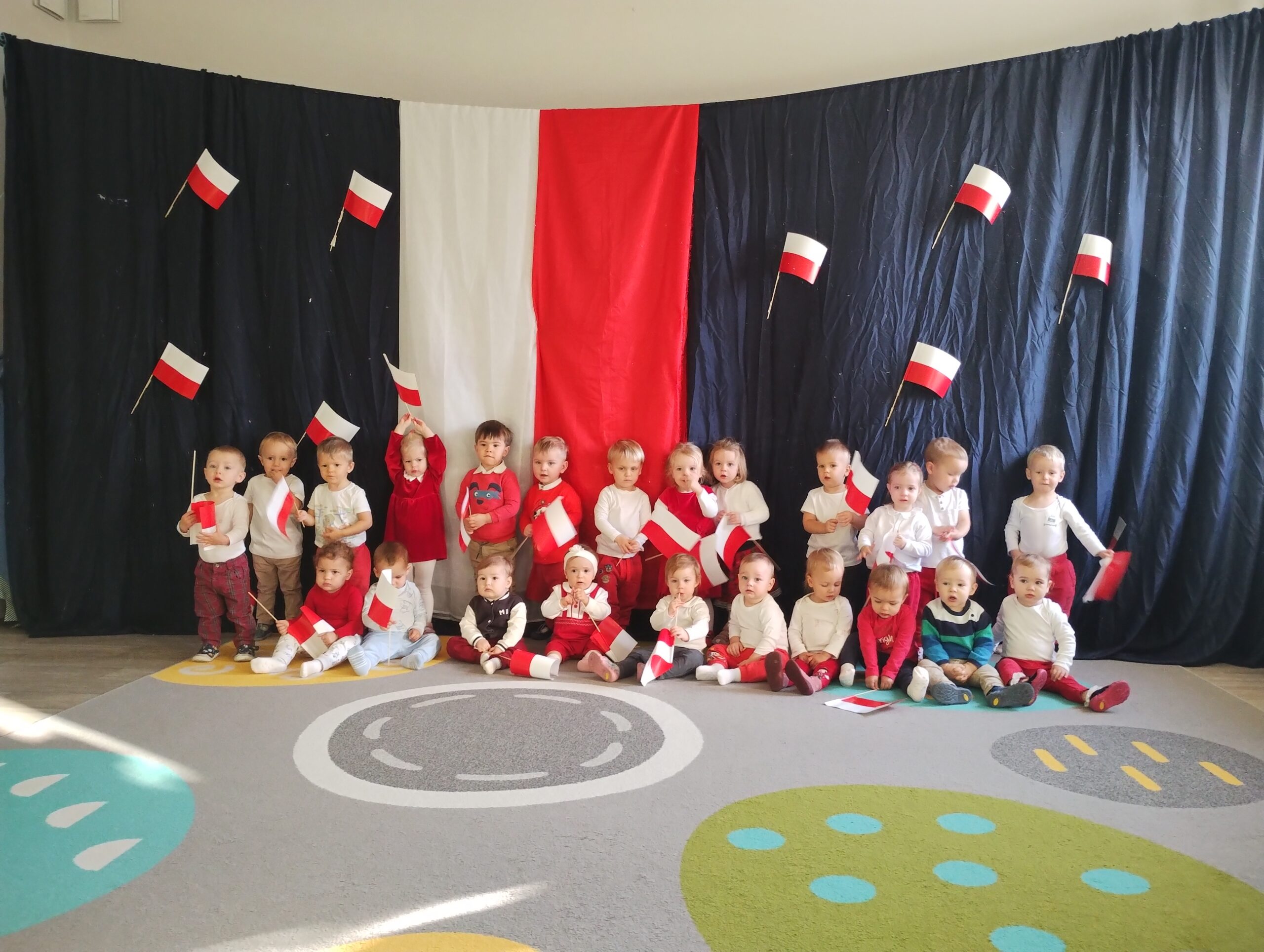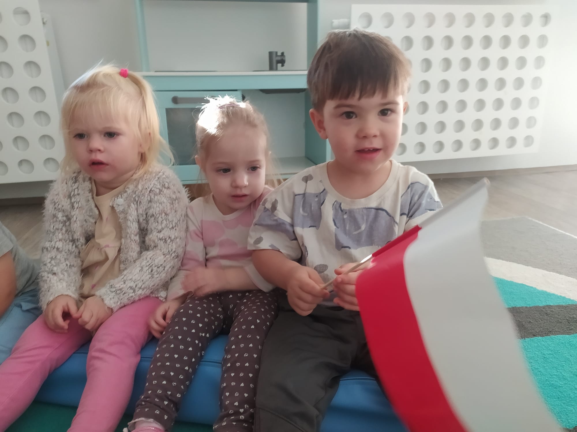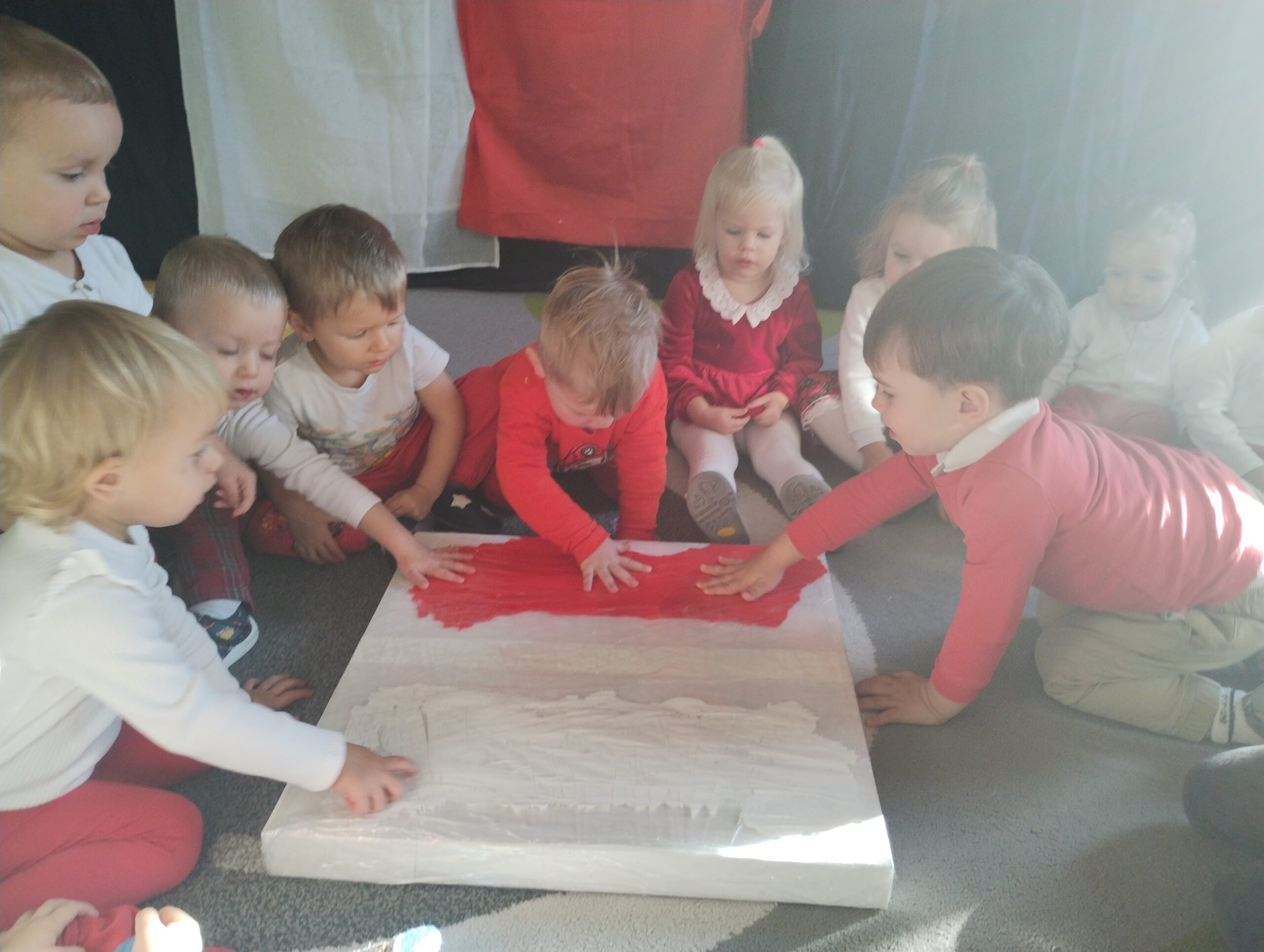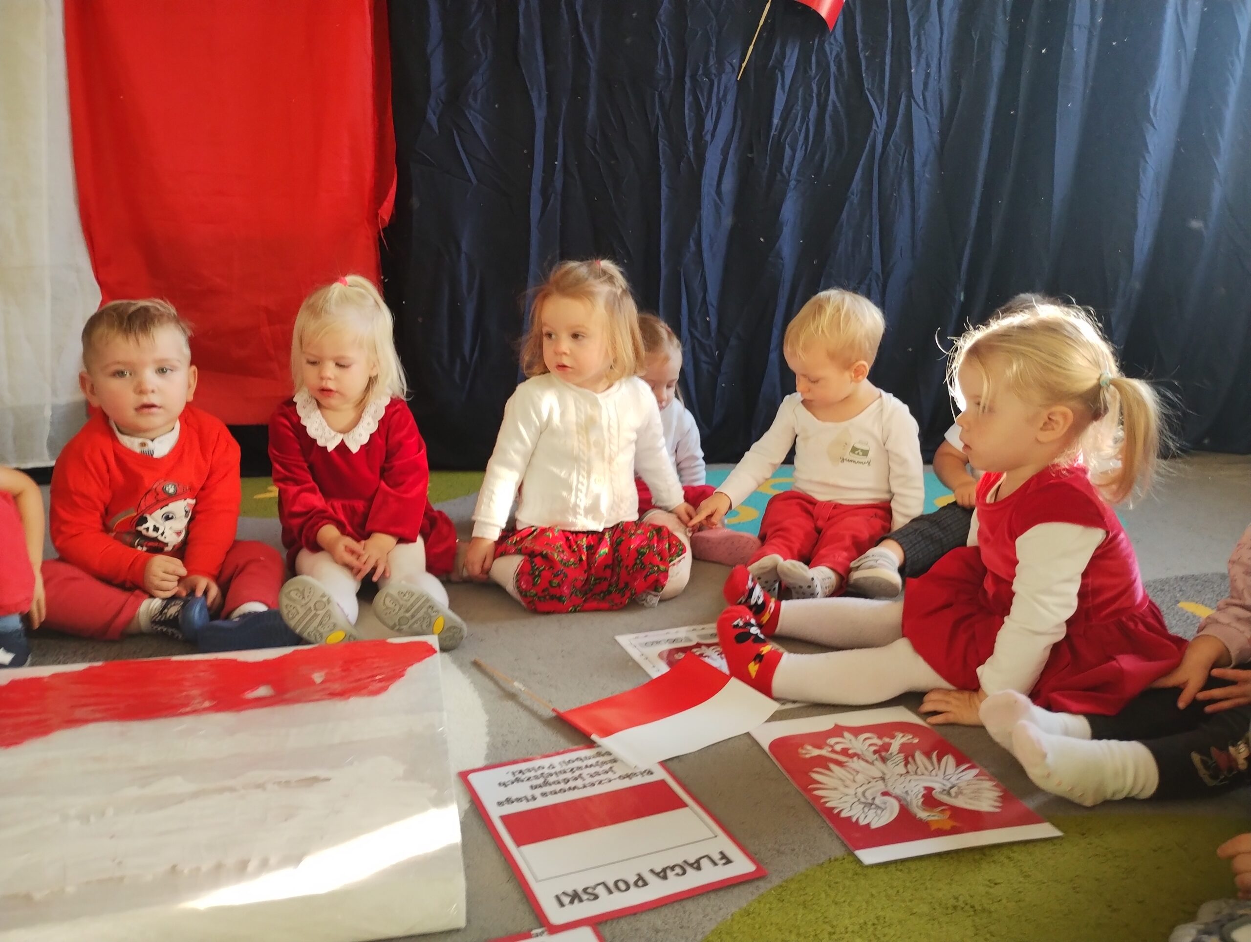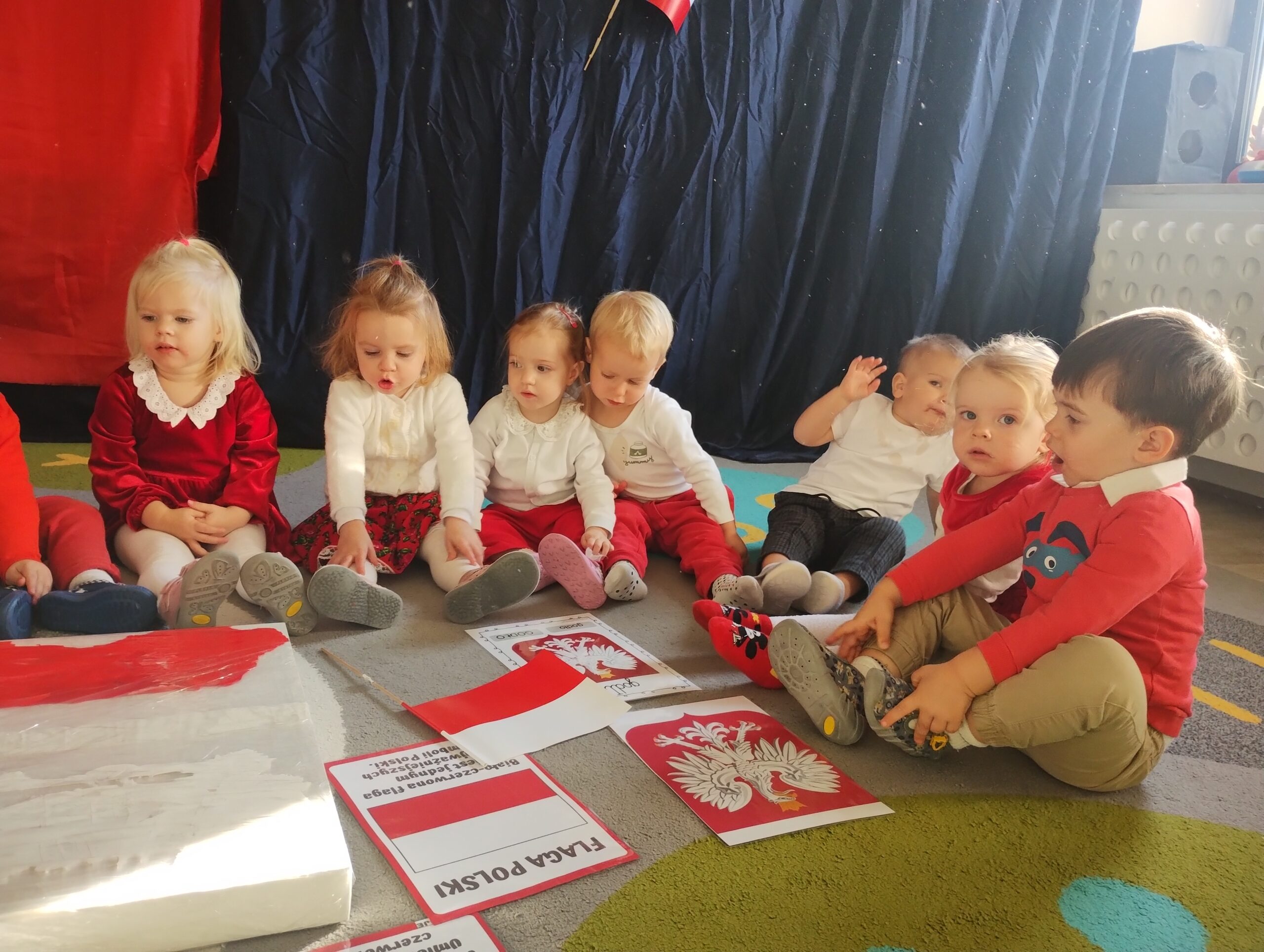 W poprzednim tygodniu dzieci wysłuchały krótkiej rozmowy na temat naszego kraju- Polski. Opowiadały gdzie mieszkają i próbowały nazwać symbole narodowe. Wspólnie obejrzeliśmy ilustracje przedstawiające flagę, godło i mapę Polski. Maluszki dowiedziały się, że flaga ma dwa kolory- biały i czerwony, a na godle znajduje się biały orzeł. Następnie dzieci z powagą wysłuchały fragmentu hymnu narodowego, ucząc się, że podczas jego jego odtwarzania należy zachować postawę szacunku. Podczas zajęć plastycznych wykonaliśmy piękne flagi. Nie zabrakło też zabaw sensorycznych i ćwiczeń motoryki małej.