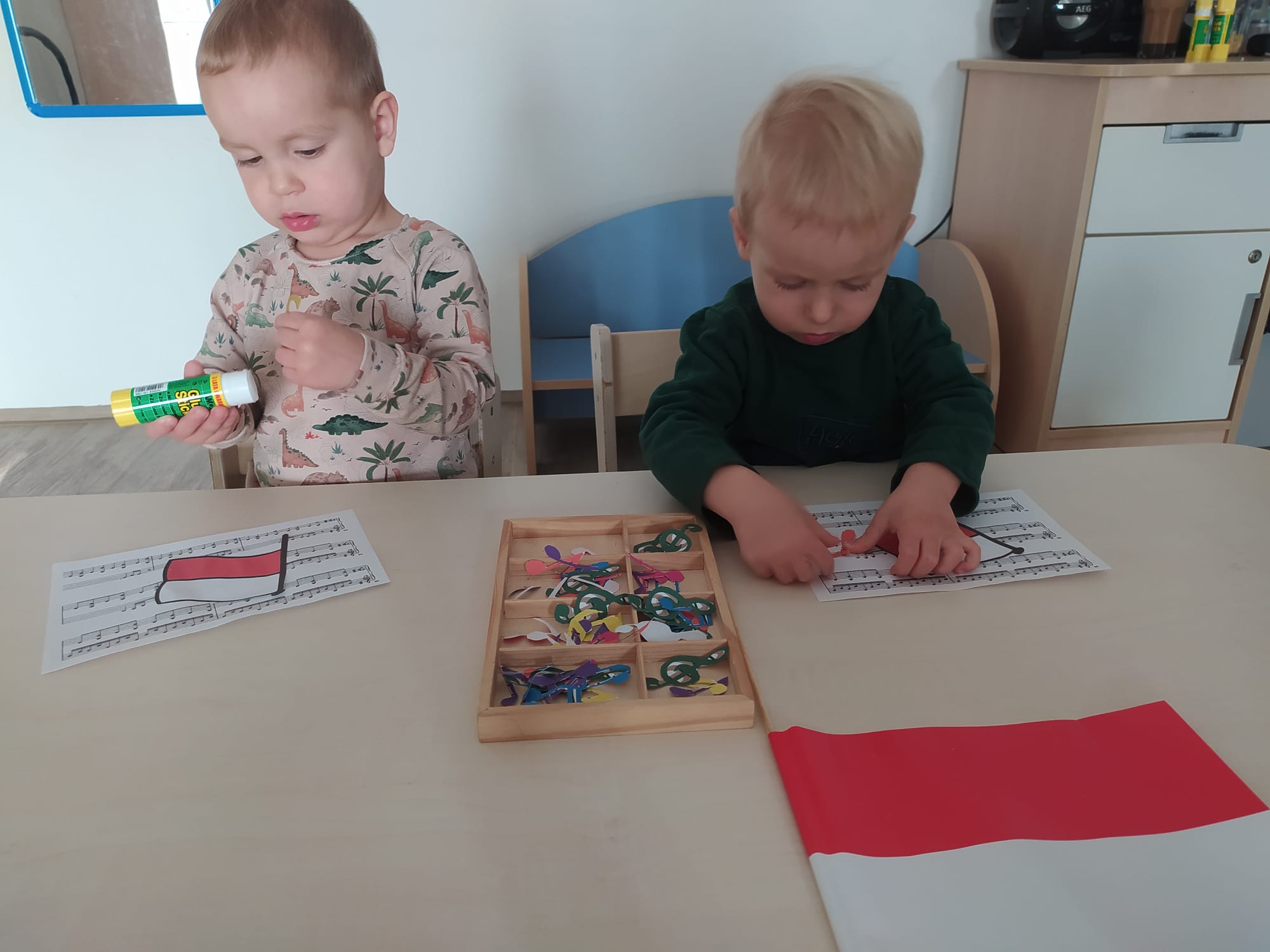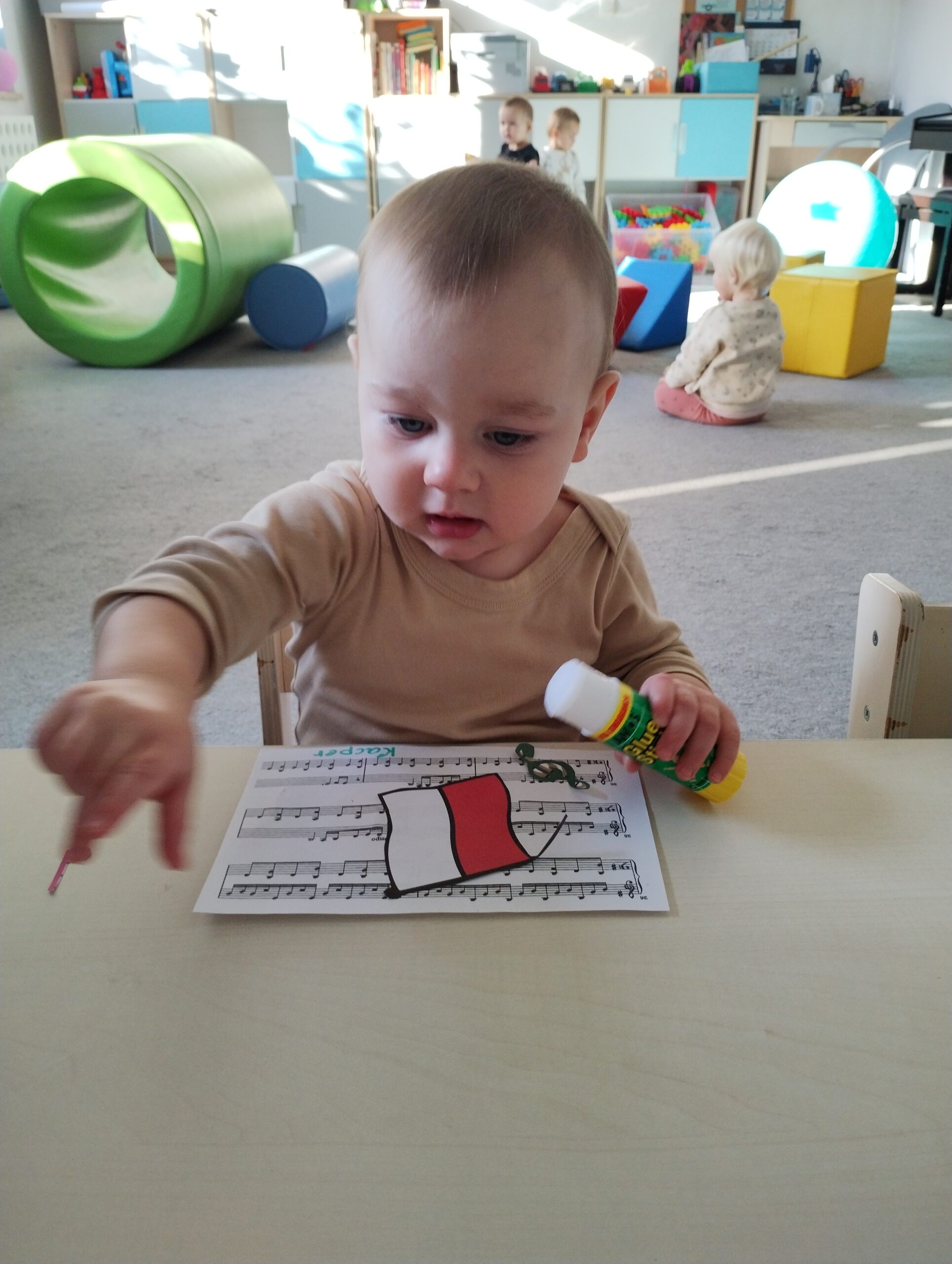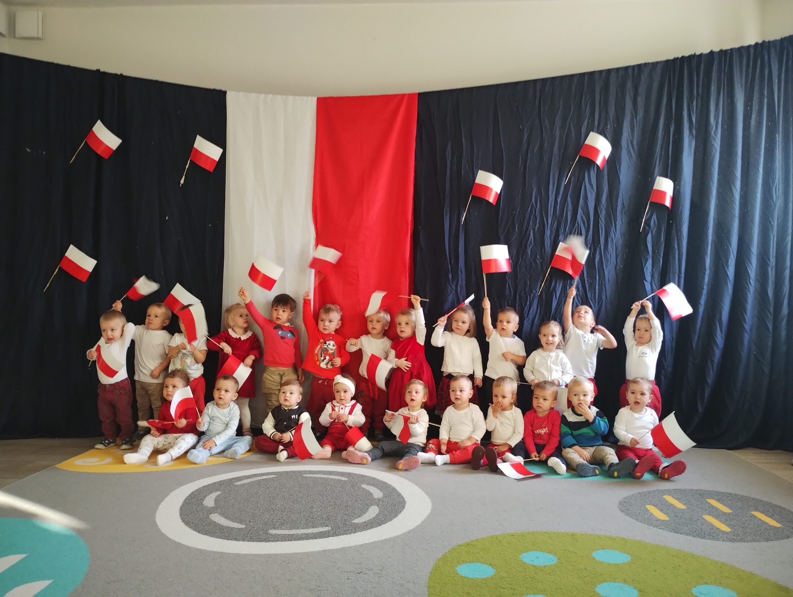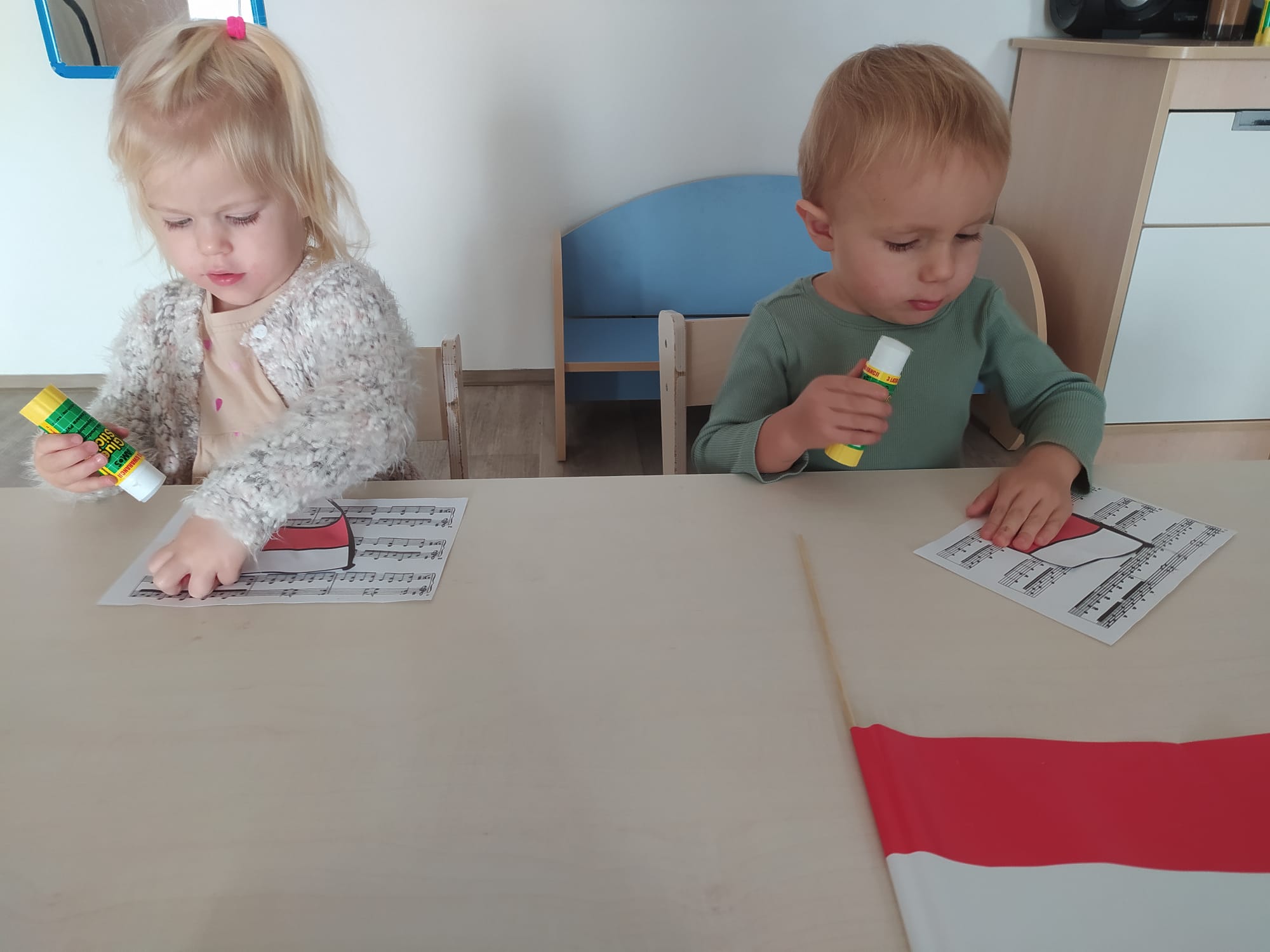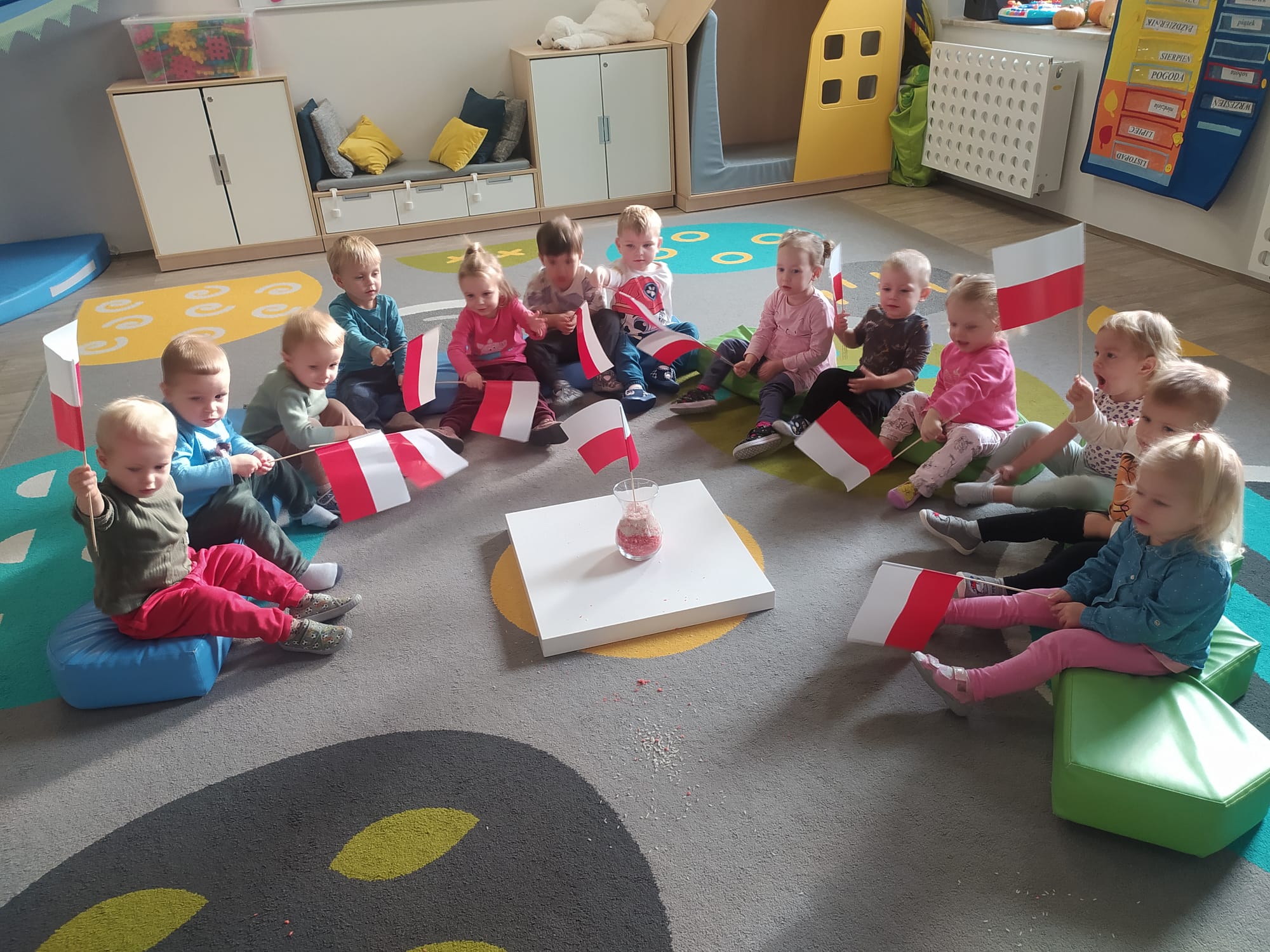 W poprzednim tygodniu dzieci wysłuchały krótkiej rozmowy na temat naszego kraju- Polski. Opowiadały gdzie mieszkają i próbowały nazwać symbole narodowe. Wspólnie obejrzeliśmy ilustracje przedstawiające flagę, godło i mapę Polski. Maluszki dowiedziały się, że flaga ma dwa kolory- biały i czerwony, a na godle znajduje się biały orzeł. Następnie dzieci z powagą wysłuchały fragmentu hymnu narodowego, ucząc się, że podczas jego jego odtwarzania należy zachować postawę szacunku. Podczas zajęć plastycznych wykonaliśmy piękne flagi. Nie zabrakło też zabaw sensorycznych i ćwiczeń motoryki małej.