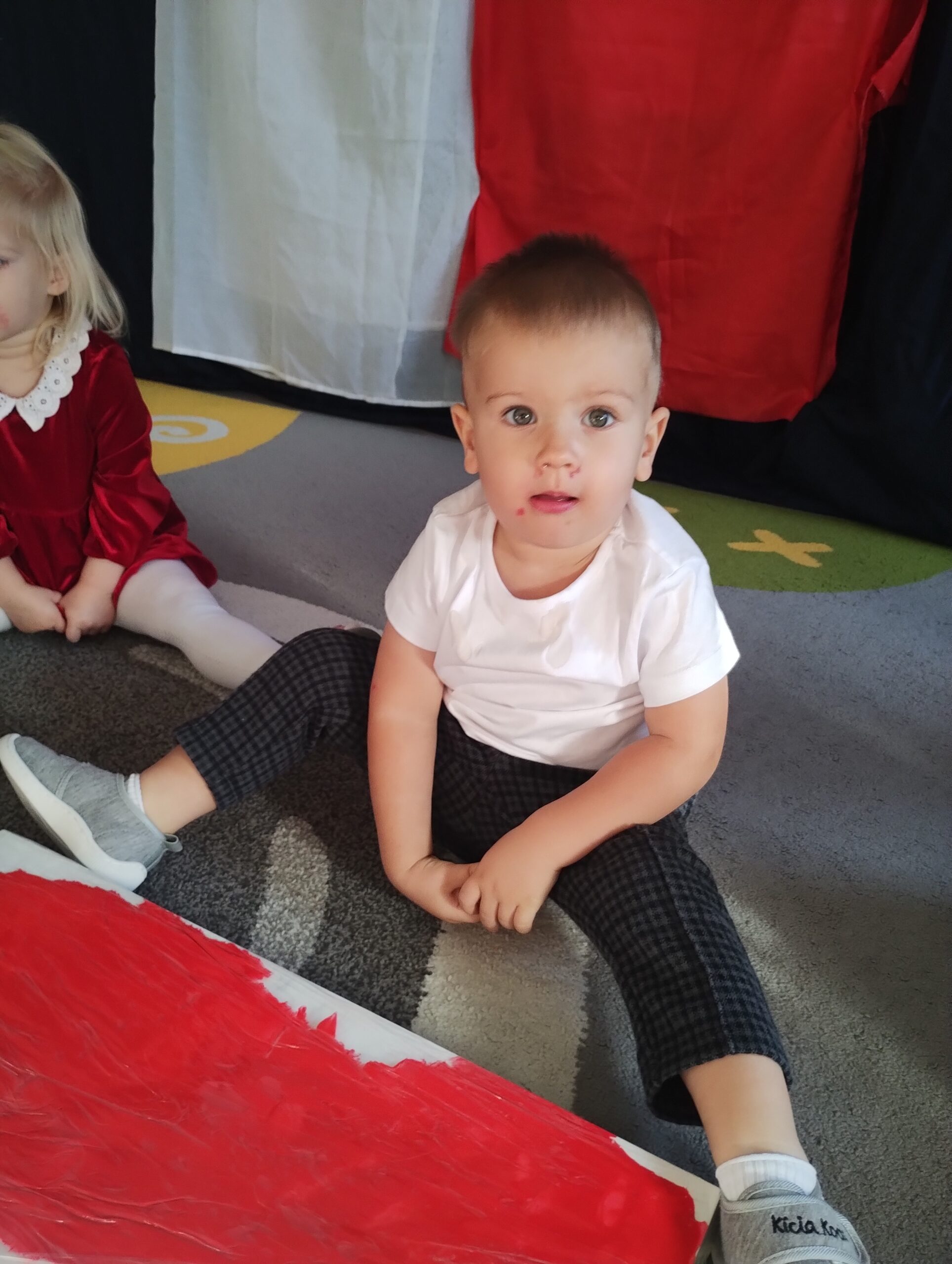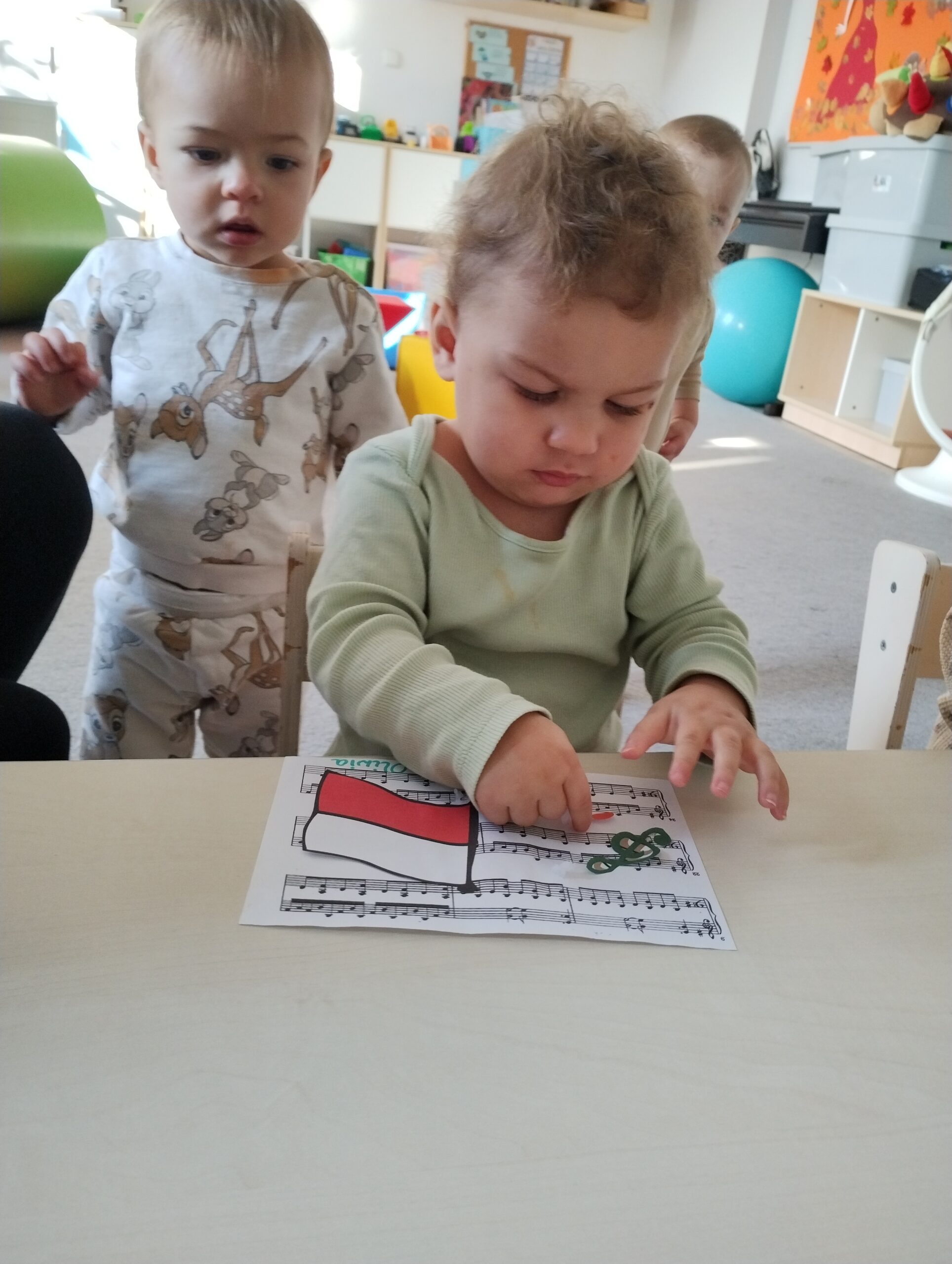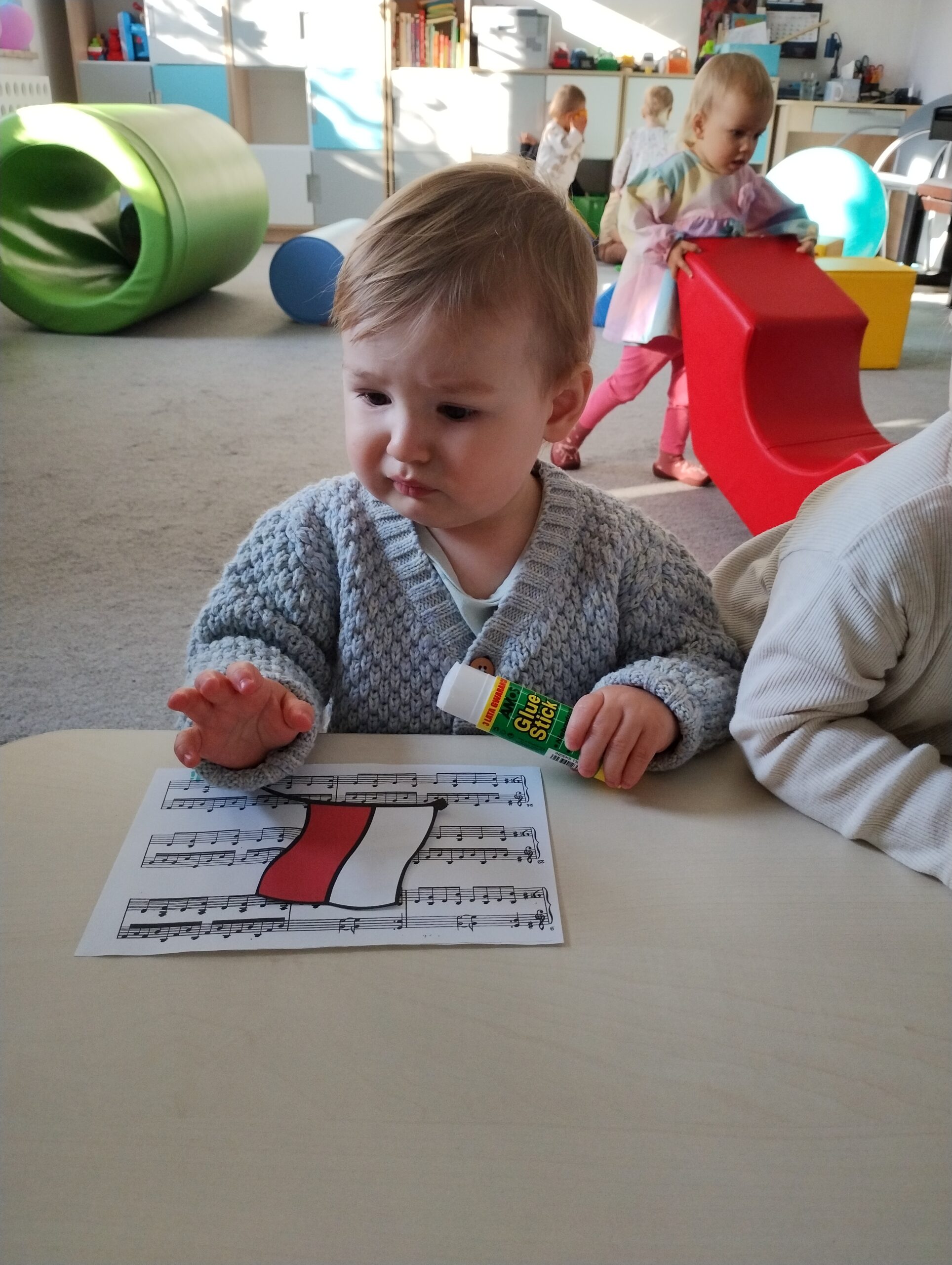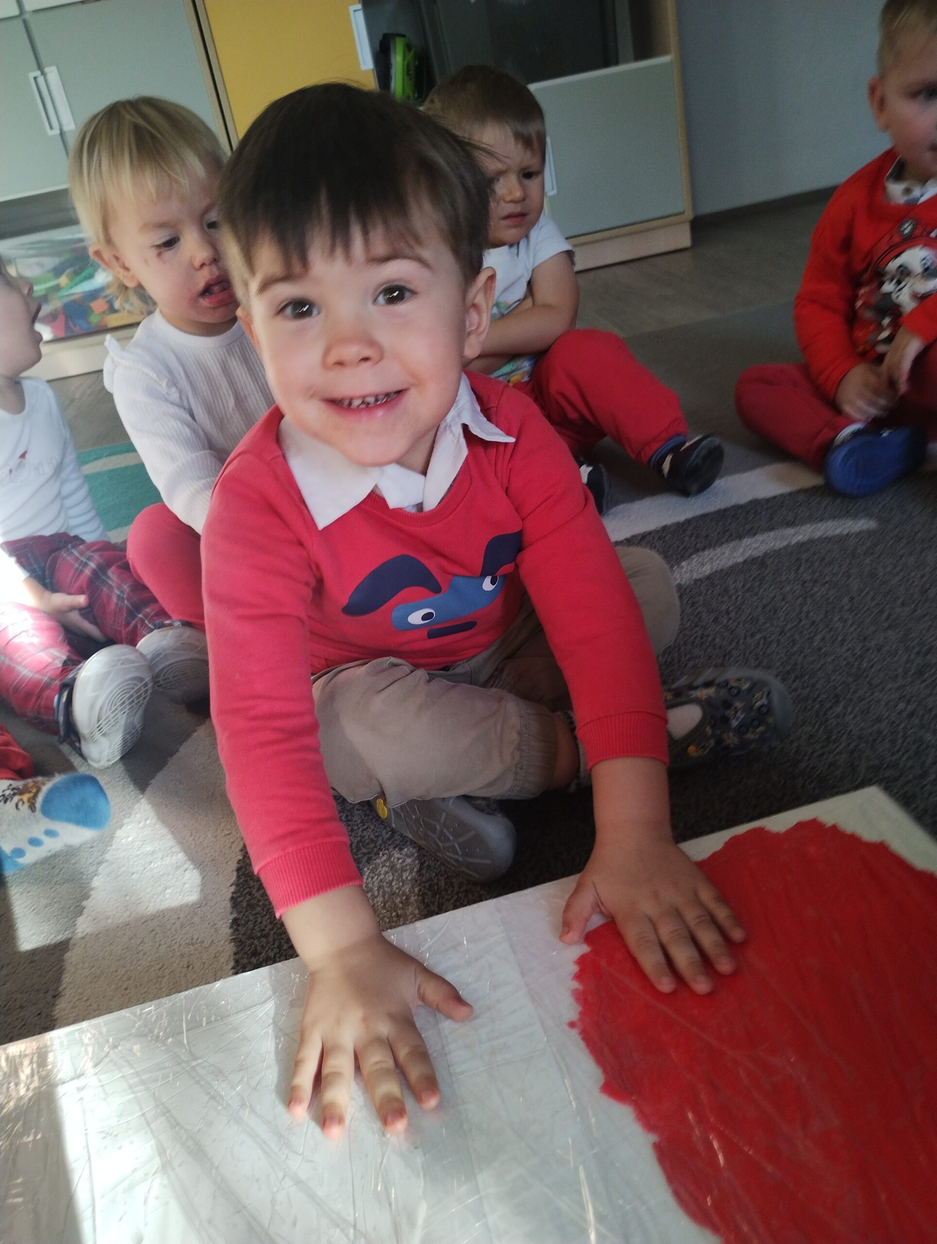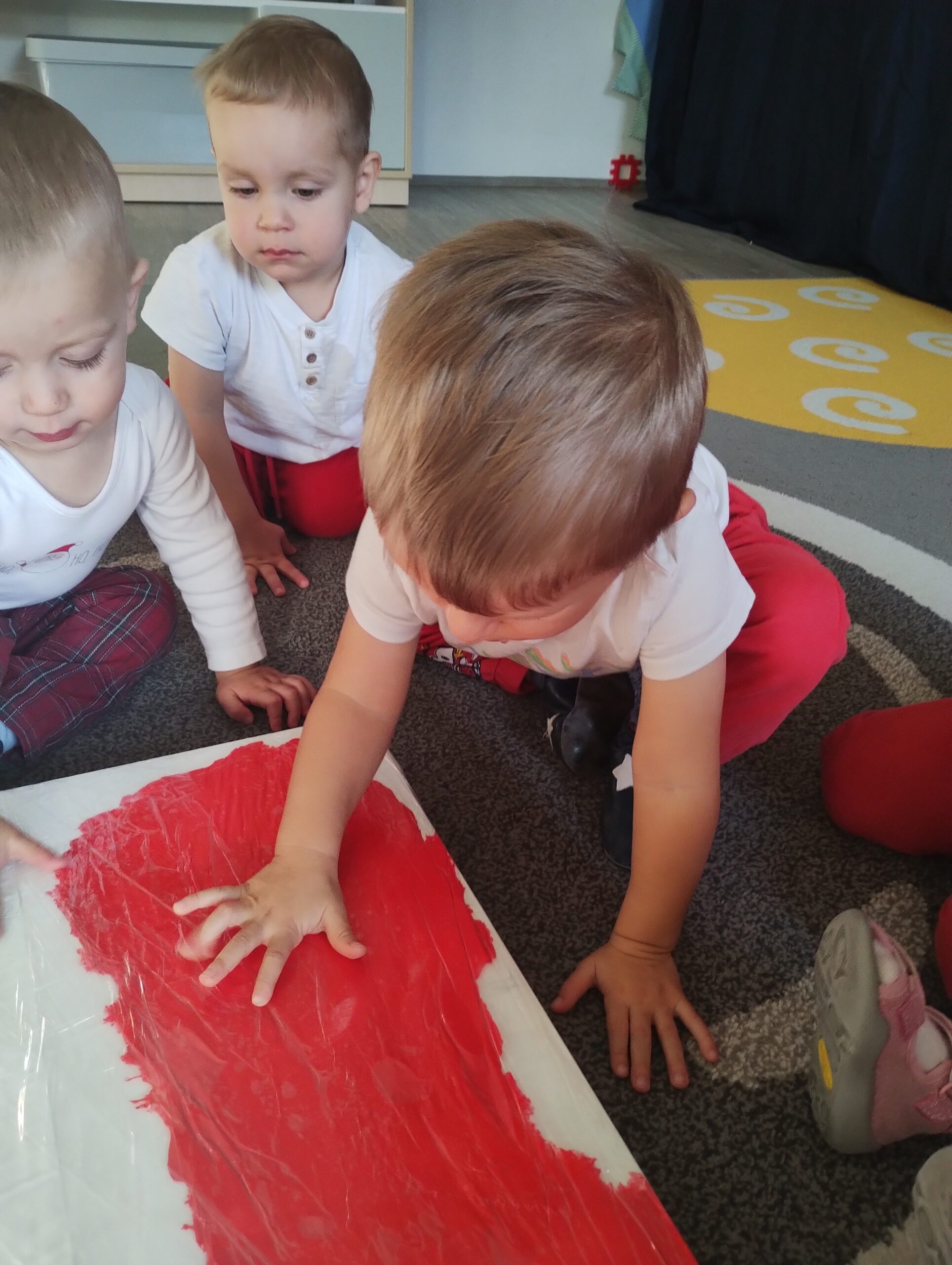 W poprzednim tygodniu dzieci wysłuchały krótkiej rozmowy na temat naszego kraju- Polski. Opowiadały gdzie mieszkają i próbowały nazwać symbole narodowe. Wspólnie obejrzeliśmy ilustracje przedstawiające flagę, godło i mapę Polski. Maluszki dowiedziały się, że flaga ma dwa kolory- biały i czerwony, a na godle znajduje się biały orzeł. Następnie dzieci z powagą wysłuchały fragmentu hymnu narodowego, ucząc się, że podczas jego jego odtwarzania należy zachować postawę szacunku. Podczas zajęć plastycznych wykonaliśmy piękne flagi. Nie zabrakło też zabaw sensorycznych i ćwiczeń motoryki małej.