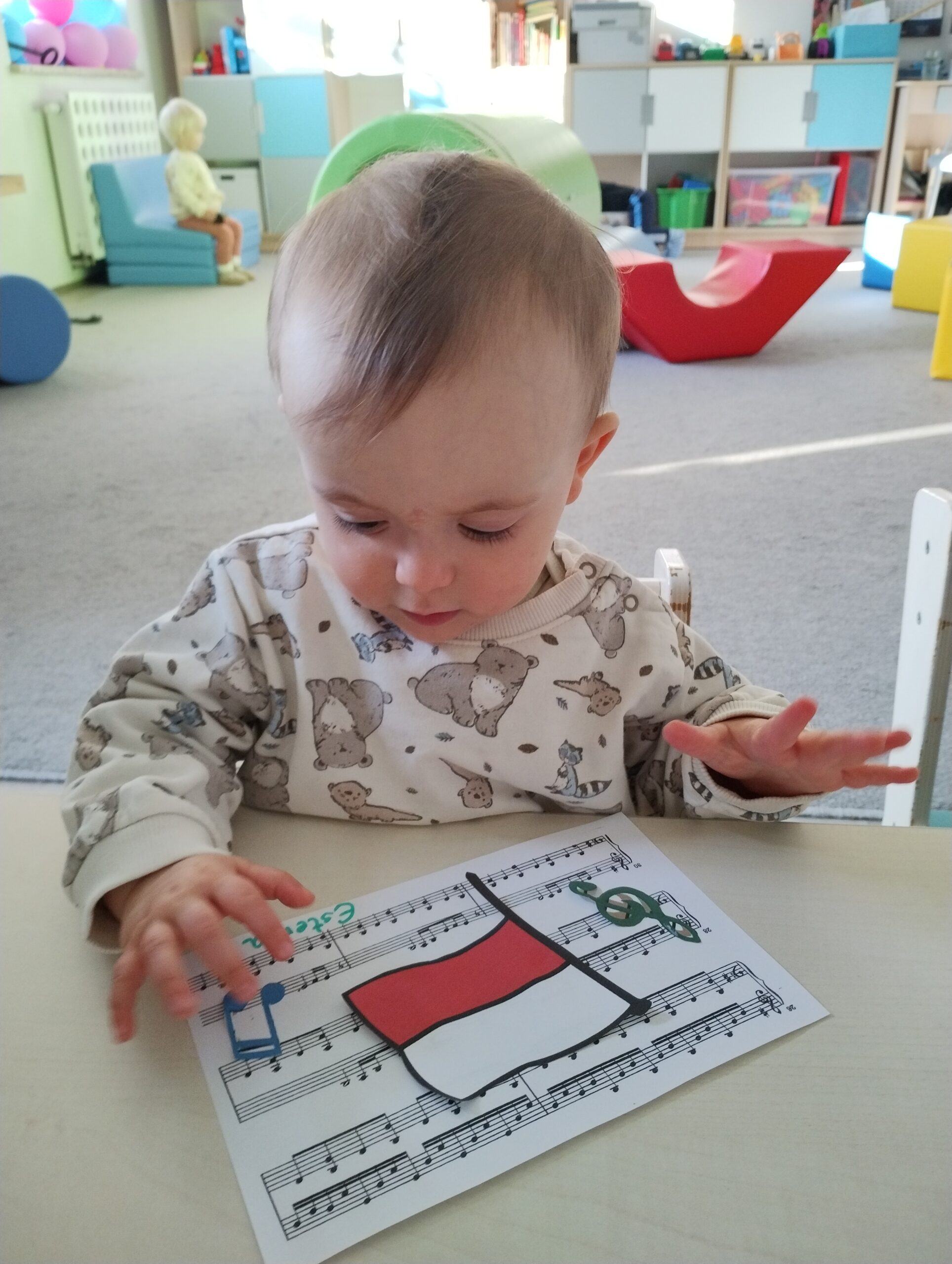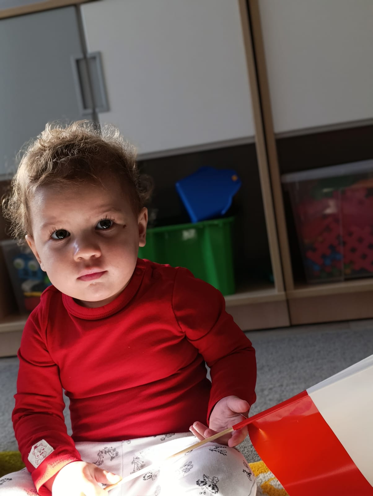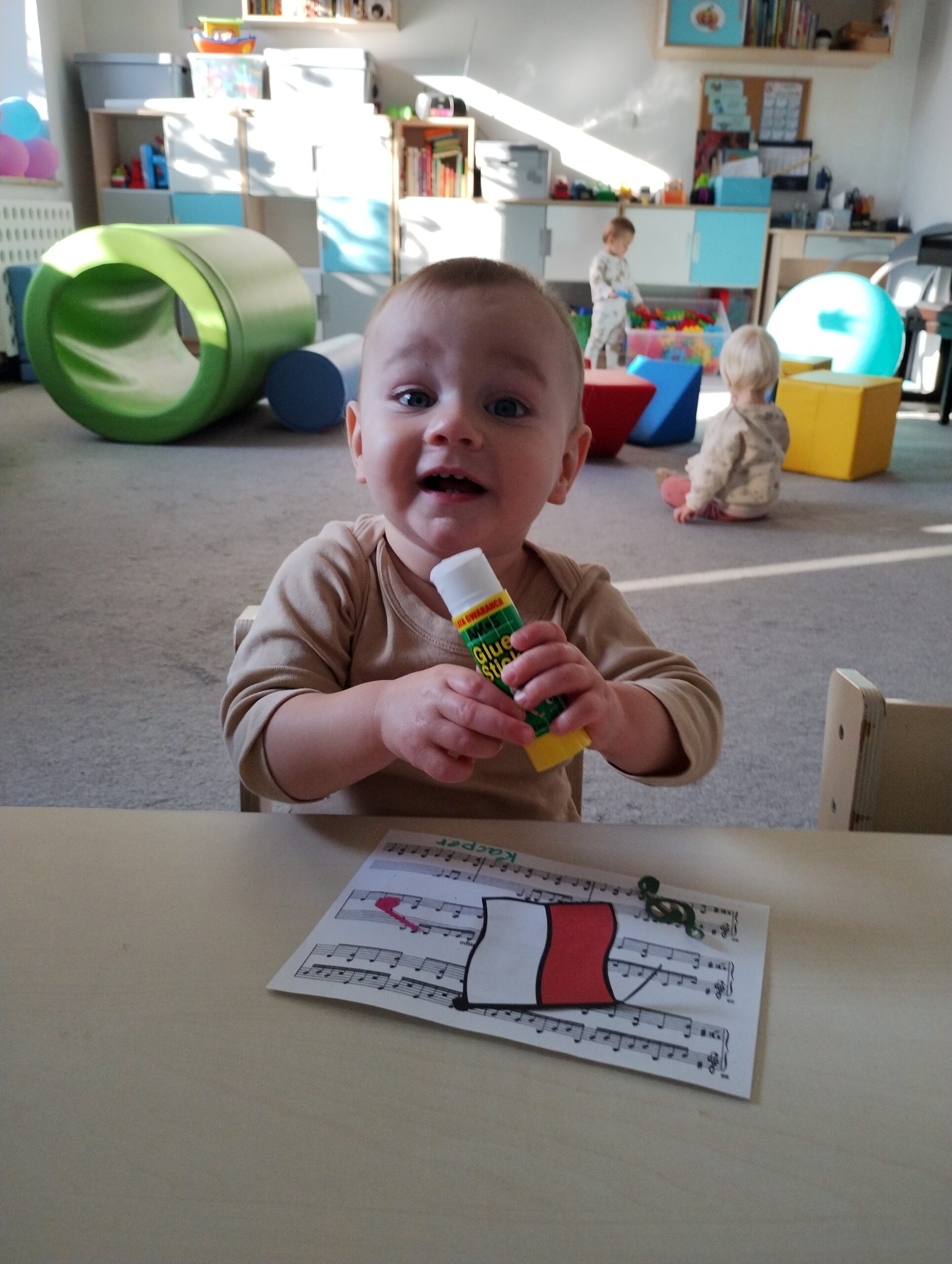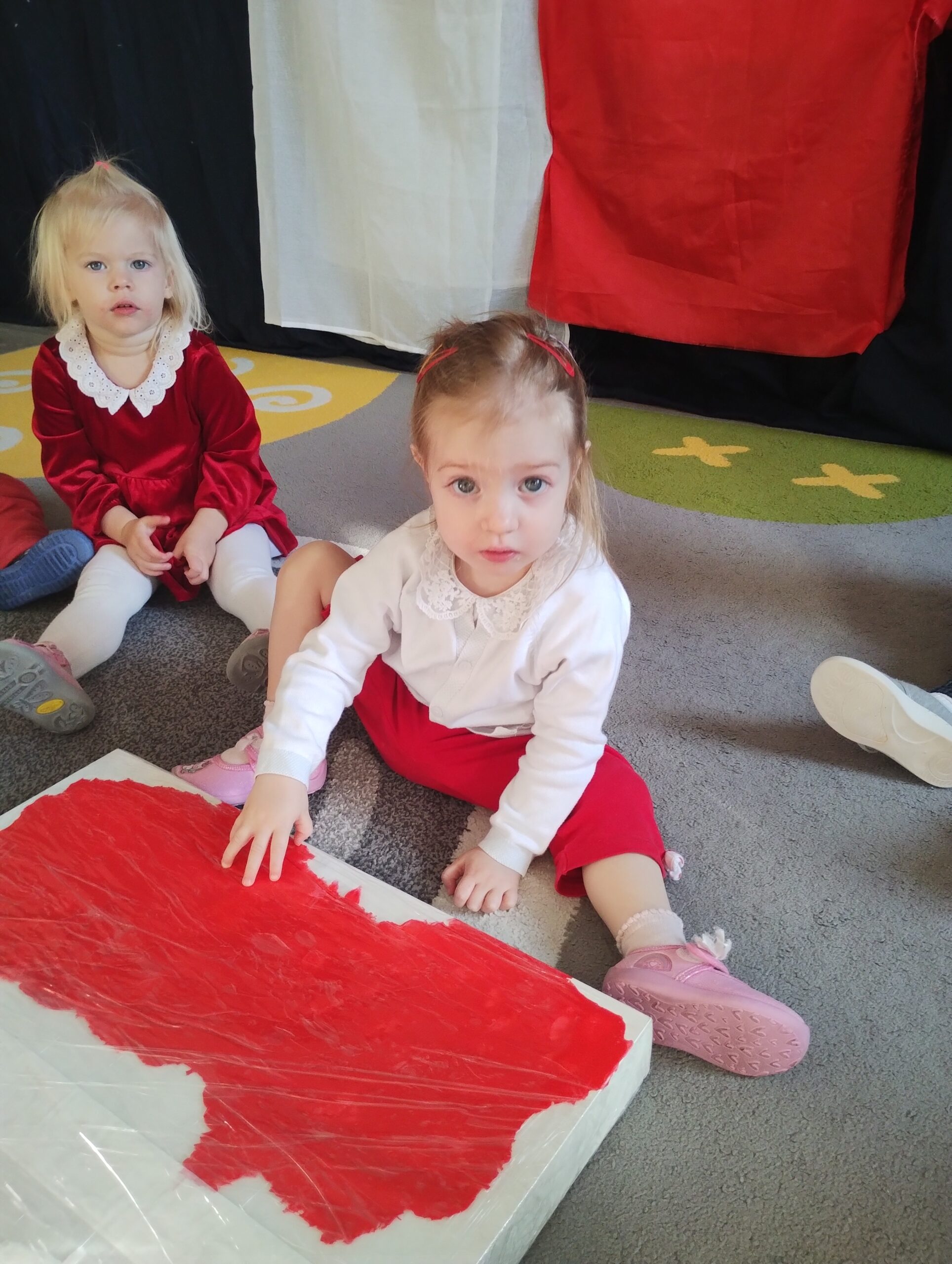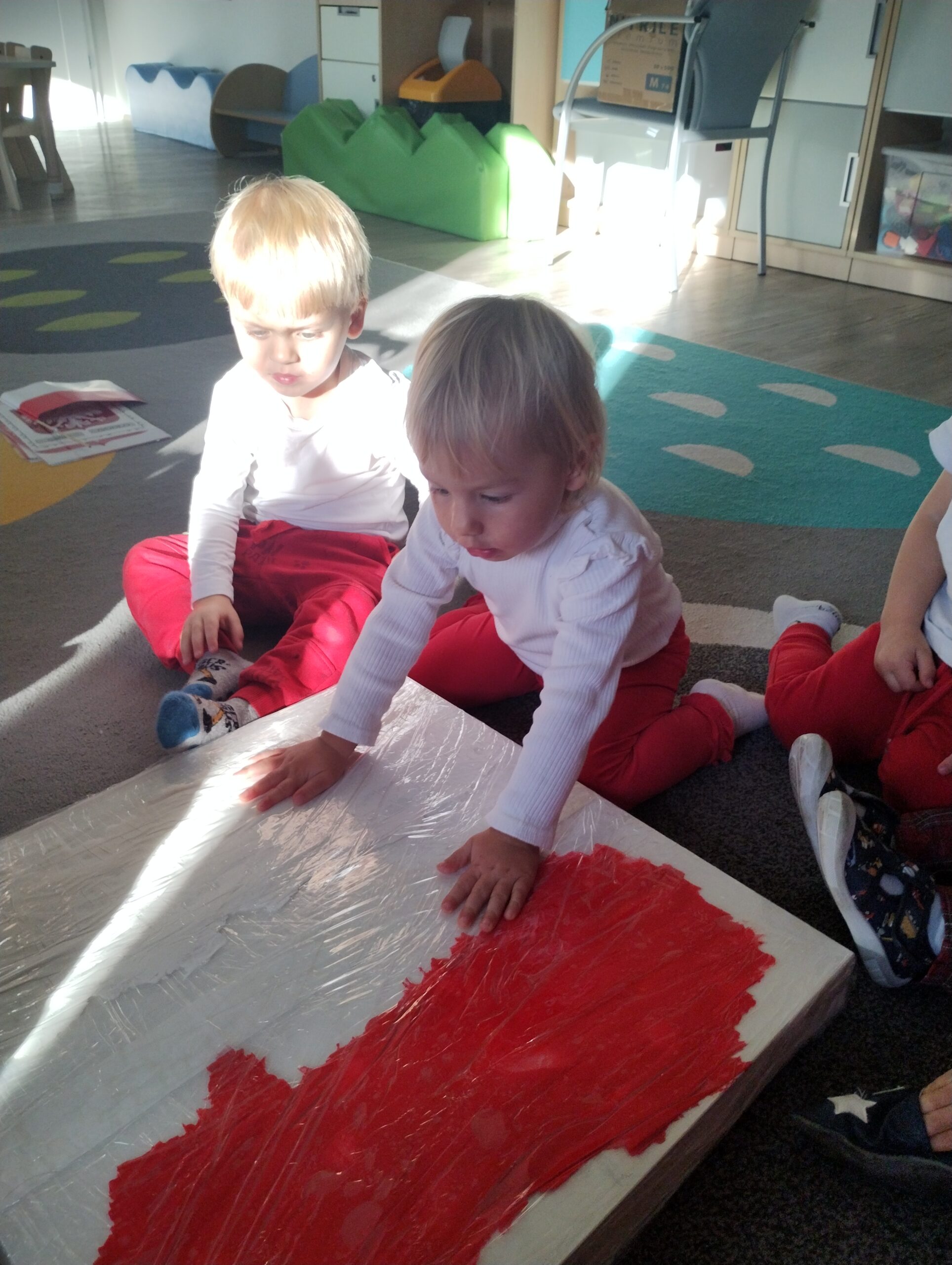 W poprzednim tygodniu dzieci wysłuchały krótkiej rozmowy na temat naszego kraju- Polski. Opowiadały gdzie mieszkają i próbowały nazwać symbole narodowe. Wspólnie obejrzeliśmy ilustracje przedstawiające flagę, godło i mapę Polski. Maluszki dowiedziały się, że flaga ma dwa kolory- biały i czerwony, a na godle znajduje się biały orzeł. Następnie dzieci z powagą wysłuchały fragmentu hymnu narodowego, ucząc się, że podczas jego jego odtwarzania należy zachować postawę szacunku. Podczas zajęć plastycznych wykonaliśmy piękne flagi. Nie zabrakło też zabaw sensorycznych i ćwiczeń motoryki małej.