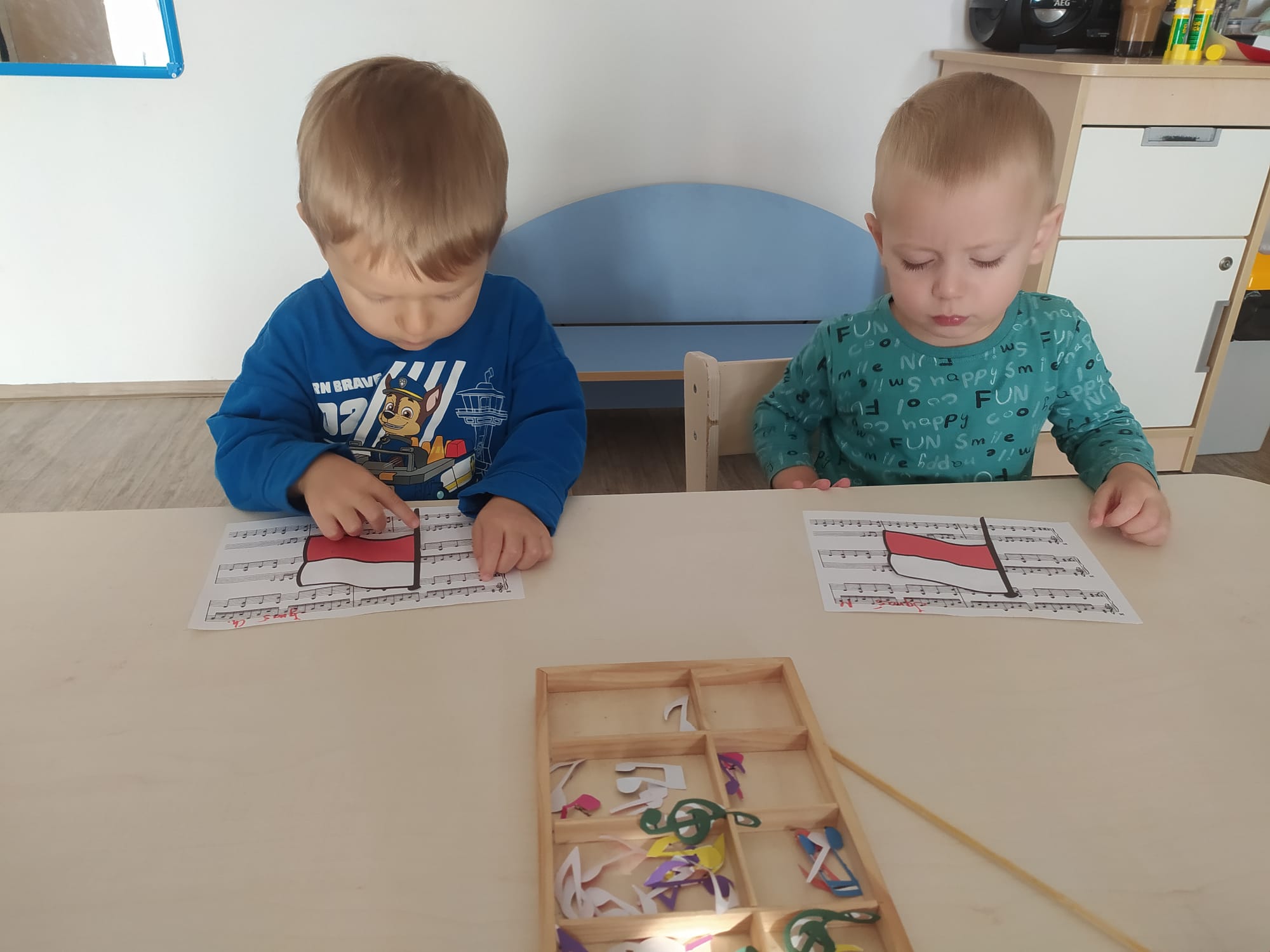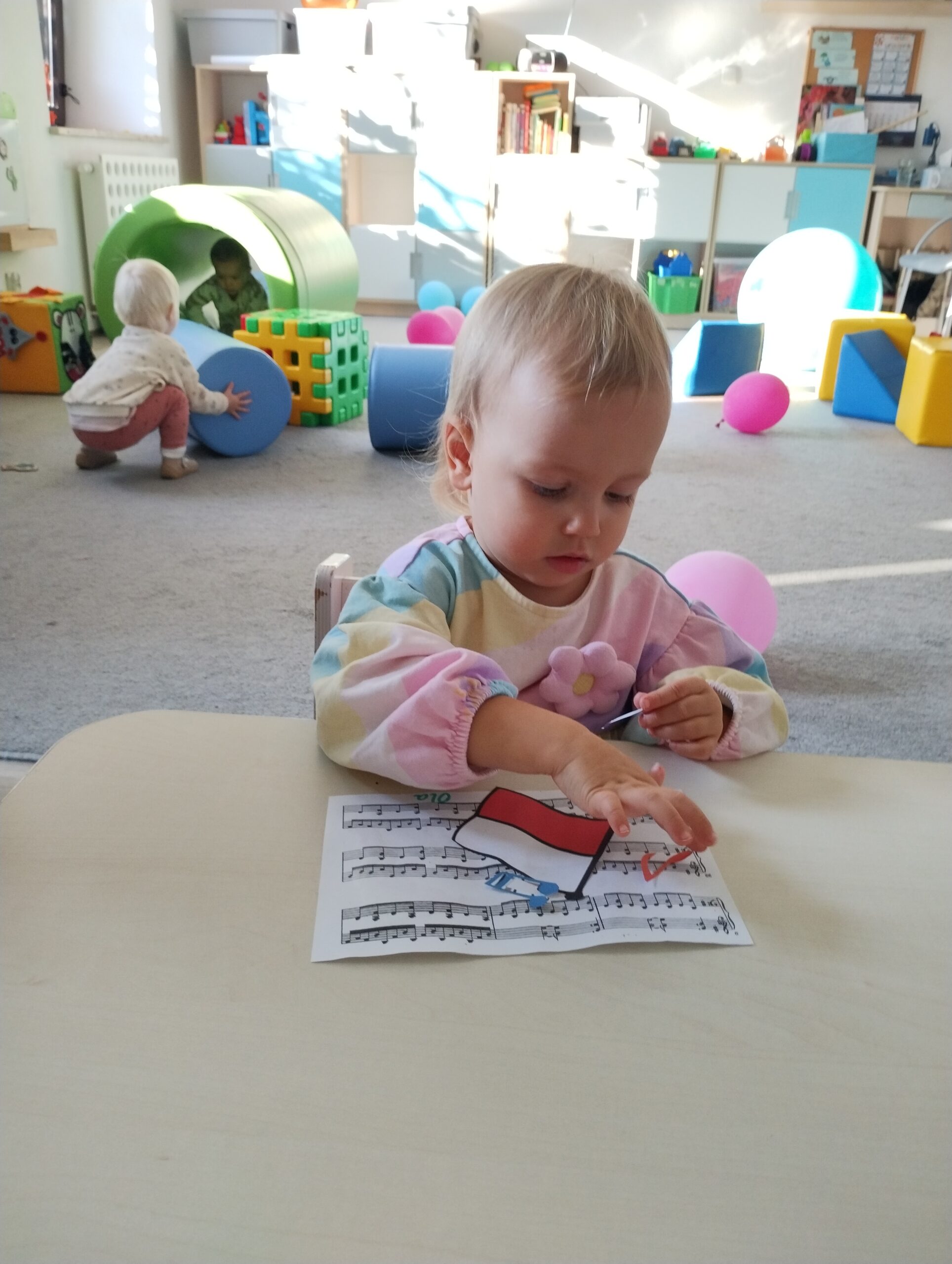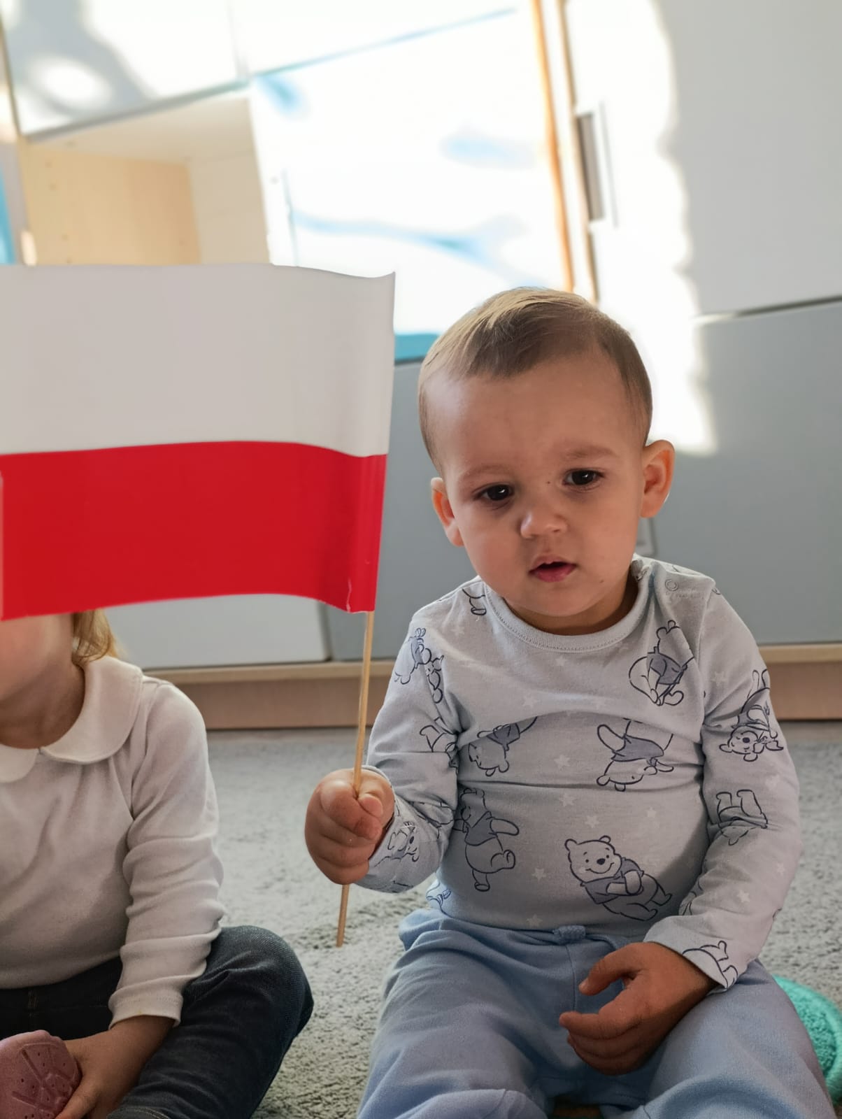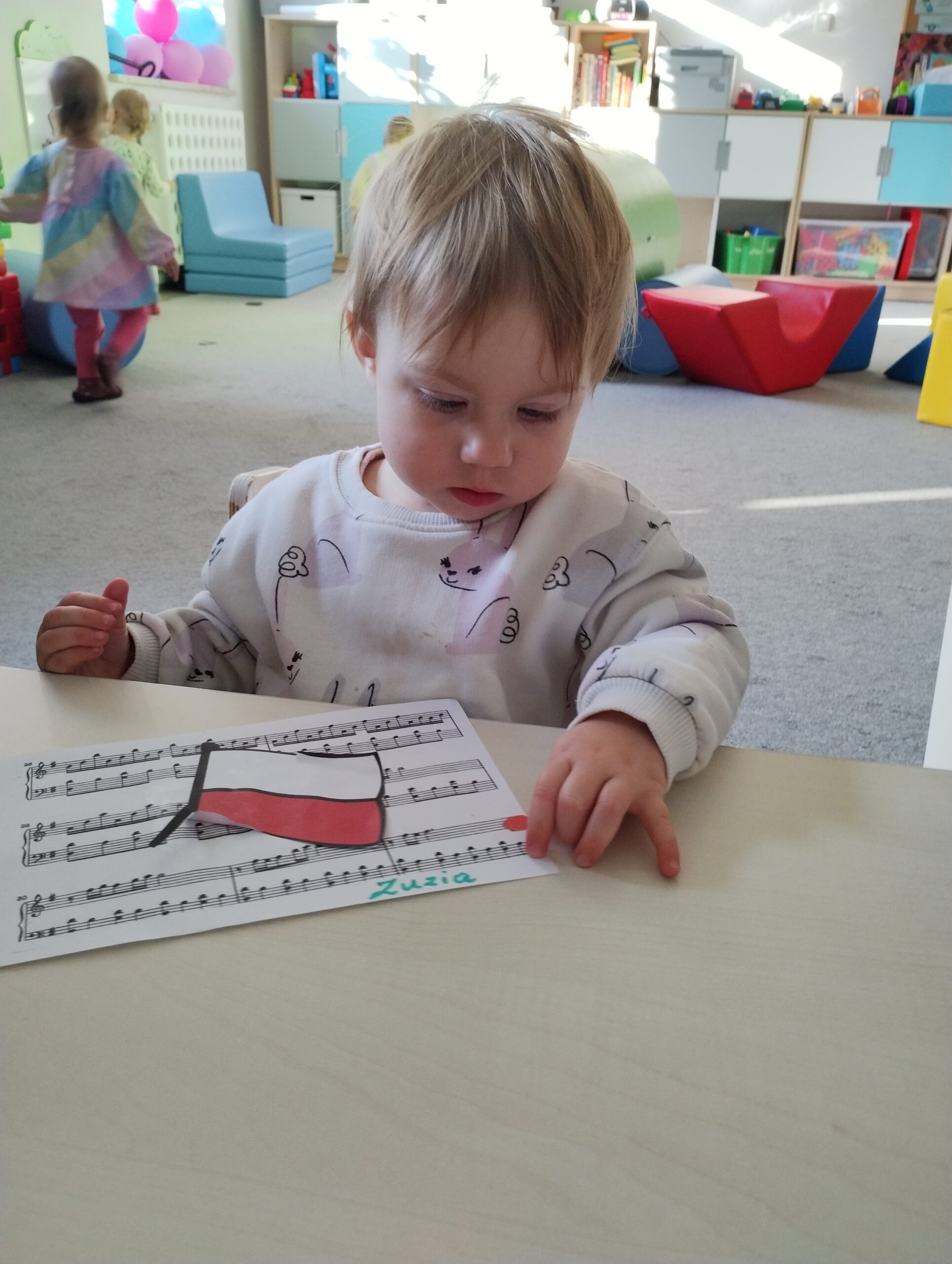 W poprzednim tygodniu dzieci wysłuchały krótkiej rozmowy na temat naszego kraju- Polski. Opowiadały gdzie mieszkają i próbowały nazwać symbole narodowe. Wspólnie obejrzeliśmy ilustracje przedstawiające flagę, godło i mapę Polski. Maluszki dowiedziały się, że flaga ma dwa kolory- biały i czerwony, a na godle znajduje się biały orzeł. Następnie dzieci z powagą wysłuchały fragmentu hymnu narodowego, ucząc się, że podczas jego jego odtwarzania należy zachować postawę szacunku. Podczas zajęć plastycznych wykonaliśmy piękne flagi. Nie zabrakło też zabaw sensorycznych i ćwiczeń motoryki małej.