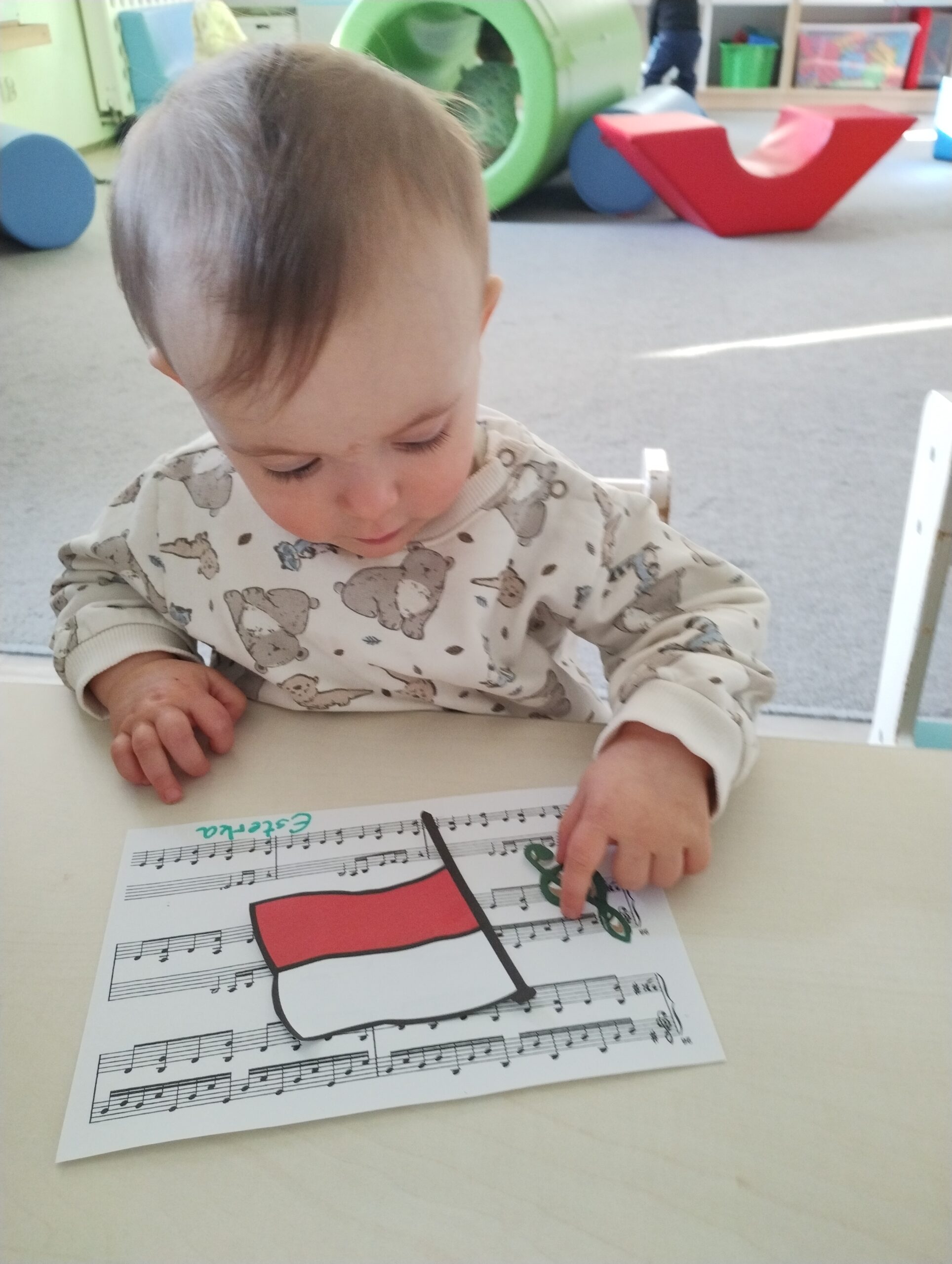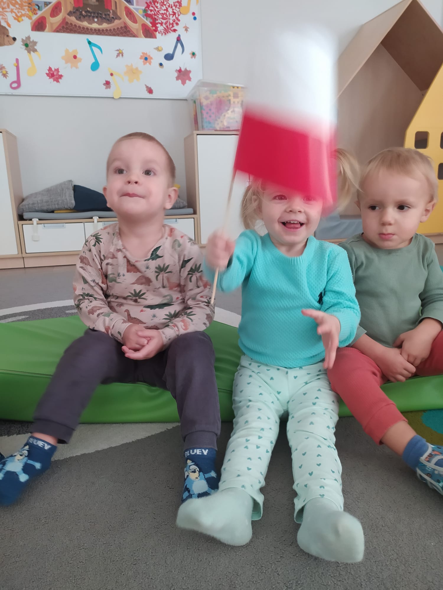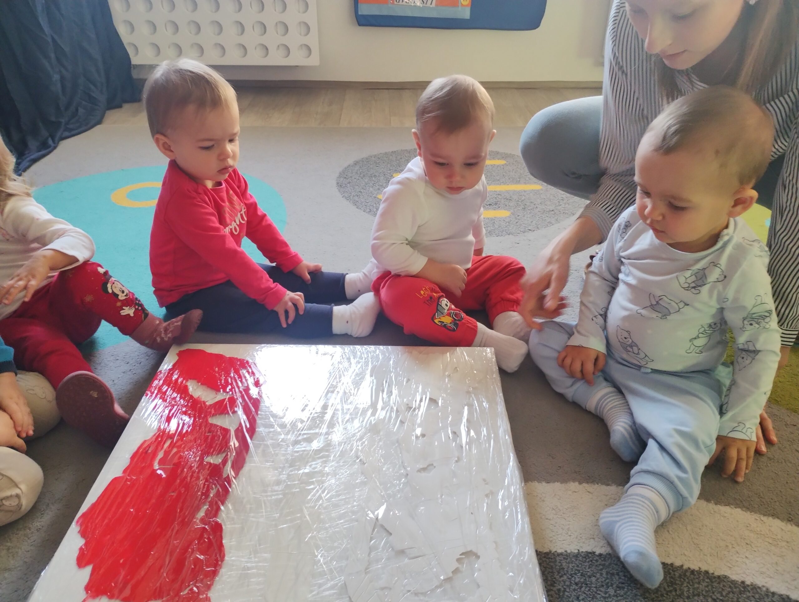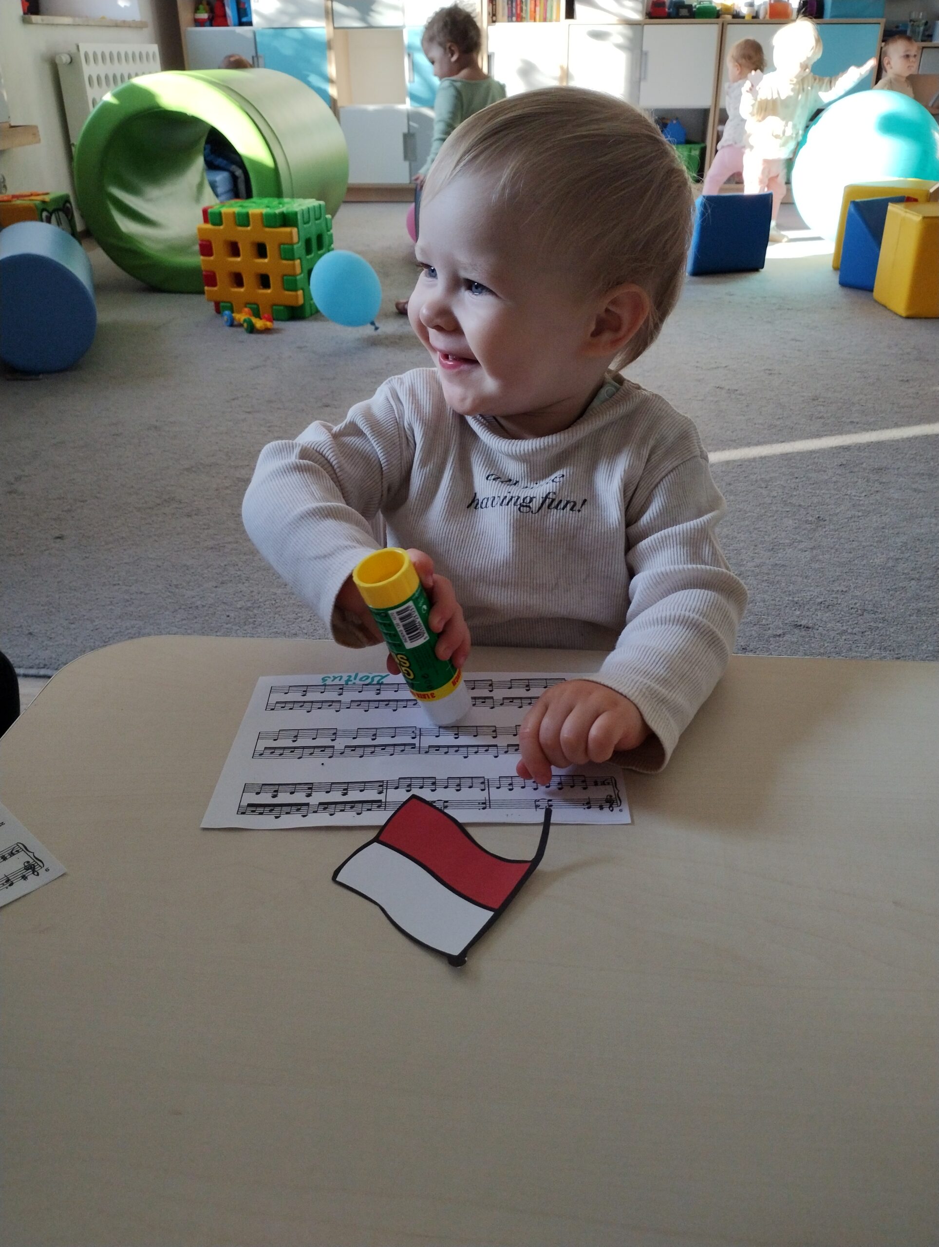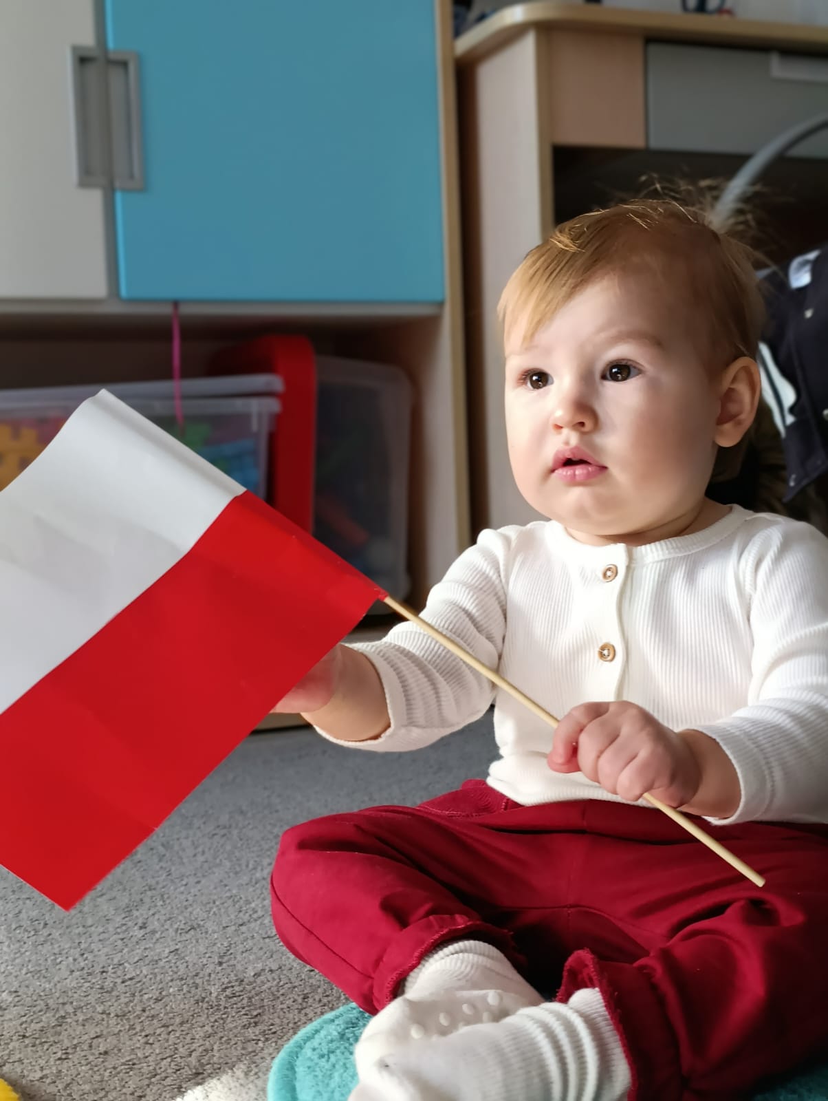 W poprzednim tygodniu dzieci wysłuchały krótkiej rozmowy na temat naszego kraju- Polski. Opowiadały gdzie mieszkają i próbowały nazwać symbole narodowe. Wspólnie obejrzeliśmy ilustracje przedstawiające flagę, godło i mapę Polski. Maluszki dowiedziały się, że flaga ma dwa kolory- biały i czerwony, a na godle znajduje się biały orzeł. Następnie dzieci z powagą wysłuchały fragmentu hymnu narodowego, ucząc się, że podczas jego jego odtwarzania należy zachować postawę szacunku. Podczas zajęć plastycznych wykonaliśmy piękne flagi. Nie zabrakło też zabaw sensorycznych i ćwiczeń motoryki małej.