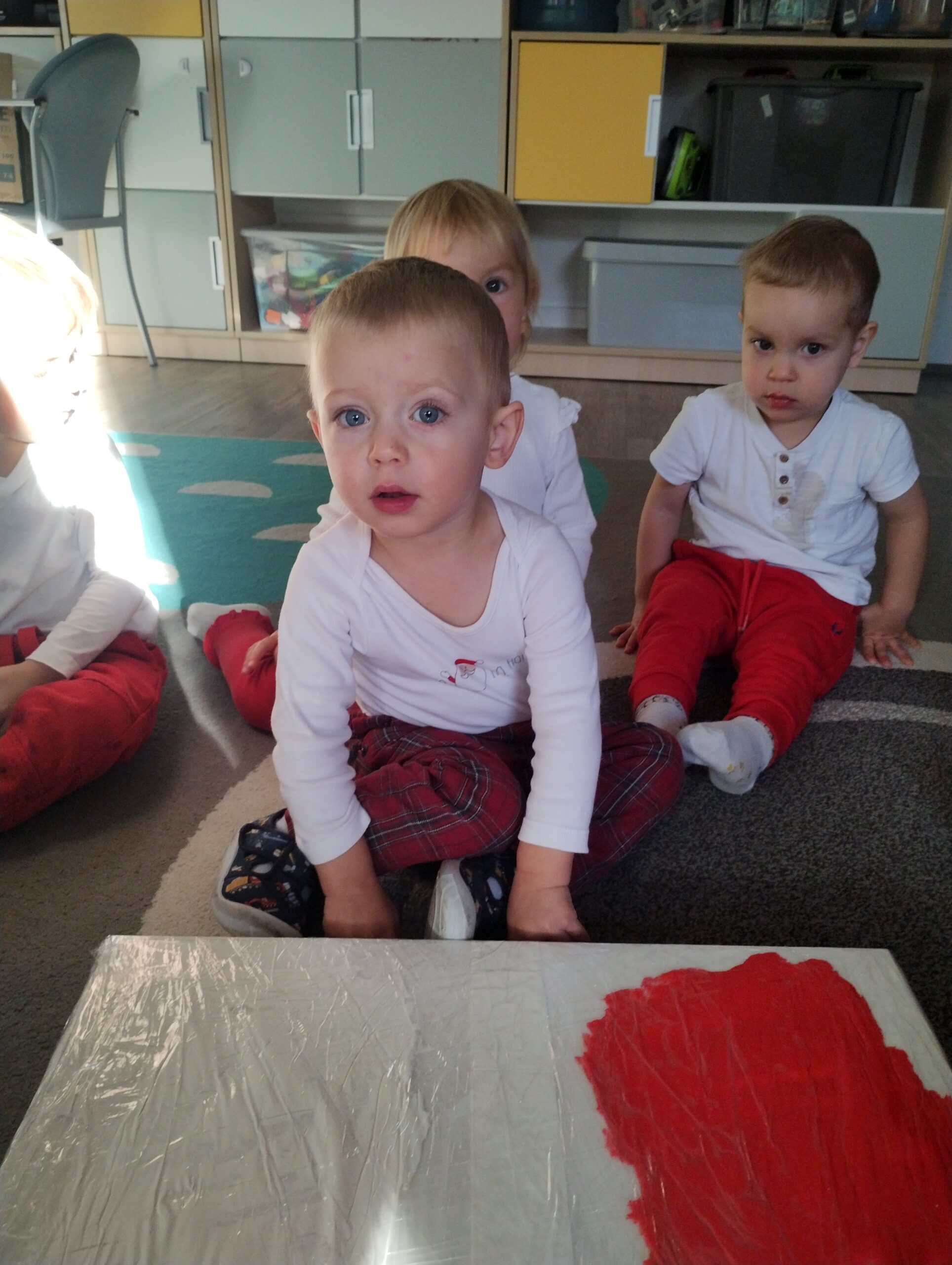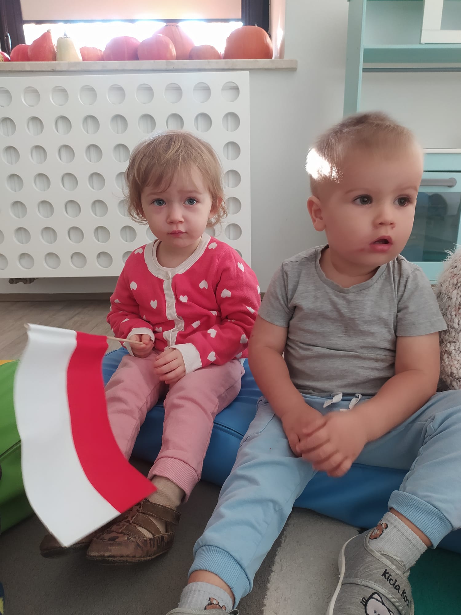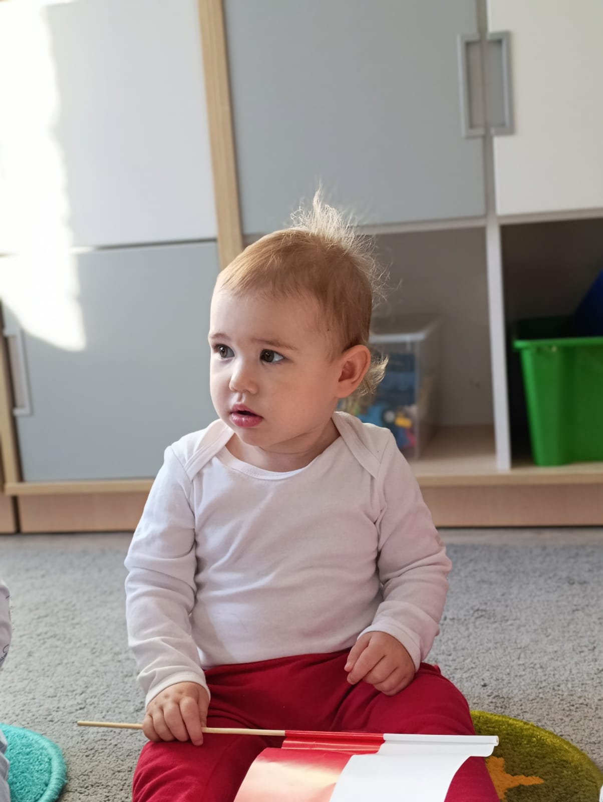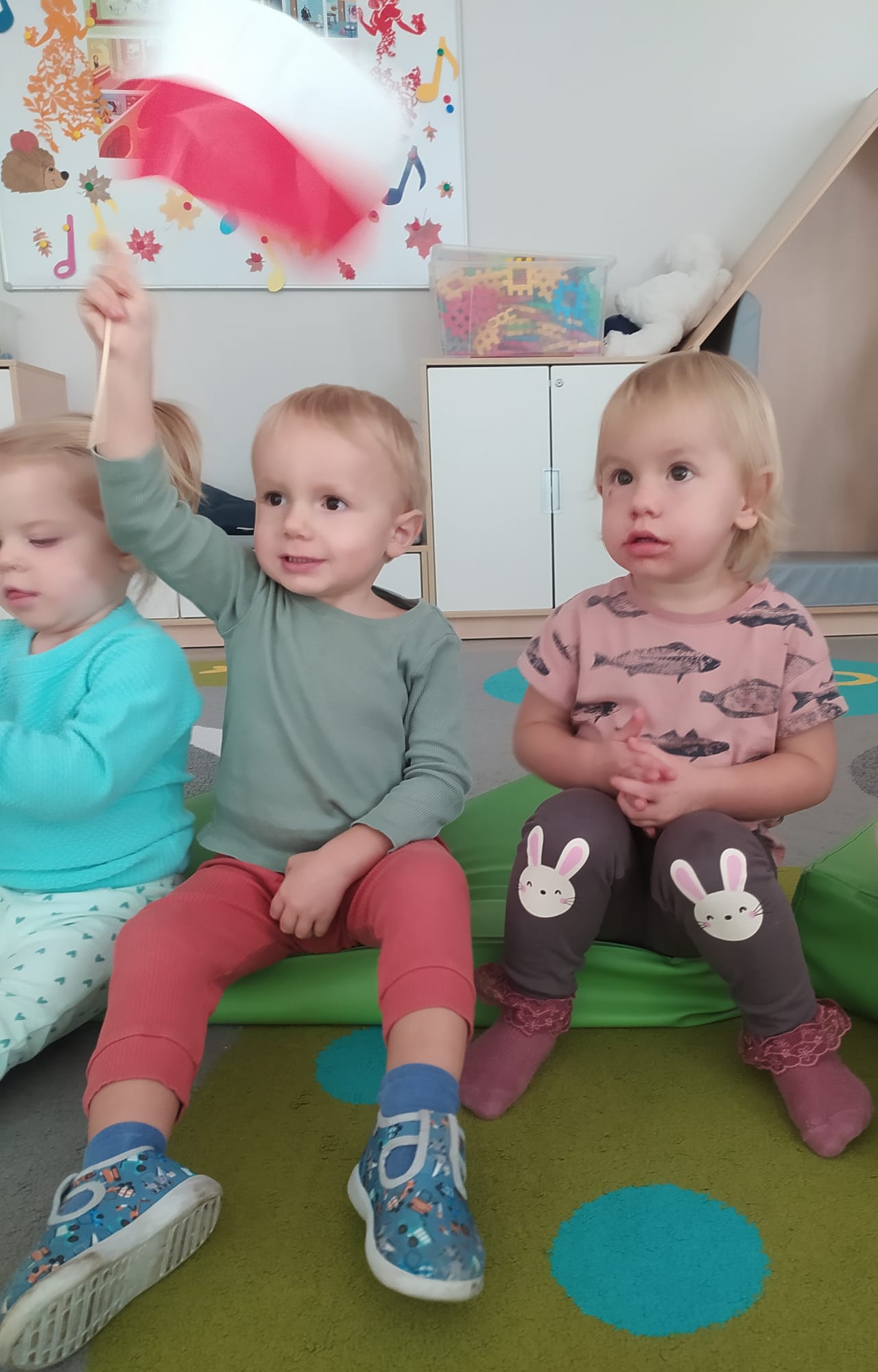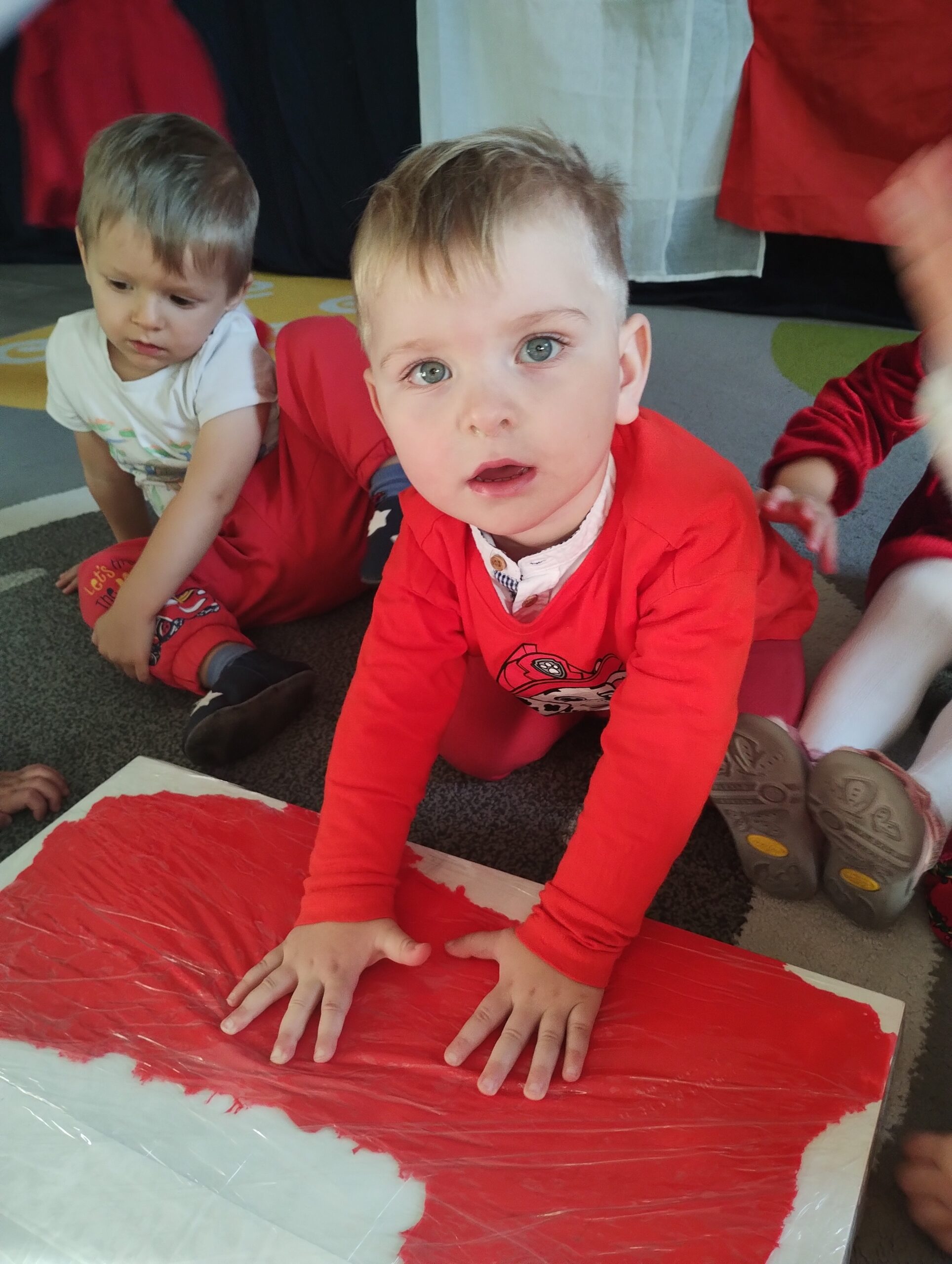 W poprzednim tygodniu dzieci wysłuchały krótkiej rozmowy na temat naszego kraju- Polski. Opowiadały gdzie mieszkają i próbowały nazwać symbole narodowe. Wspólnie obejrzeliśmy ilustracje przedstawiające flagę, godło i mapę Polski. Maluszki dowiedziały się, że flaga ma dwa kolory- biały i czerwony, a na godle znajduje się biały orzeł. Następnie dzieci z powagą wysłuchały fragmentu hymnu narodowego, ucząc się, że podczas jego jego odtwarzania należy zachować postawę szacunku. Podczas zajęć plastycznych wykonaliśmy piękne flagi. Nie zabrakło też zabaw sensorycznych i ćwiczeń motoryki małej.