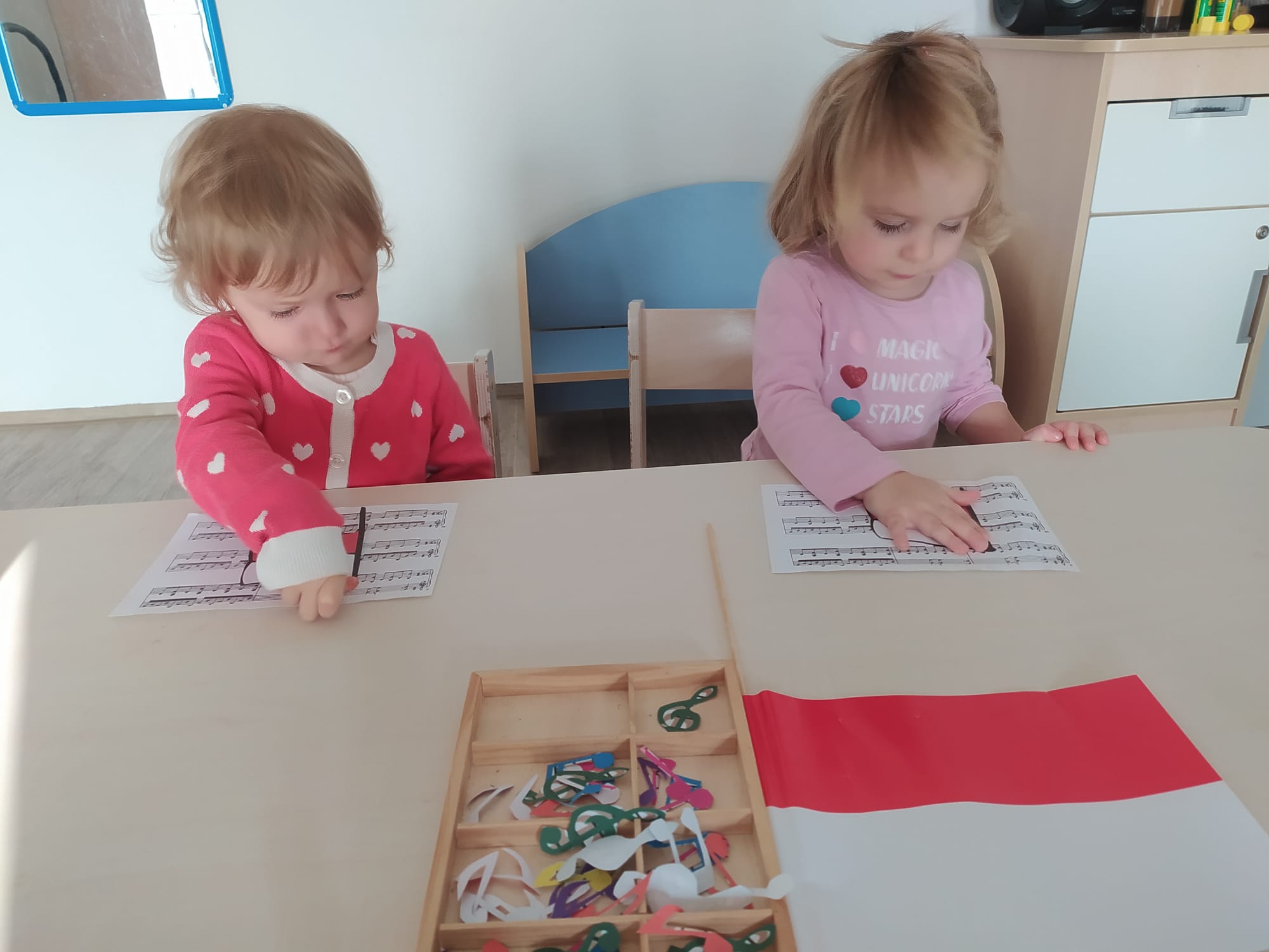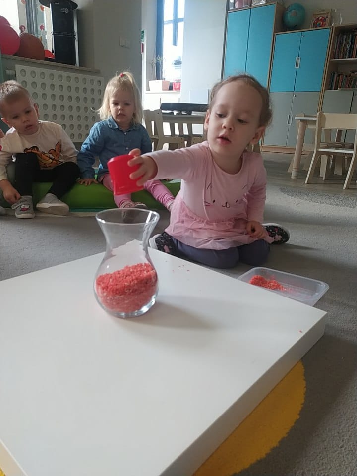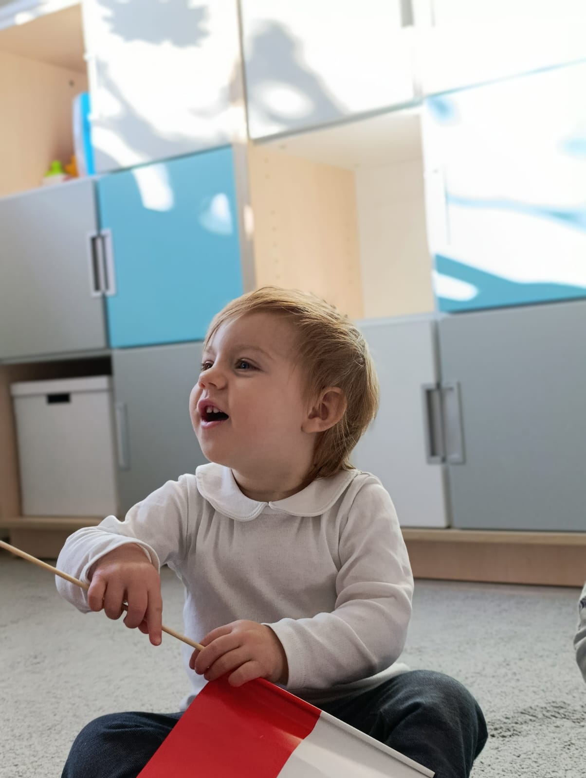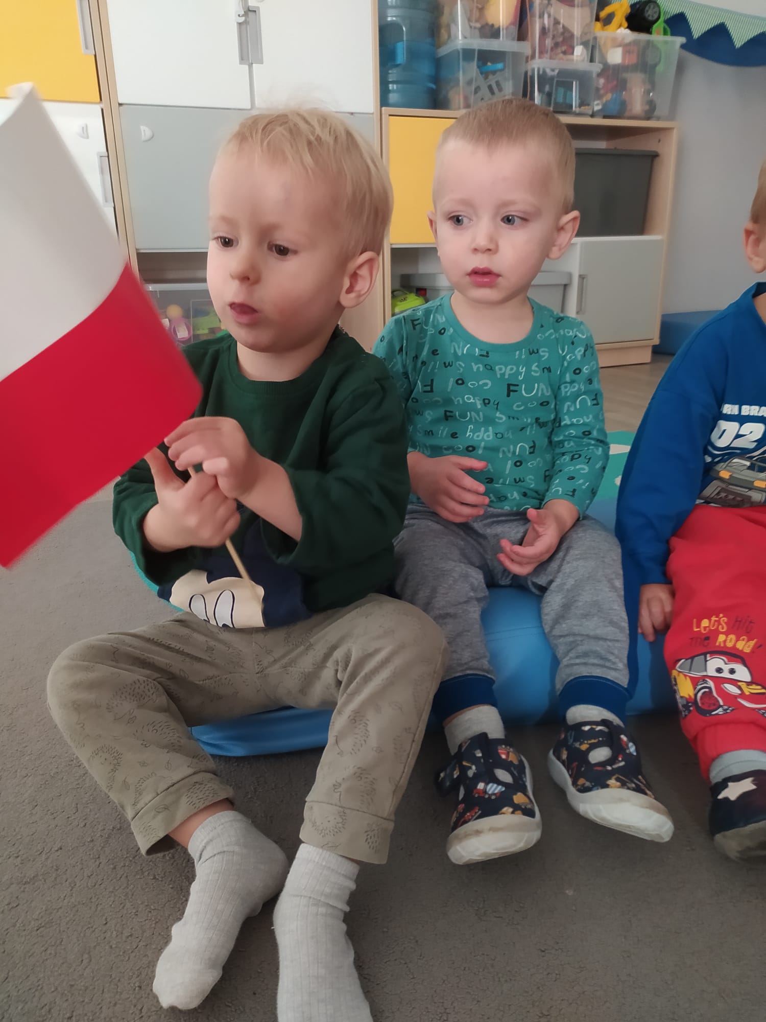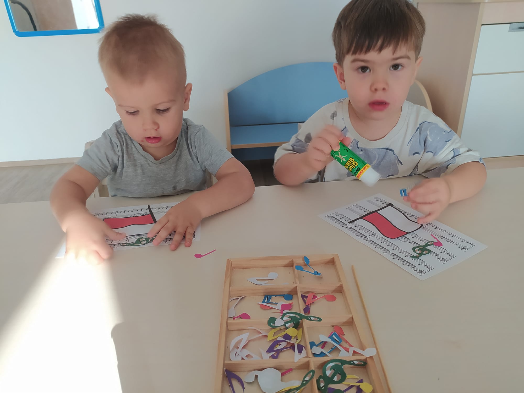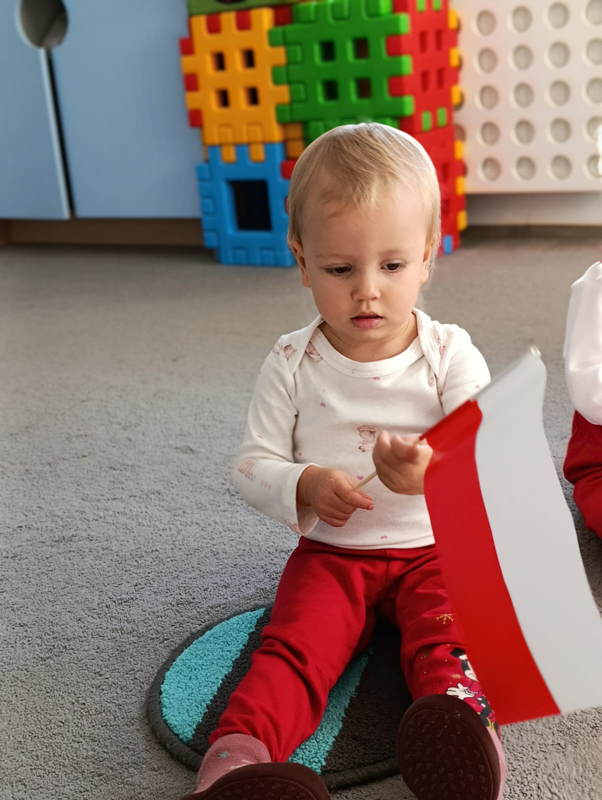 W poprzednim tygodniu dzieci wysłuchały krótkiej rozmowy na temat naszego kraju- Polski. Opowiadały gdzie mieszkają i próbowały nazwać symbole narodowe. Wspólnie obejrzeliśmy ilustracje przedstawiające flagę, godło i mapę Polski. Maluszki dowiedziały się, że flaga ma dwa kolory- biały i czerwony, a na godle znajduje się biały orzeł. Następnie dzieci z powagą wysłuchały fragmentu hymnu narodowego, ucząc się, że podczas jego jego odtwarzania należy zachować postawę szacunku. Podczas zajęć plastycznych wykonaliśmy piękne flagi. Nie zabrakło też zabaw sensorycznych i ćwiczeń motoryki małej.