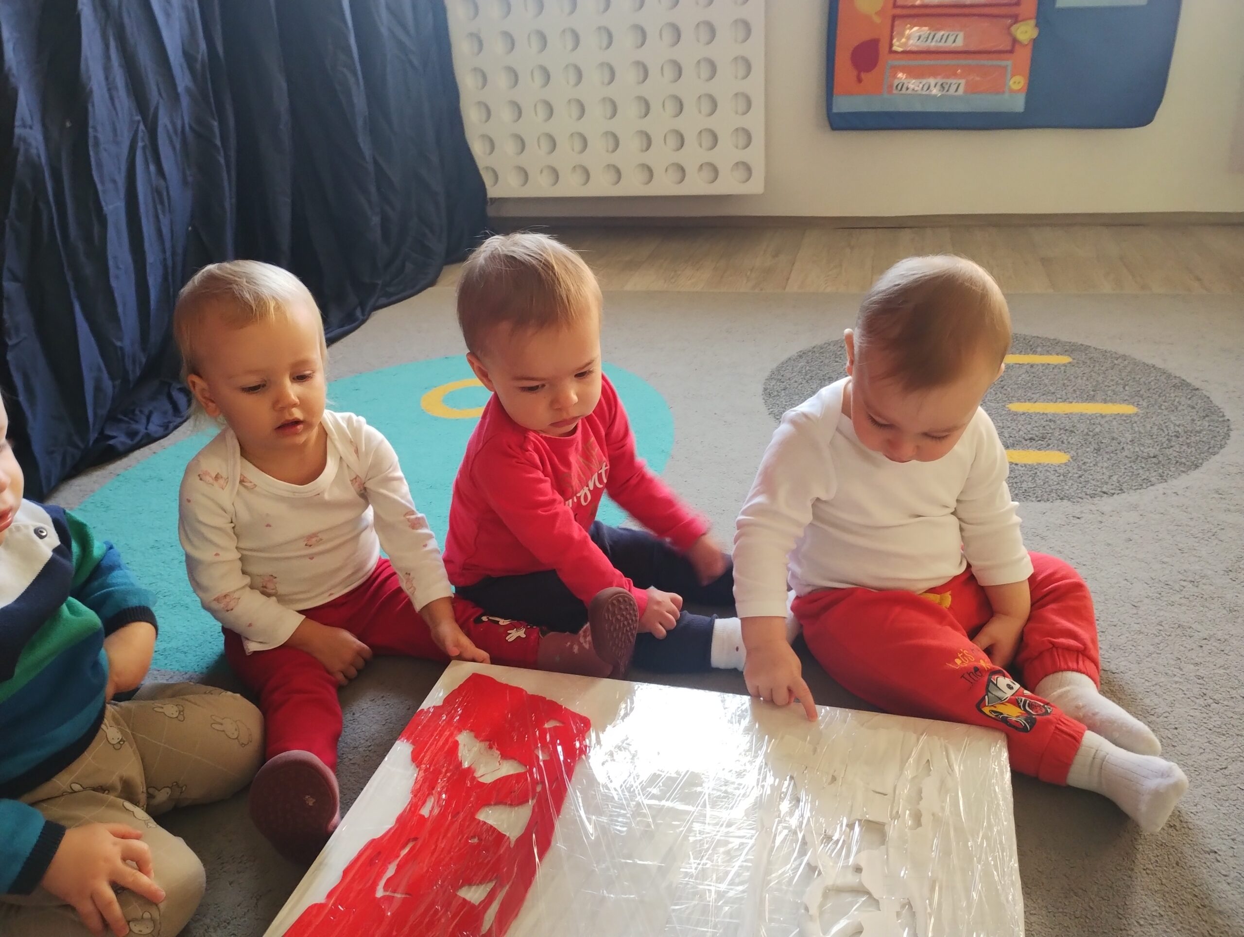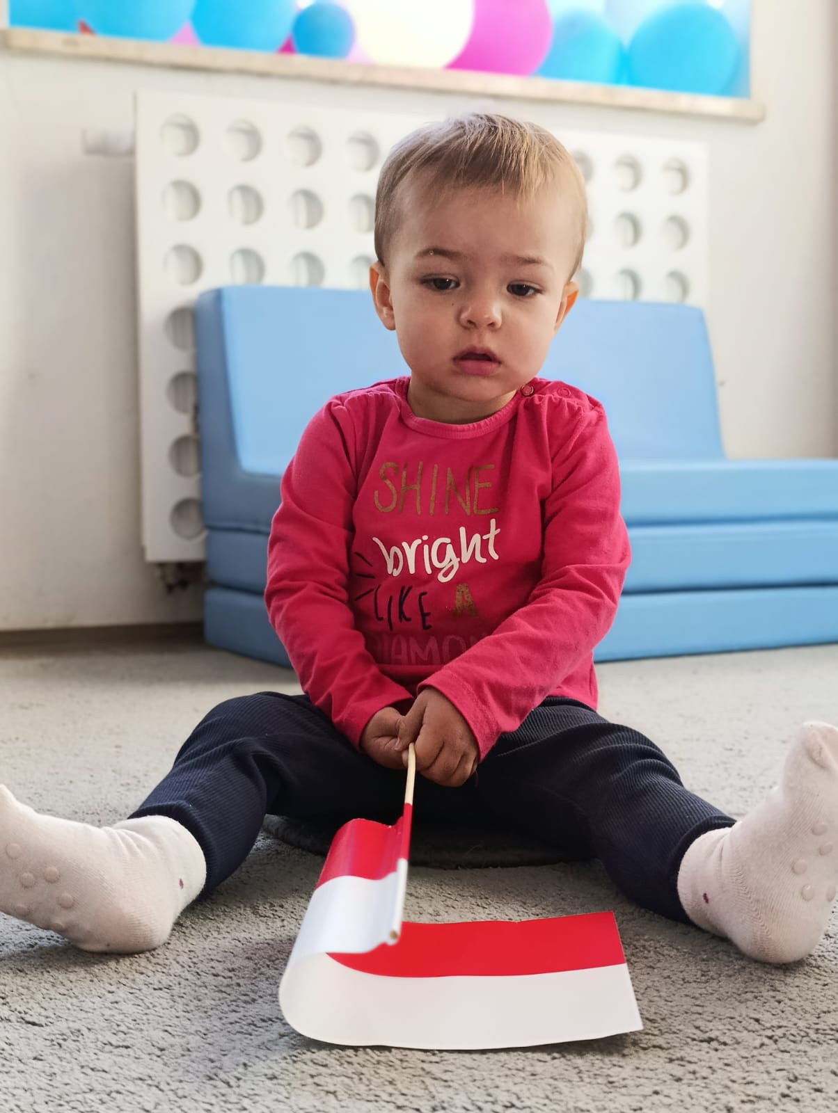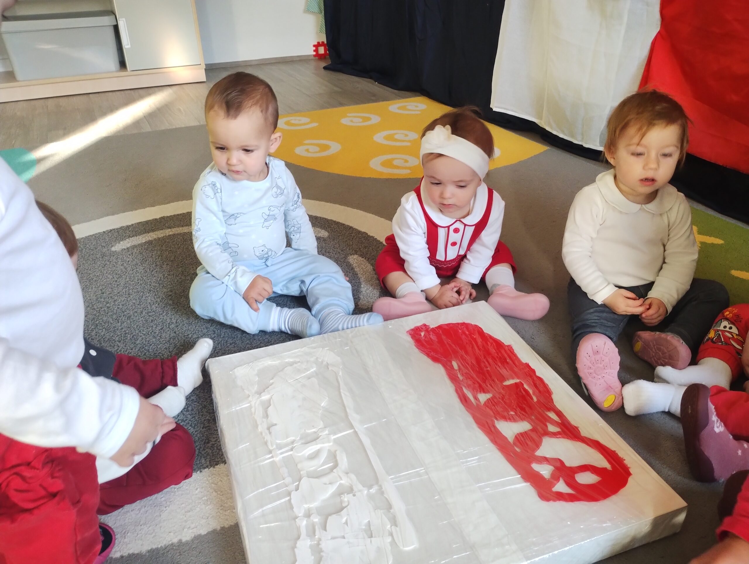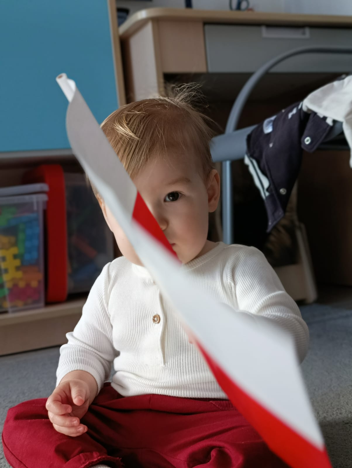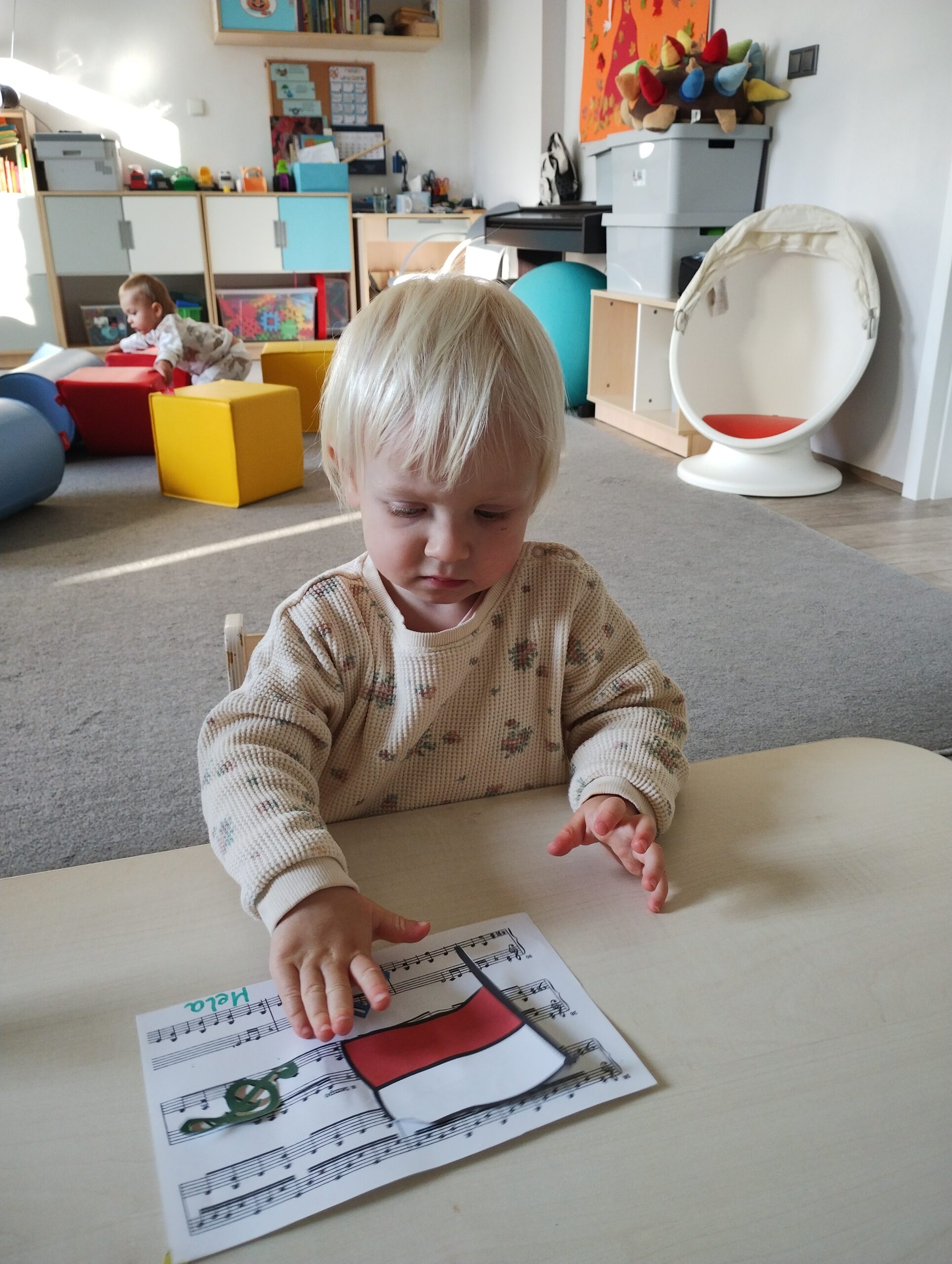 W poprzednim tygodniu dzieci wysłuchały krótkiej rozmowy na temat naszego kraju- Polski. Opowiadały gdzie mieszkają i próbowały nazwać symbole narodowe. Wspólnie obejrzeliśmy ilustracje przedstawiające flagę, godło i mapę Polski. Maluszki dowiedziały się, że flaga ma dwa kolory- biały i czerwony, a na godle znajduje się biały orzeł. Następnie dzieci z powagą wysłuchały fragmentu hymnu narodowego, ucząc się, że podczas jego jego odtwarzania należy zachować postawę szacunku. Podczas zajęć plastycznych wykonaliśmy piękne flagi. Nie zabrakło też zabaw sensorycznych i ćwiczeń motoryki małej.