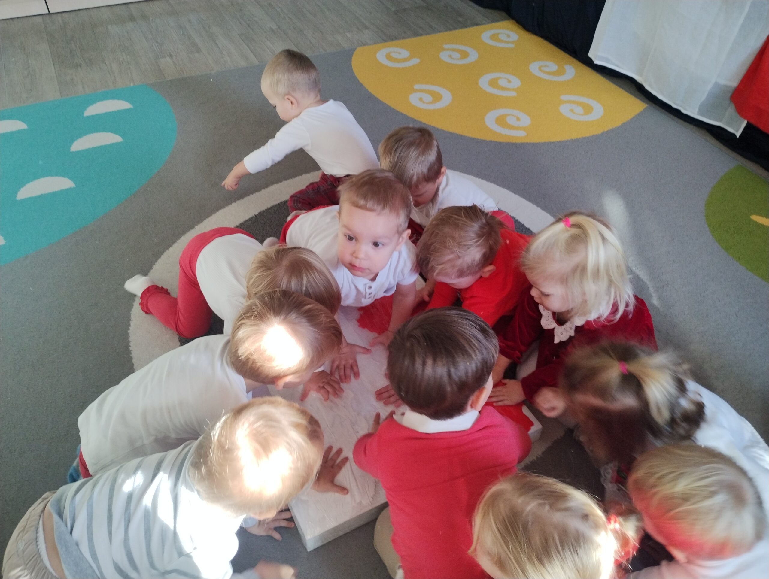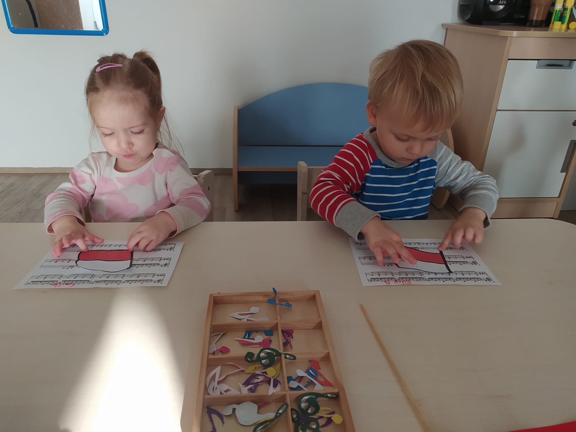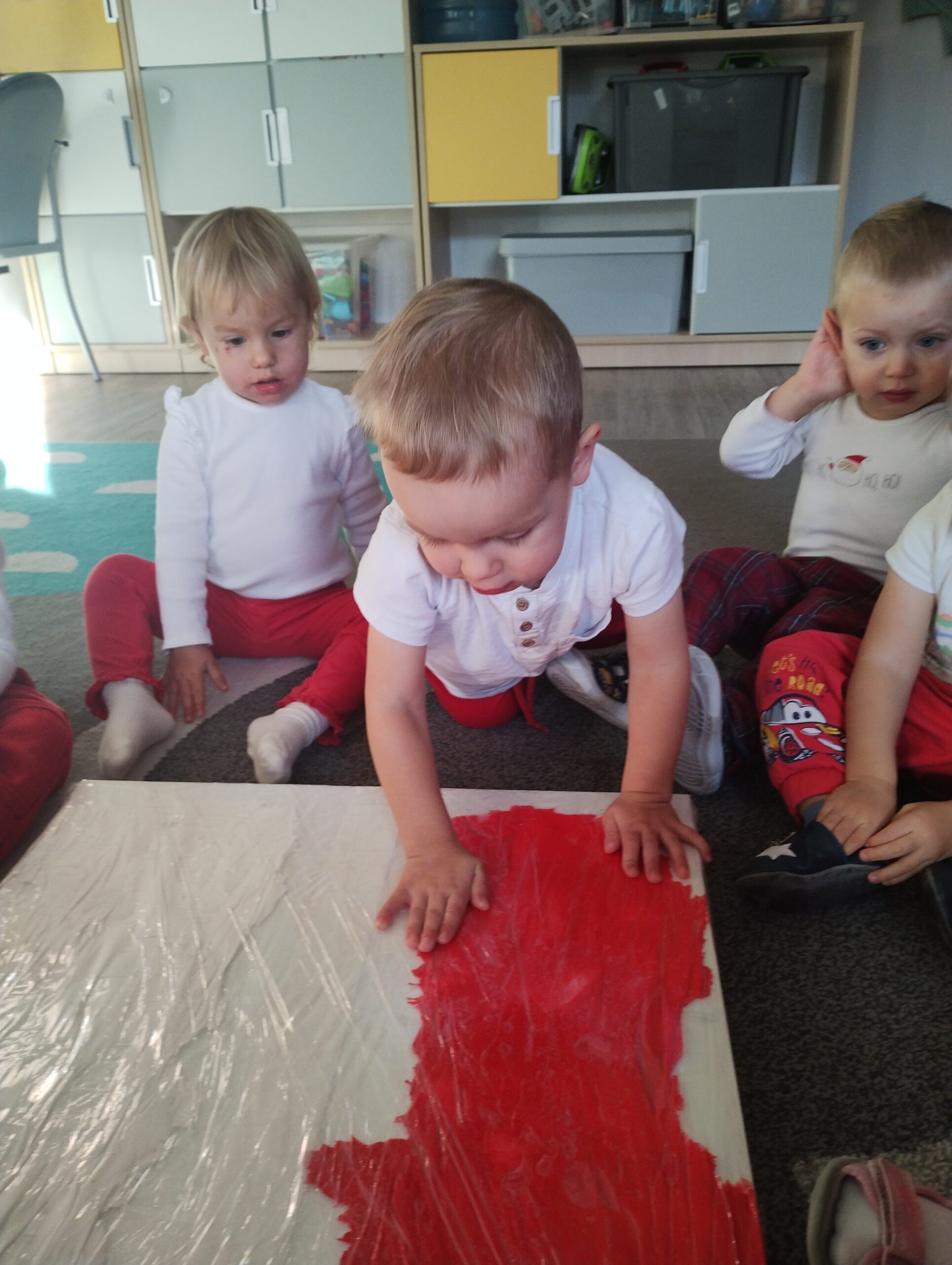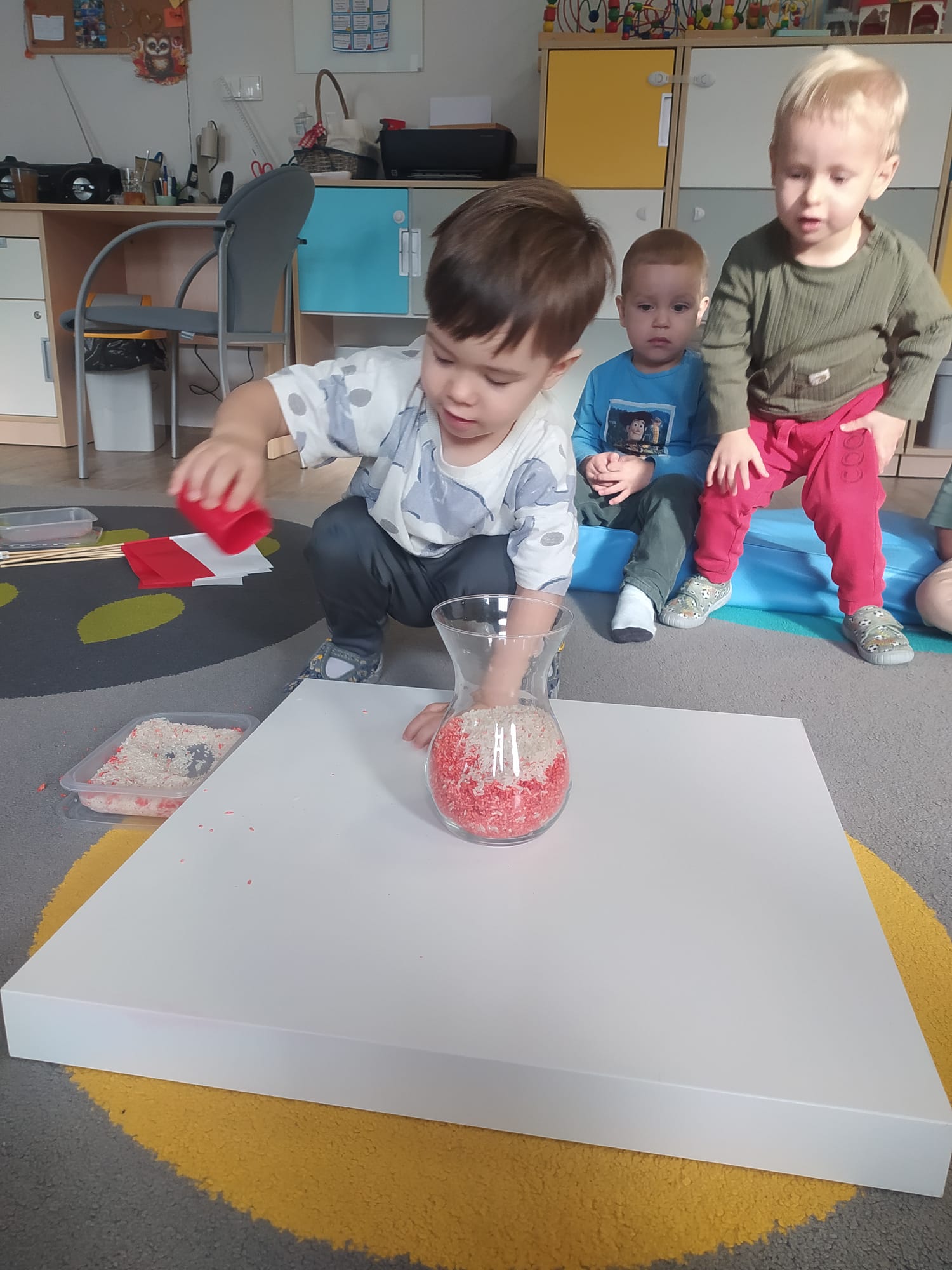 W poprzednim tygodniu dzieci wysłuchały krótkiej rozmowy na temat naszego kraju- Polski. Opowiadały gdzie mieszkają i próbowały nazwać symbole narodowe. Wspólnie obejrzeliśmy ilustracje przedstawiające flagę, godło i mapę Polski. Maluszki dowiedziały się, że flaga ma dwa kolory- biały i czerwony, a na godle znajduje się biały orzeł. Następnie dzieci z powagą wysłuchały fragmentu hymnu narodowego, ucząc się, że podczas jego jego odtwarzania należy zachować postawę szacunku. Podczas zajęć plastycznych wykonaliśmy piękne flagi. Nie zabrakło też zabaw sensorycznych i ćwiczeń motoryki małej.
