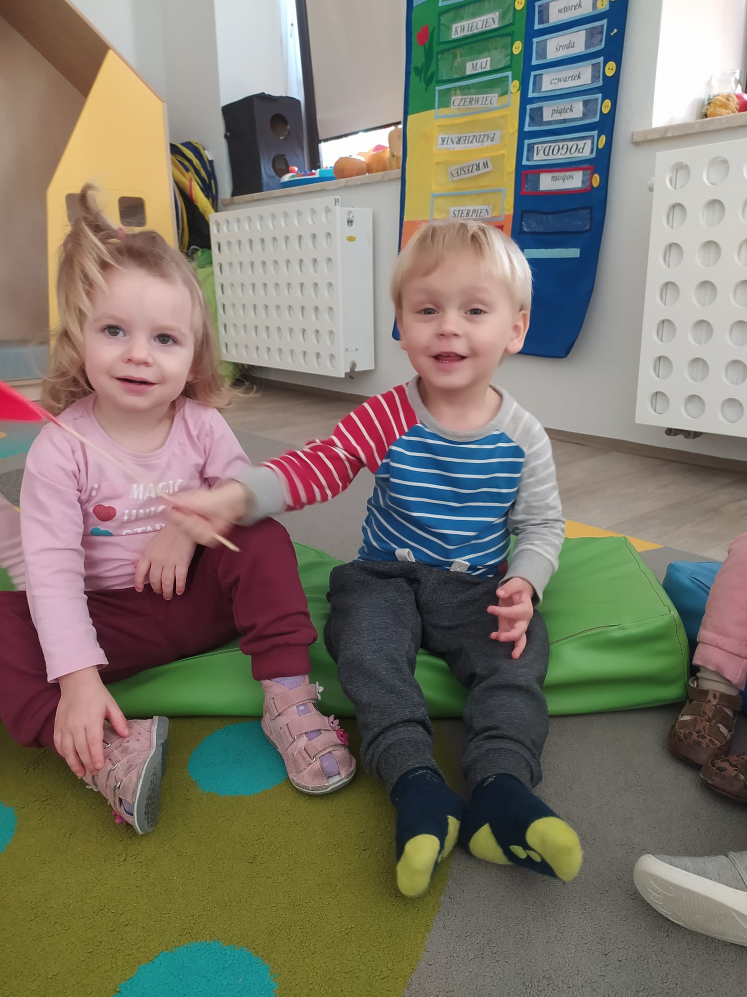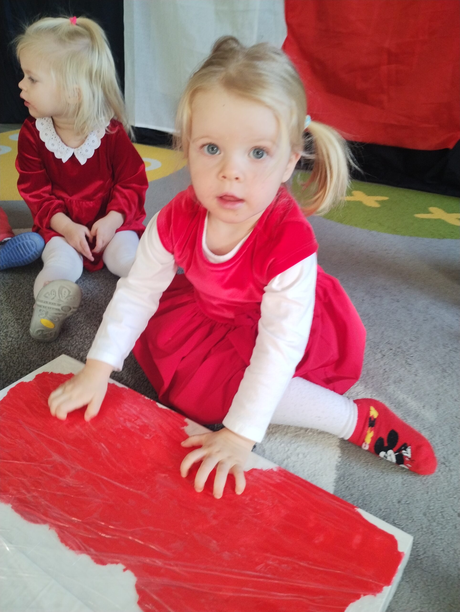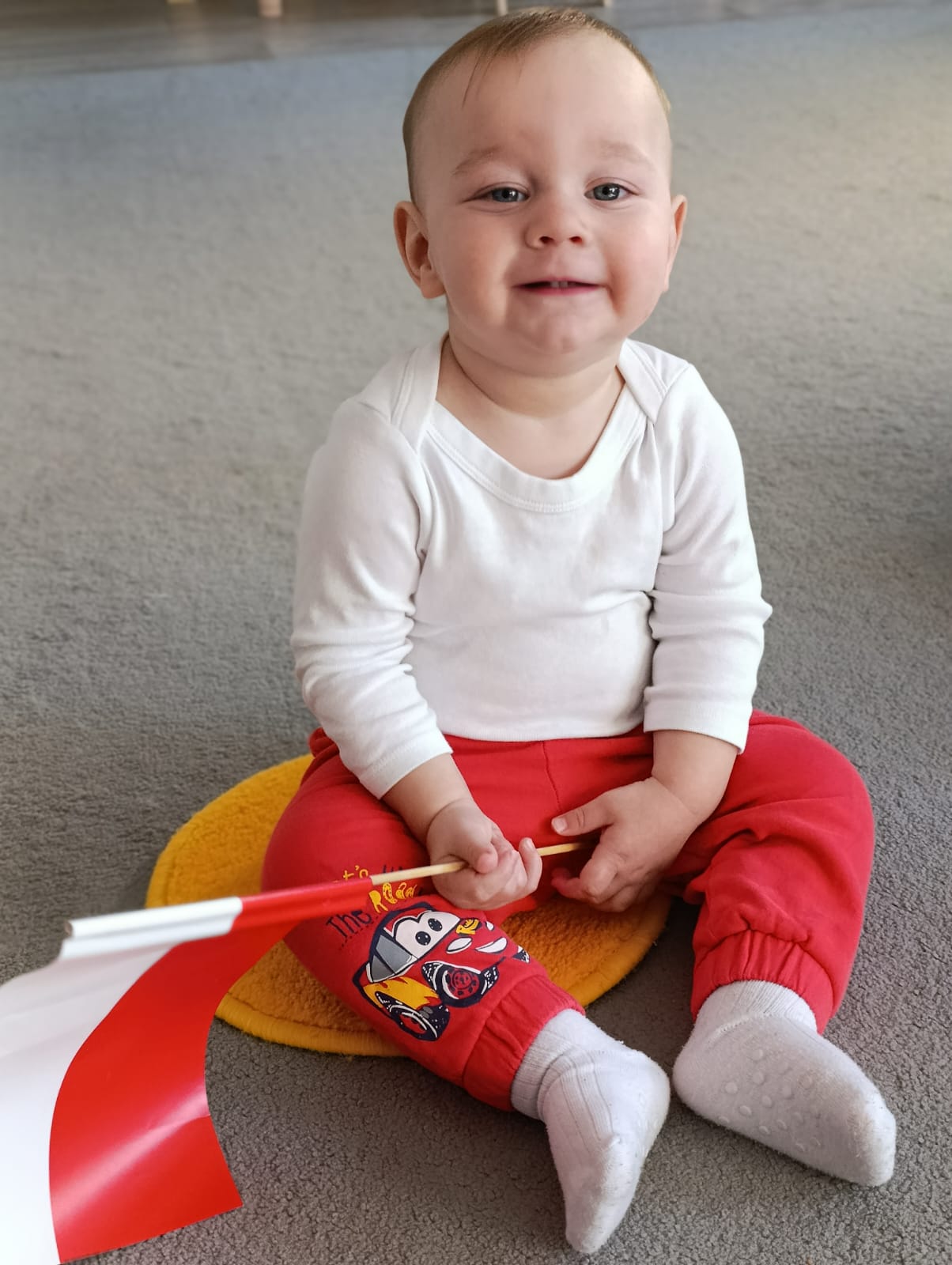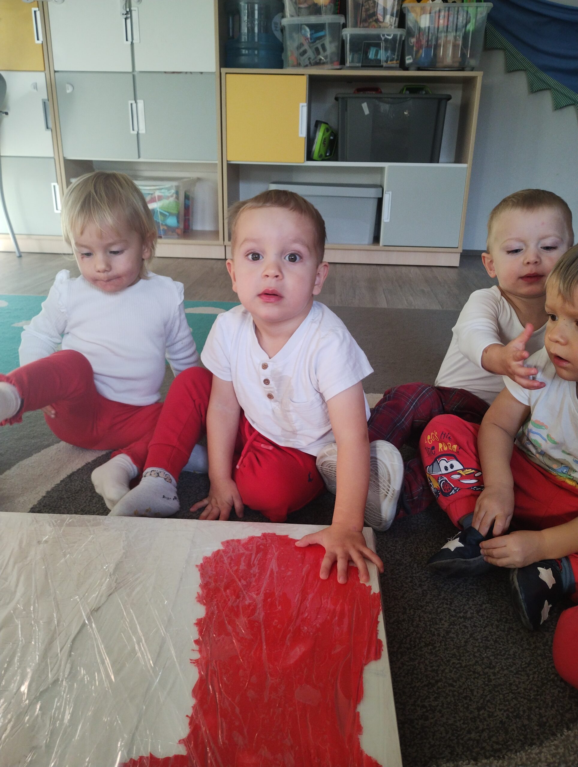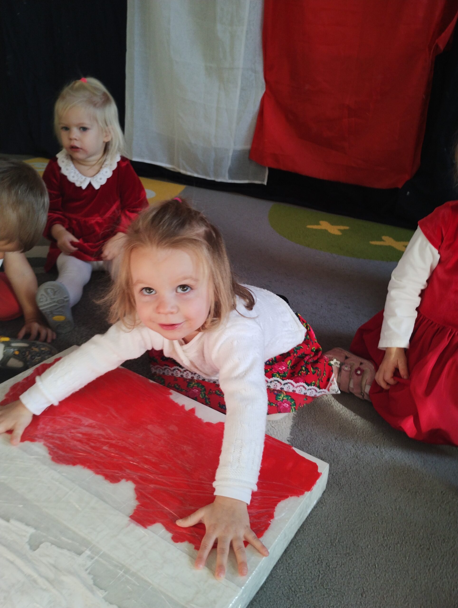 W poprzednim tygodniu dzieci wysłuchały krótkiej rozmowy na temat naszego kraju- Polski. Opowiadały gdzie mieszkają i próbowały nazwać symbole narodowe. Wspólnie obejrzeliśmy ilustracje przedstawiające flagę, godło i mapę Polski. Maluszki dowiedziały się, że flaga ma dwa kolory- biały i czerwony, a na godle znajduje się biały orzeł. Następnie dzieci z powagą wysłuchały fragmentu hymnu narodowego, ucząc się, że podczas jego jego odtwarzania należy zachować postawę szacunku. Podczas zajęć plastycznych wykonaliśmy piękne flagi. Nie zabrakło też zabaw sensorycznych i ćwiczeń motoryki małej.