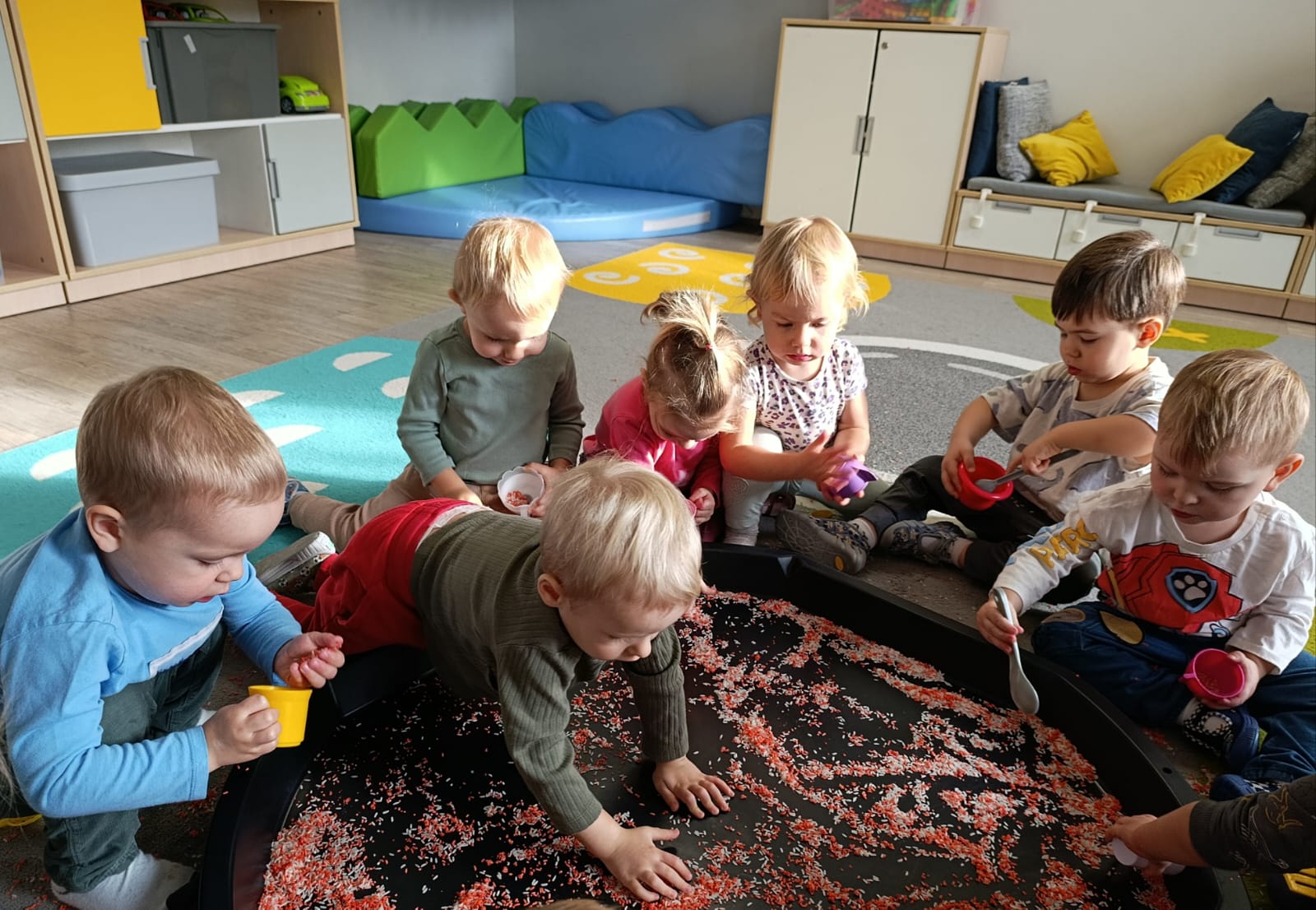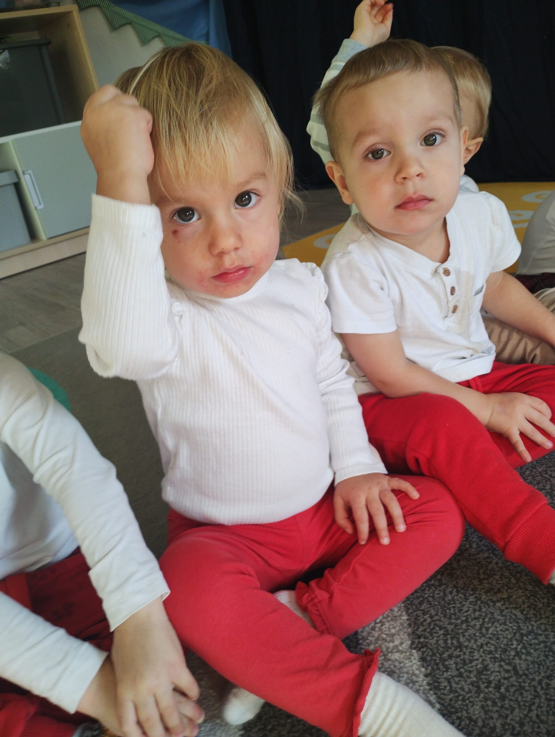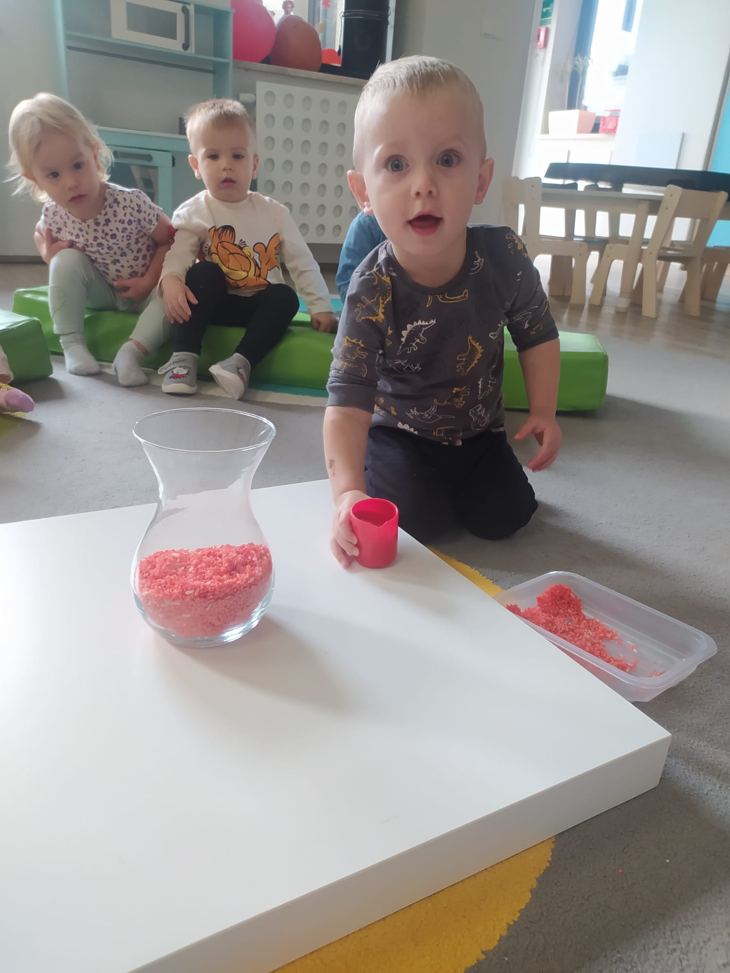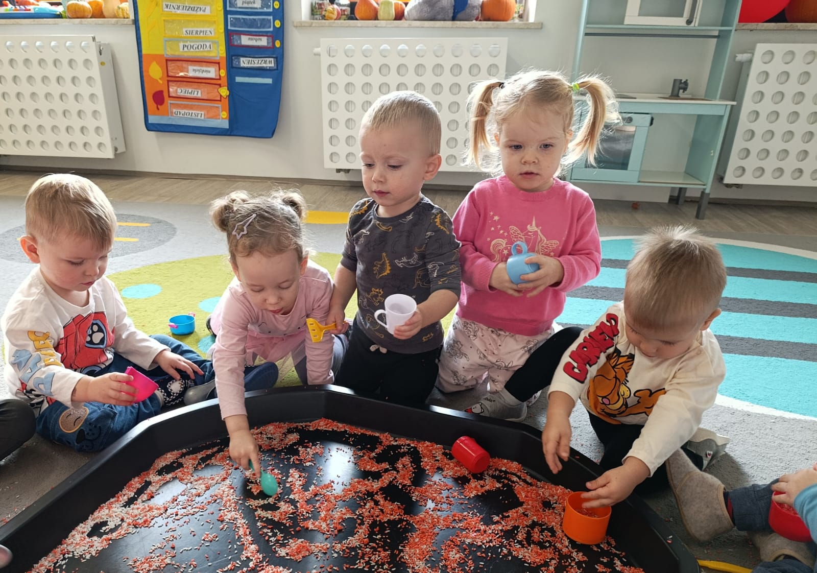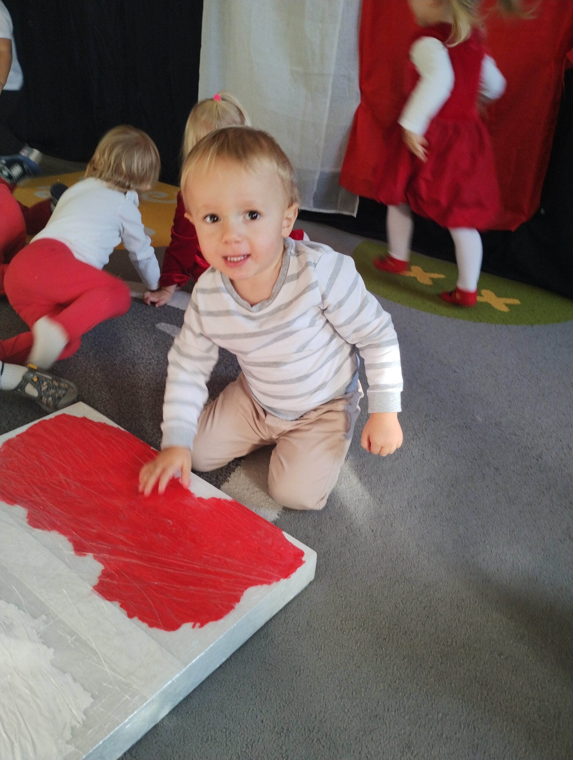 W poprzednim tygodniu dzieci wysłuchały krótkiej rozmowy na temat naszego kraju- Polski. Opowiadały gdzie mieszkają i próbowały nazwać symbole narodowe. Wspólnie obejrzeliśmy ilustracje przedstawiające flagę, godło i mapę Polski. Maluszki dowiedziały się, że flaga ma dwa kolory- biały i czerwony, a na godle znajduje się biały orzeł. Następnie dzieci z powagą wysłuchały fragmentu hymnu narodowego, ucząc się, że podczas jego jego odtwarzania należy zachować postawę szacunku. Podczas zajęć plastycznych wykonaliśmy piękne flagi. Nie zabrakło też zabaw sensorycznych i ćwiczeń motoryki małej.