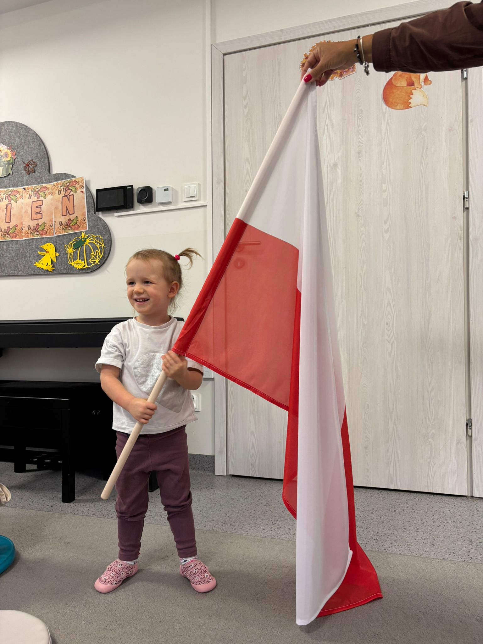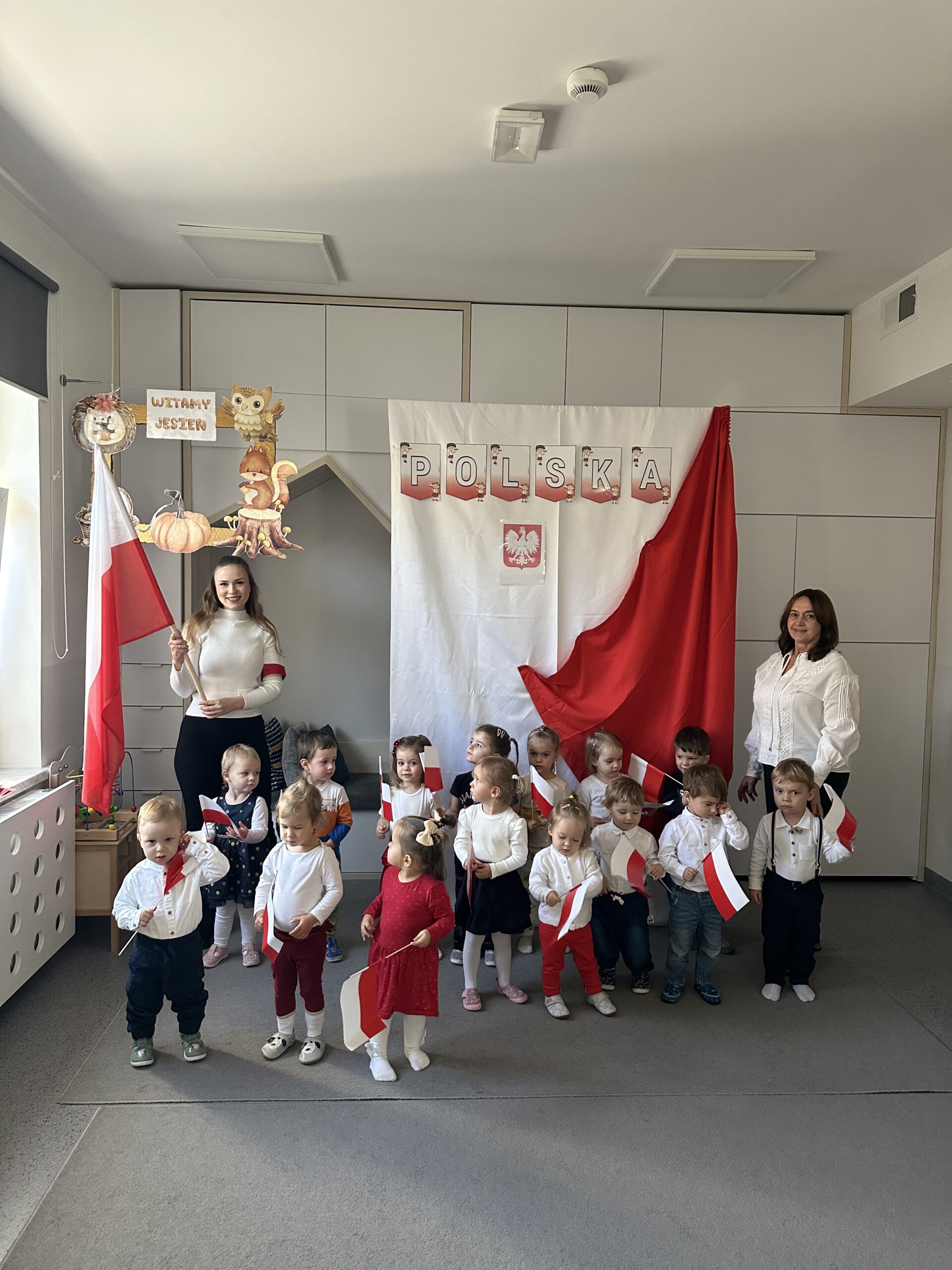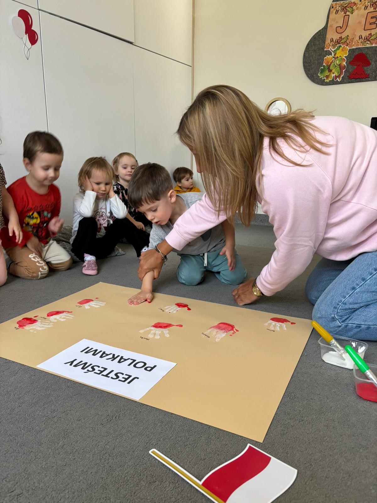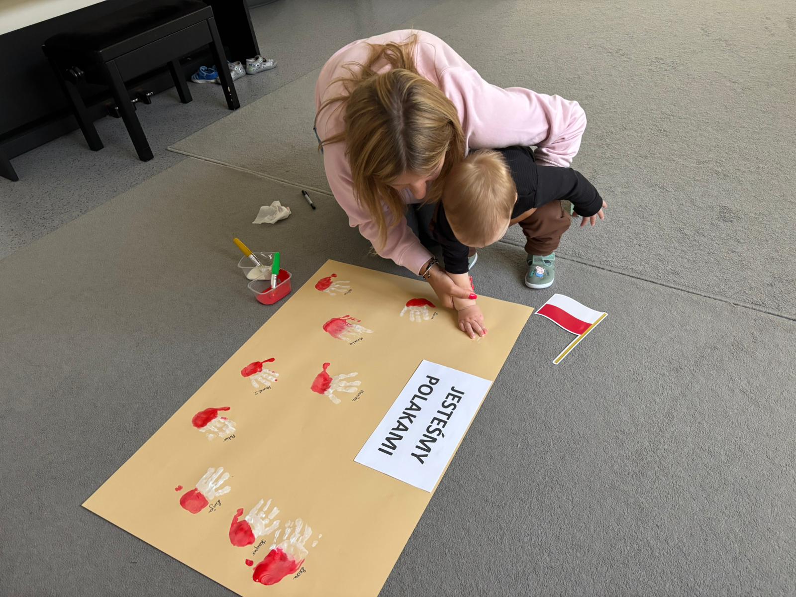 Na zajęciach plastycznych każdy z nas odbił swoją rączkę w barwach narodowych, tworząc piękną, patriotyczną pamiątkę. W czwartek, odświętnie ubrani, wspólnie i z dumą wysłuchaliśmy hymnu Polski. Ten dzień przeżywaliśmy z uśmiechem na twarzy i sercem pełnym radości – jak prawdziwi patrioci!