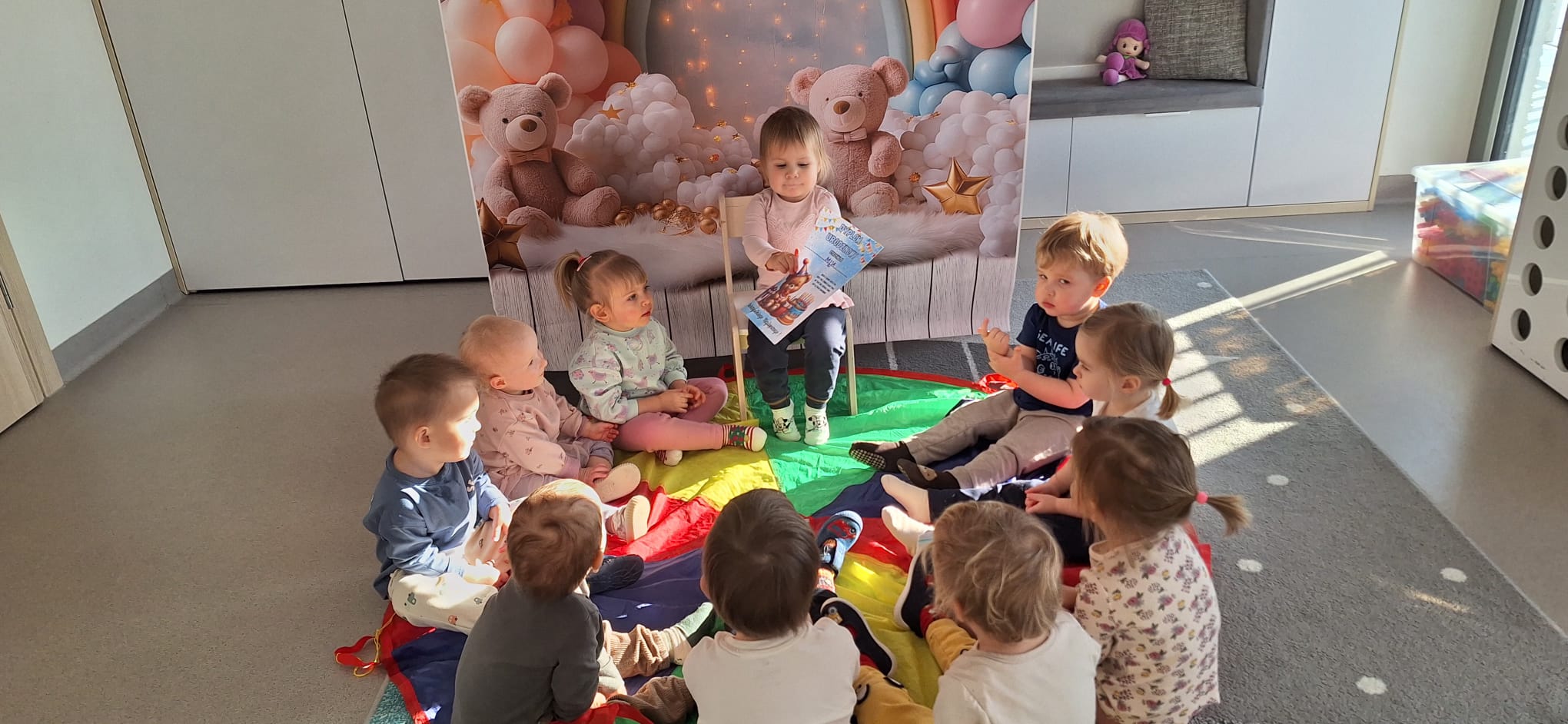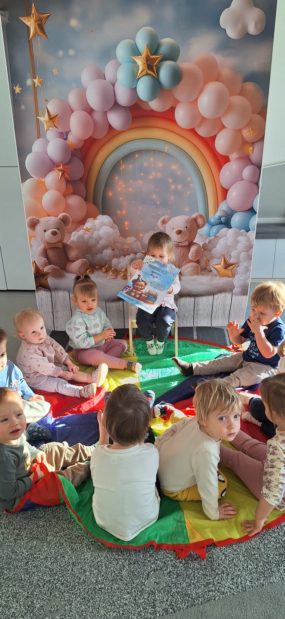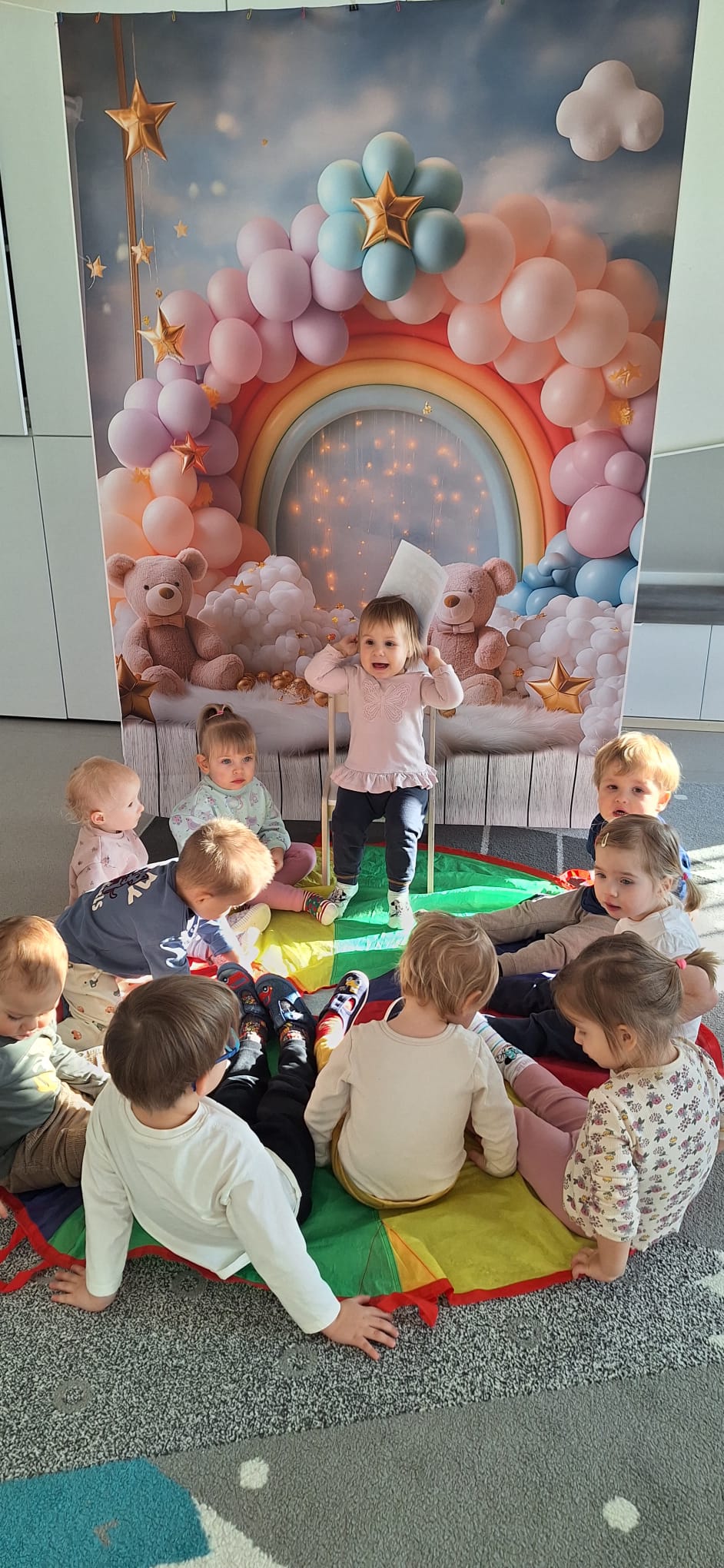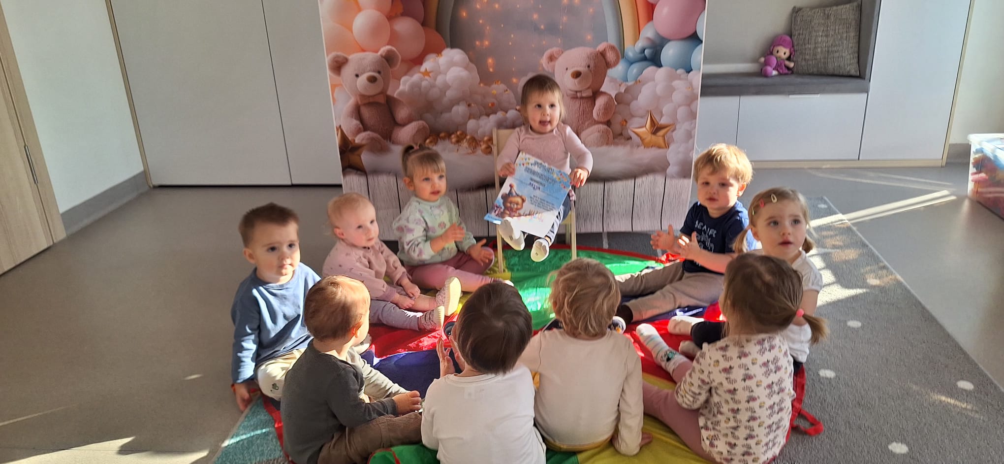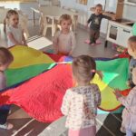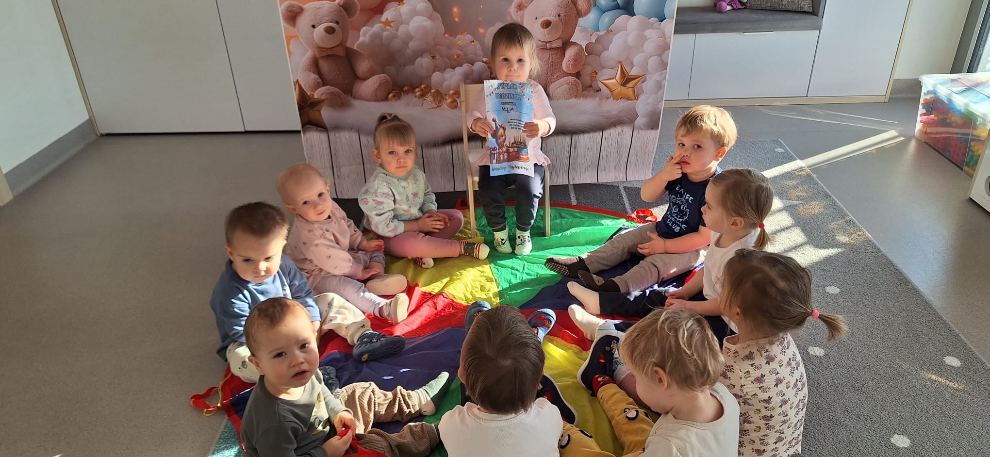 To był dzień pełen wspólnej zabawy. Kolorowa chusta poszła w ruch! 🌈 Falowaliśmy, podrzucaliśmy balonik 🎈 i świetnie się bawiliśmy, dbając o to, by Jubilatka czuła się naprawdę wyjątkowo ✨.