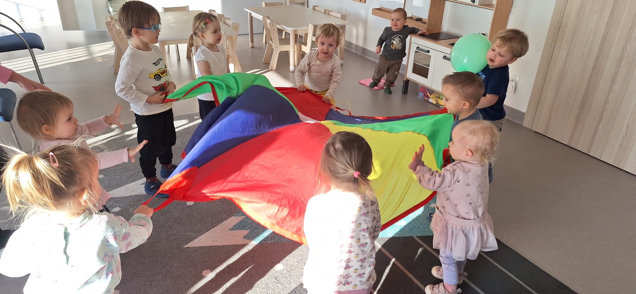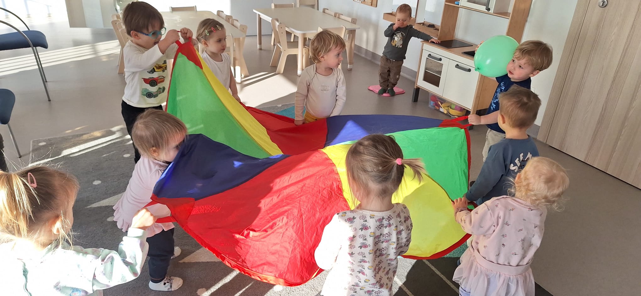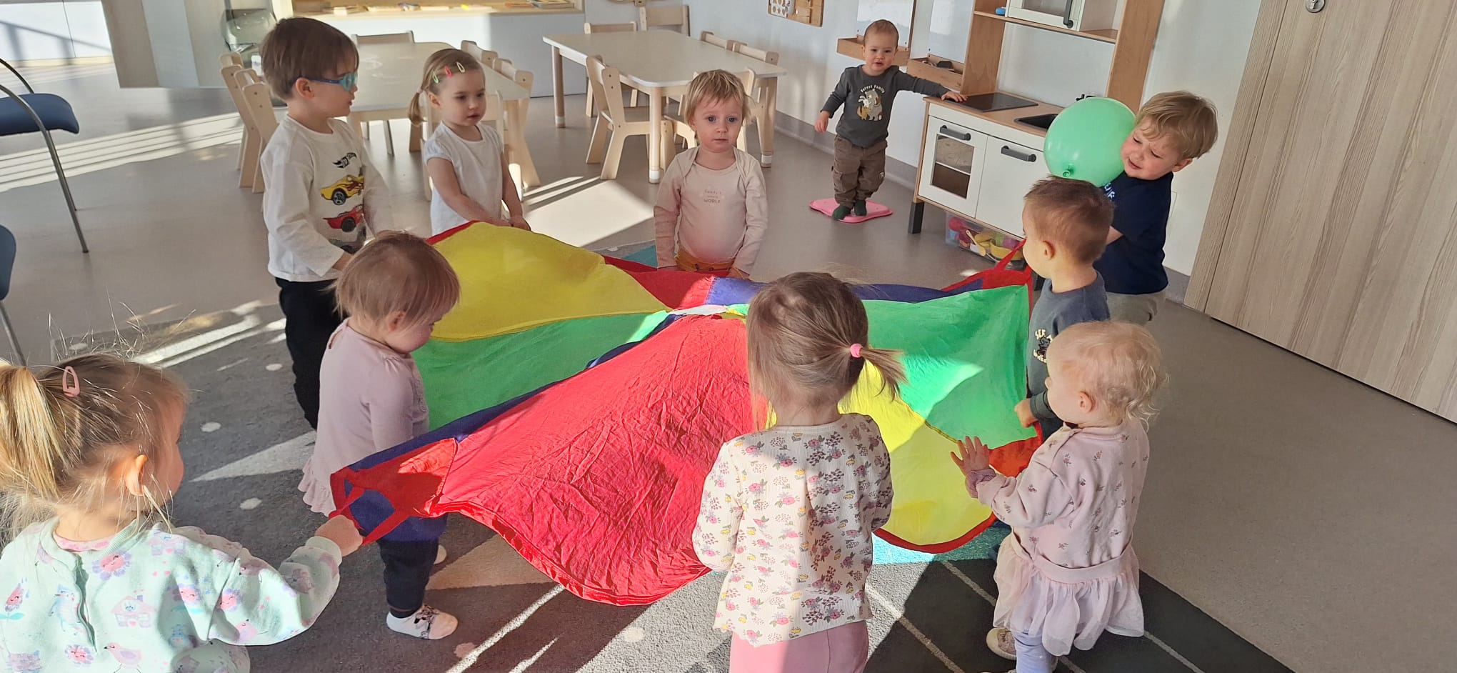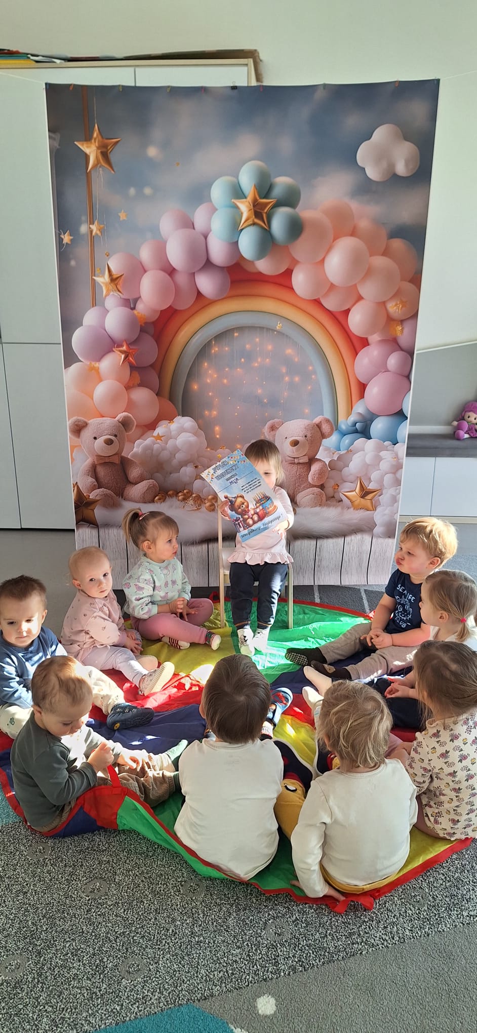 To był dzień pełen wspólnej zabawy. Kolorowa chusta poszła w ruch! 🌈 Falowaliśmy, podrzucaliśmy balonik 🎈 i świetnie się bawiliśmy, dbając o to, by Jubilatka czuła się naprawdę wyjątkowo ✨.