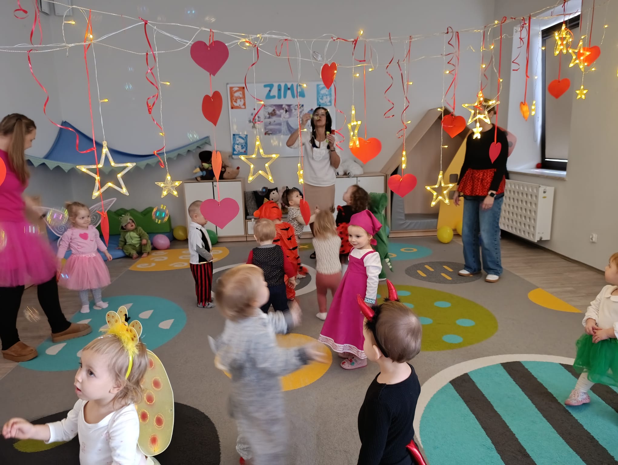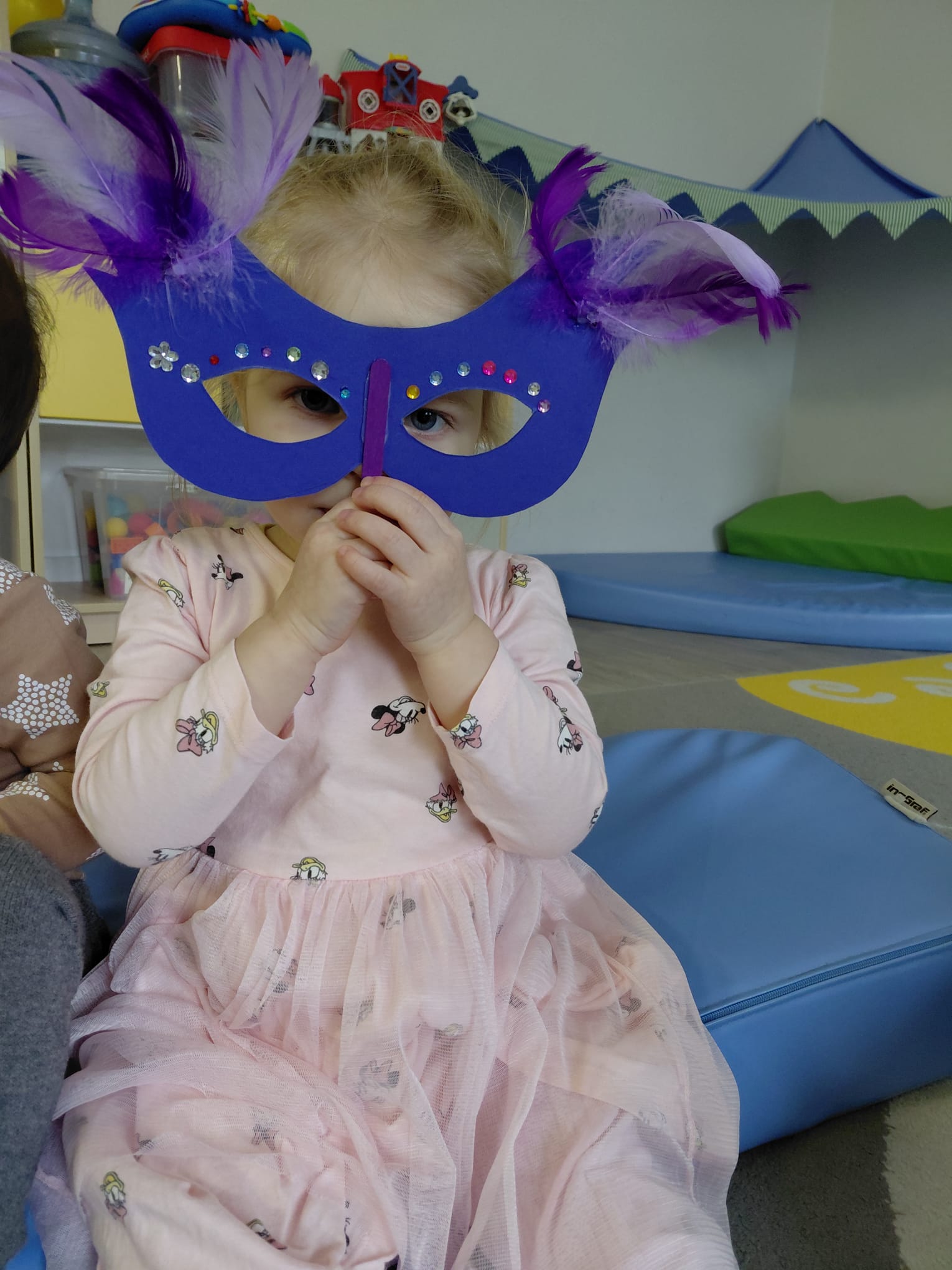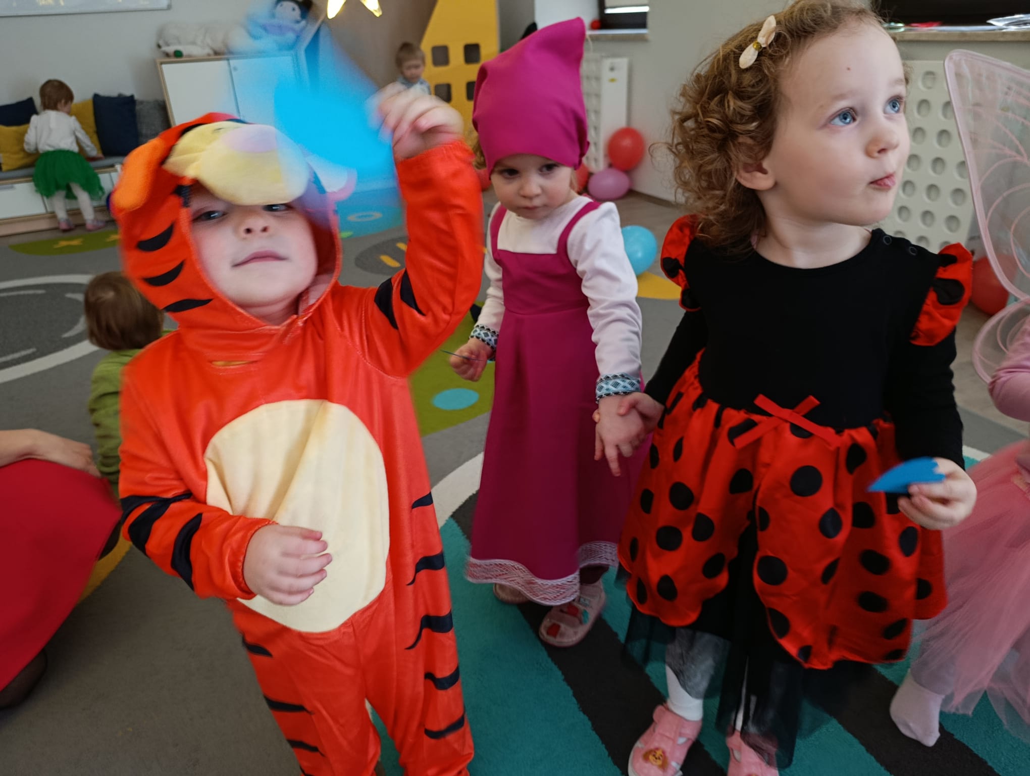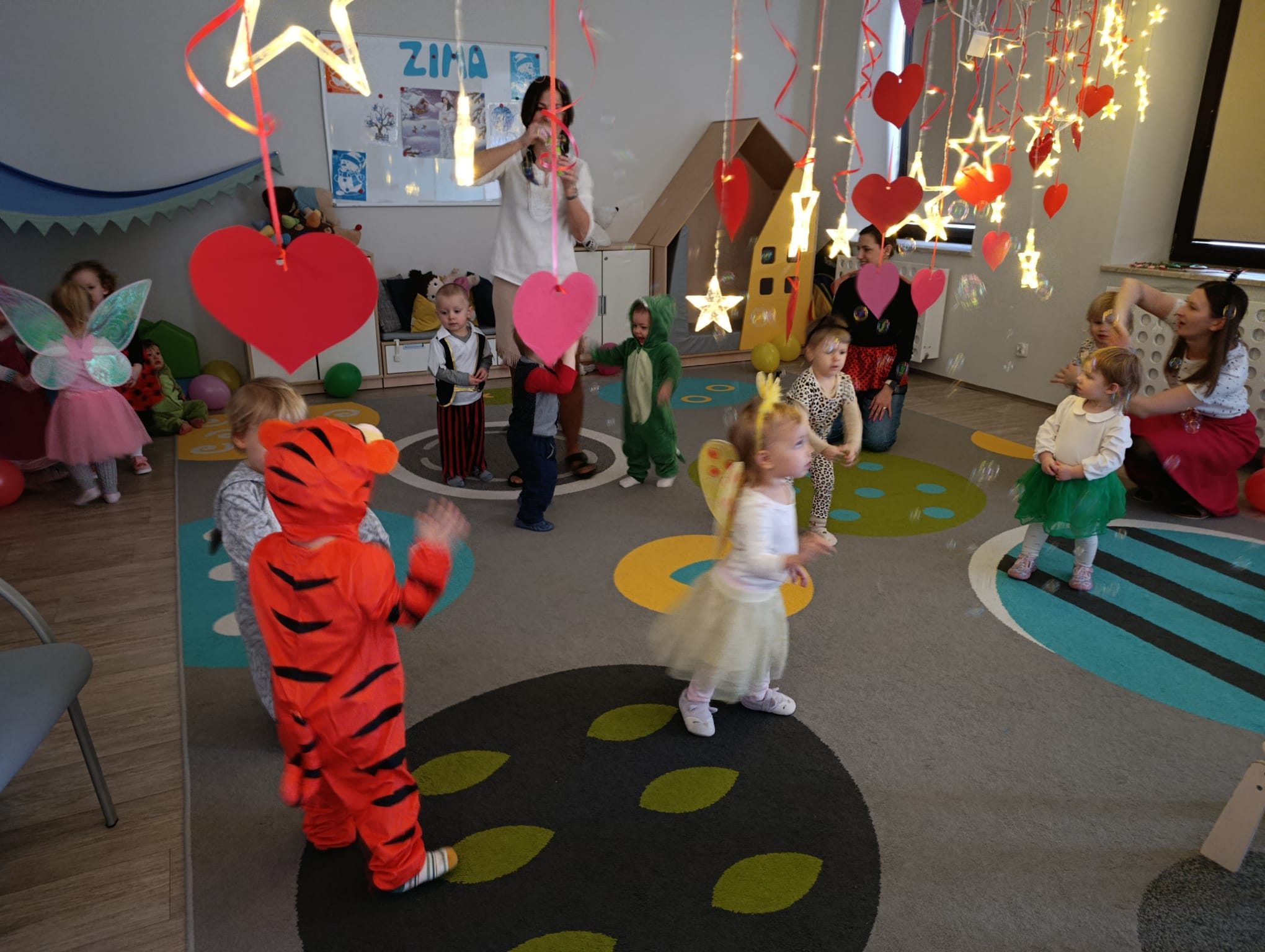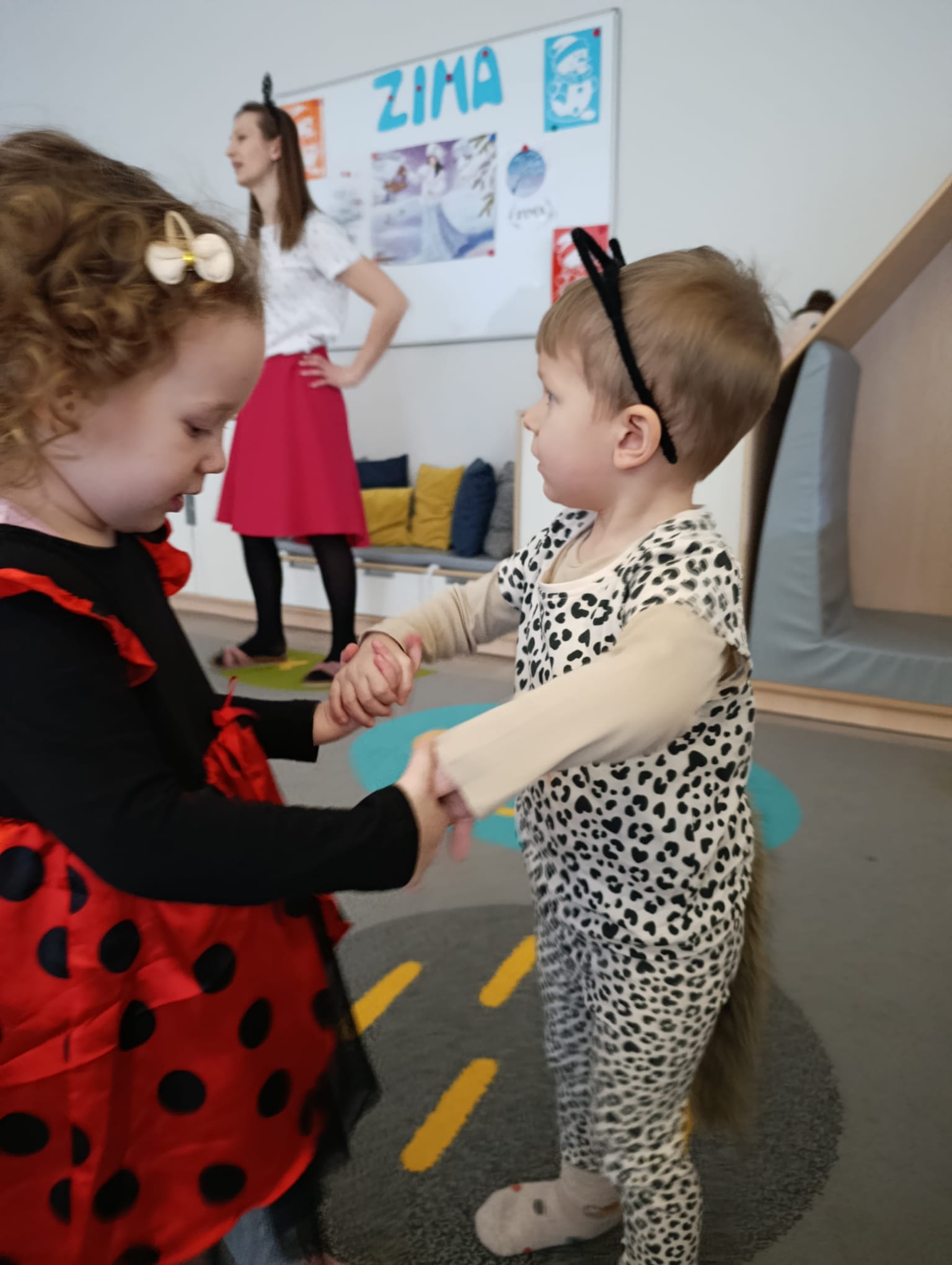 Podczas zajęć dzieci poznały atmosferę balu karnawałowego poprzez taniec, muzykę i zabawy ruchowe dostosowane do ich wieku i możliwości rozwojowych.