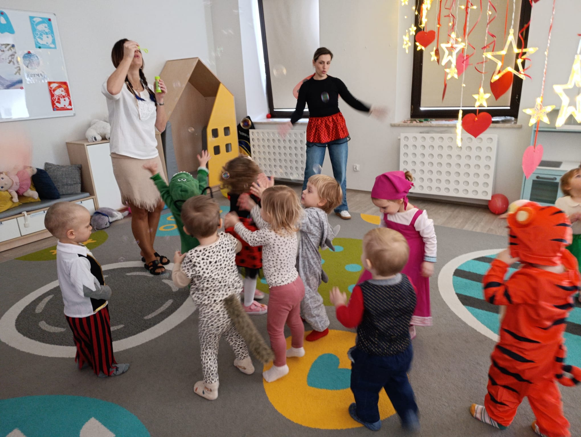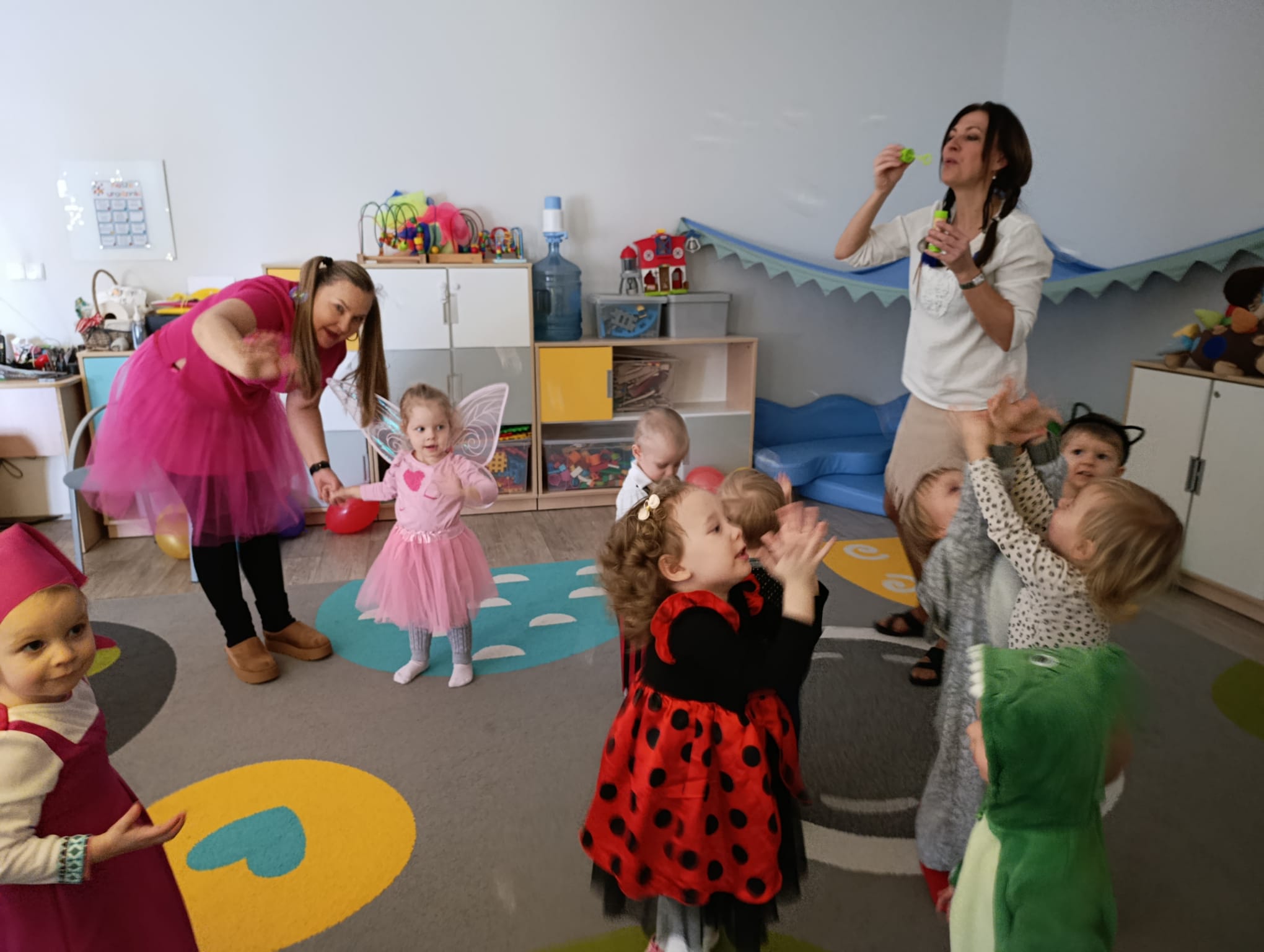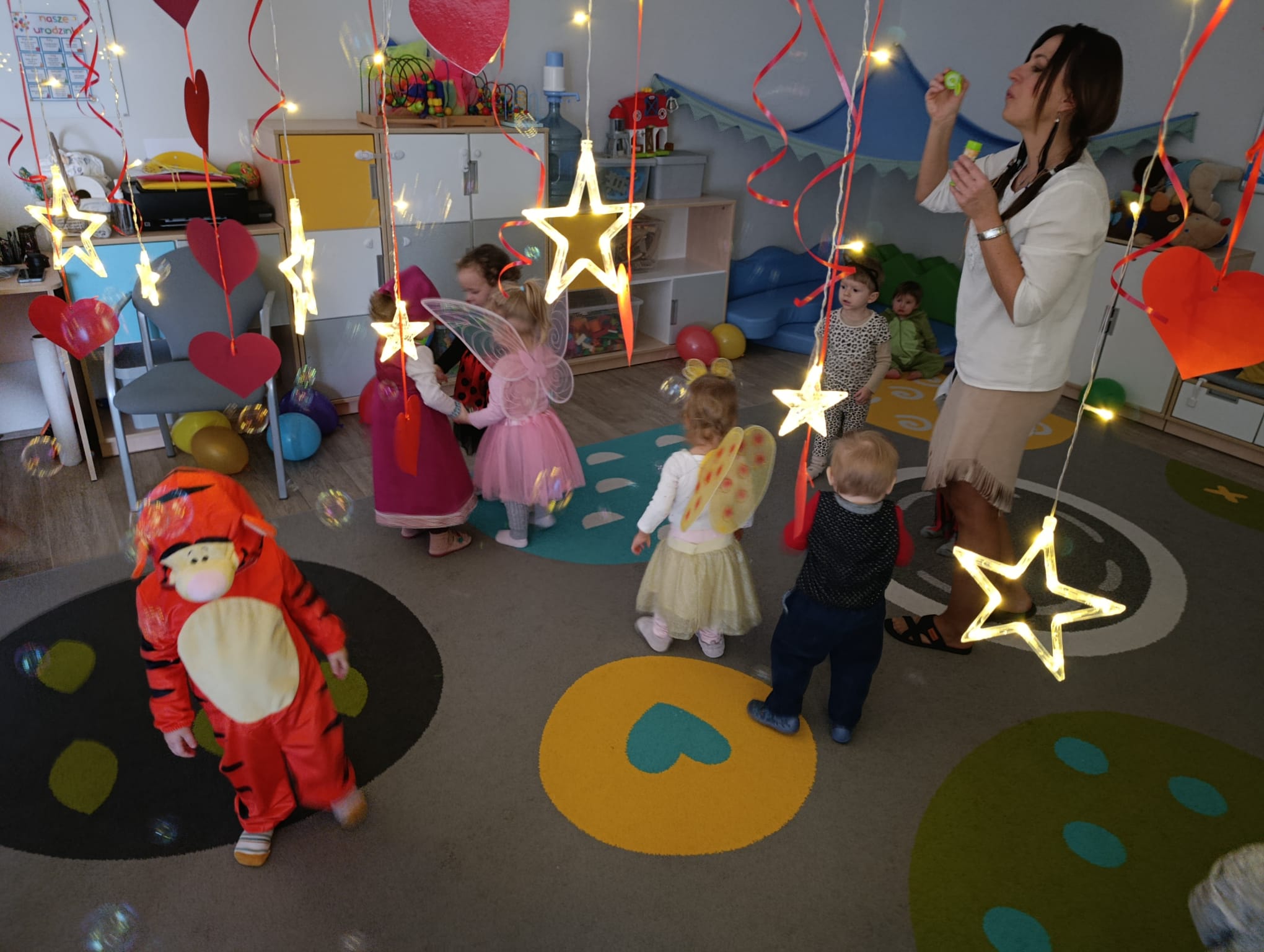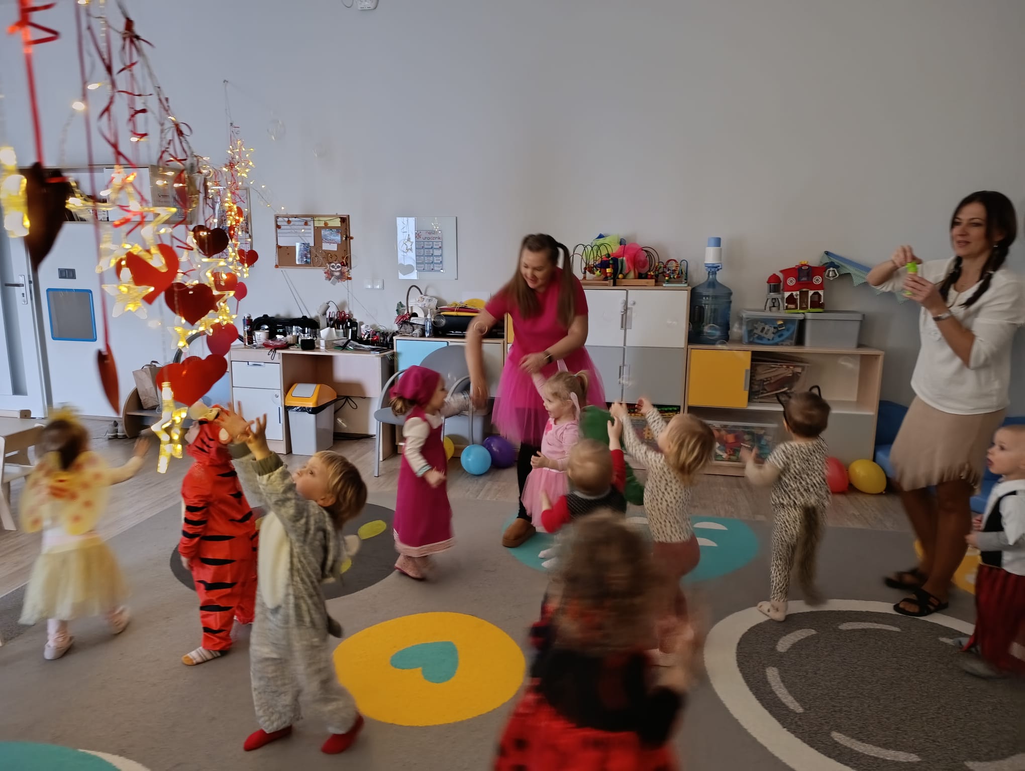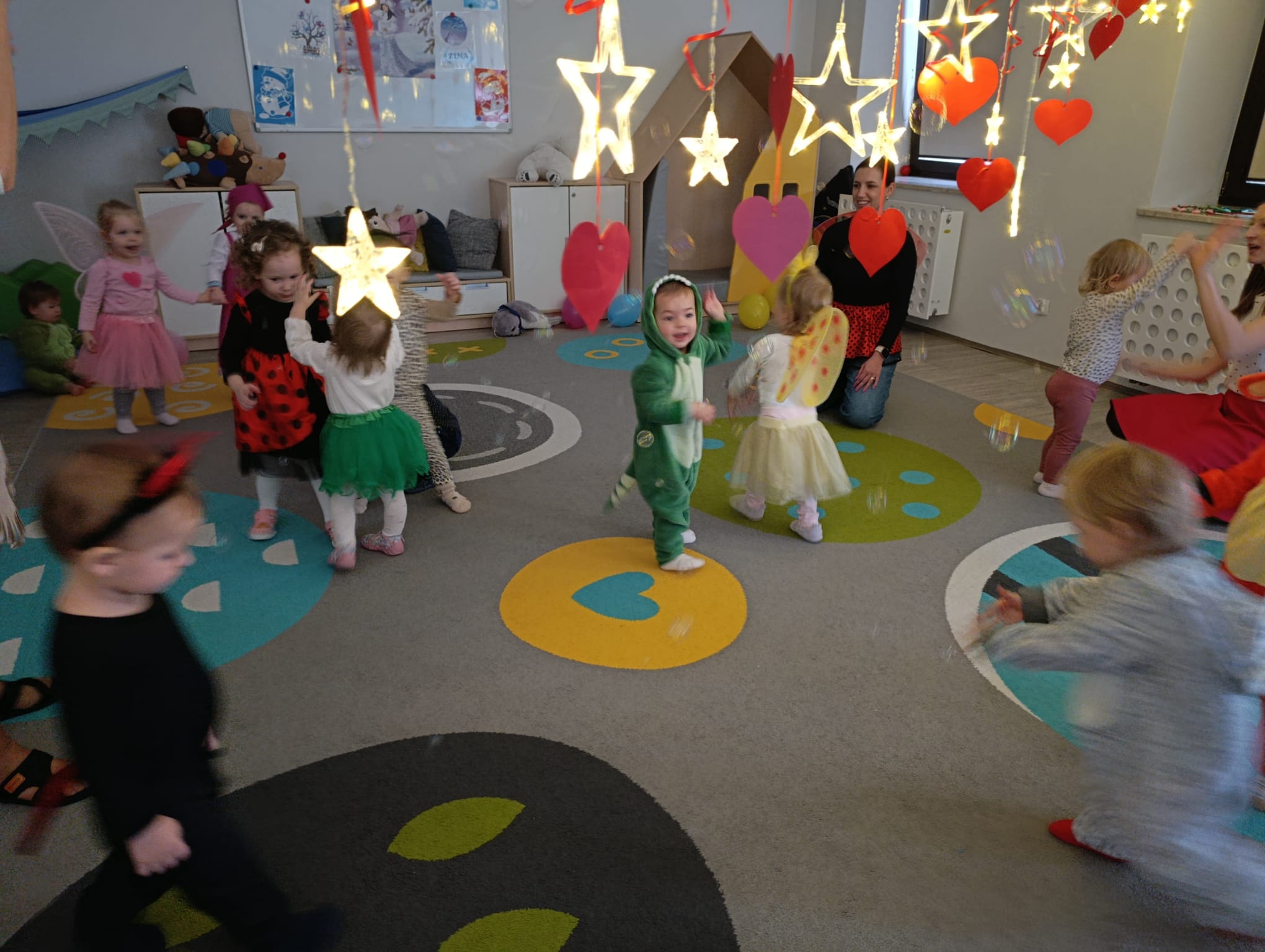 Podczas zajęć dzieci poznały atmosferę balu karnawałowego poprzez taniec, muzykę i zabawy ruchowe dostosowane do ich wieku i możliwości rozwojowych.