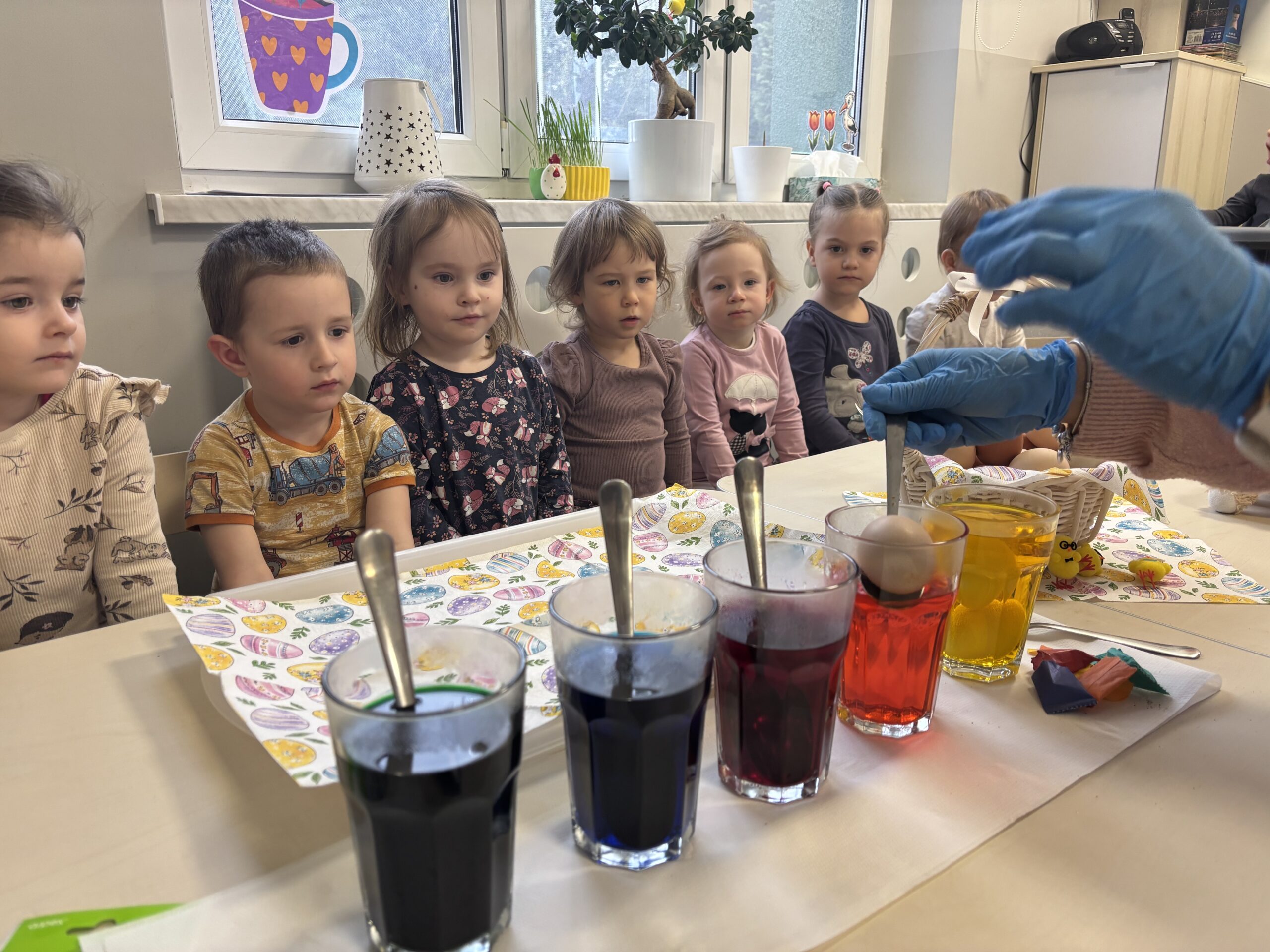 Farbowaliśmy jajka na różne kolory, używając barwnych barwników – efekt był naprawdę zachwycający! Wspaniale się przy tym bawiliśmy, obserwując, jak zwykłe jajka zmieniają się w małe dzieła sztuki. Każdy z nas zabrał później do domu swoje wyjątkowe, kolorowe jajeczko.