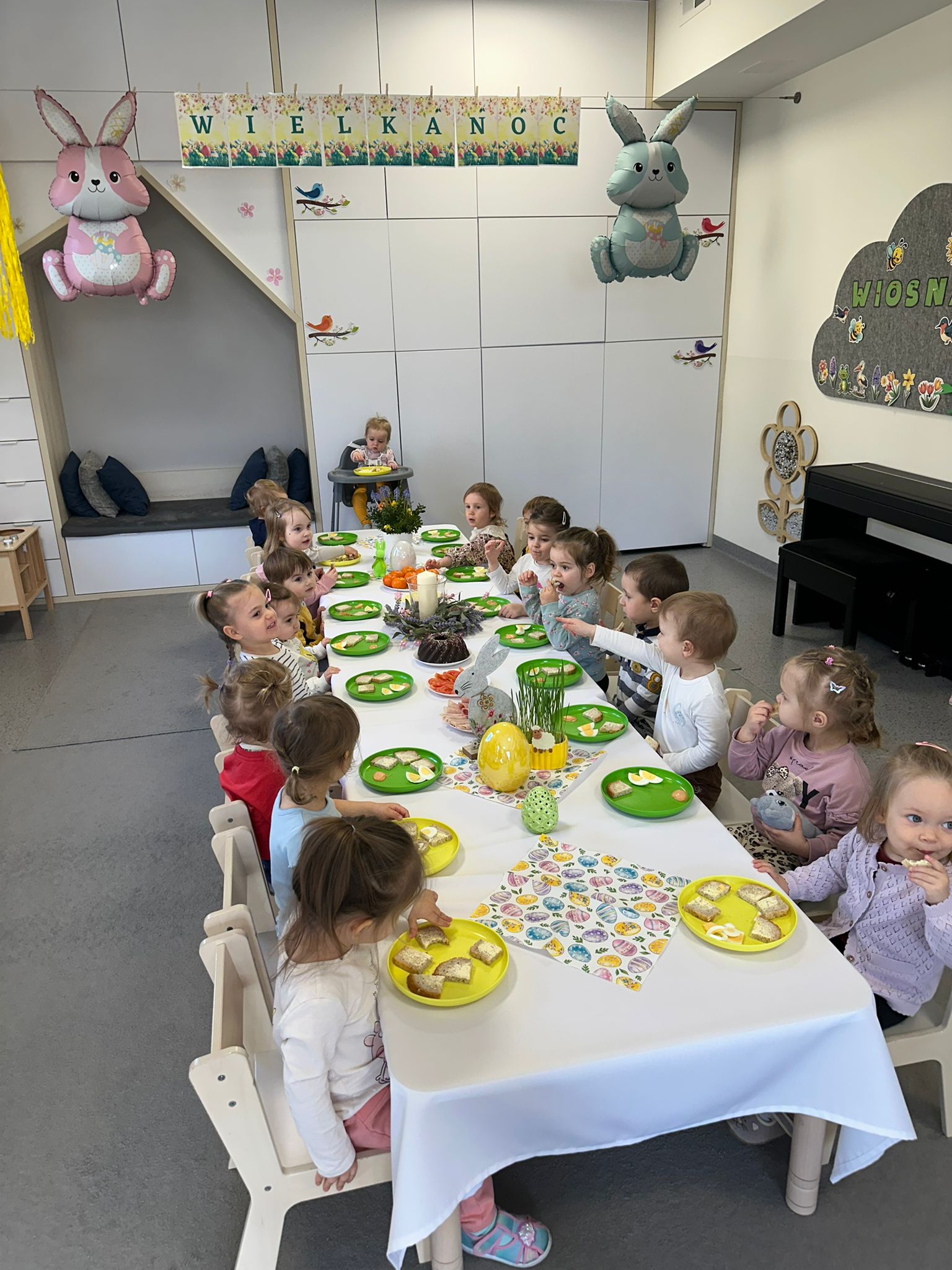 W środę odbyło się w naszym klubiku wielkanocne śniadanko. Zjedliśmy je wspólnie przy pięknie udekorowanym stole, który wprowadzał nas w prawdziwie świąteczny nastrój. Wszystko było przepyszne i pełne radości!